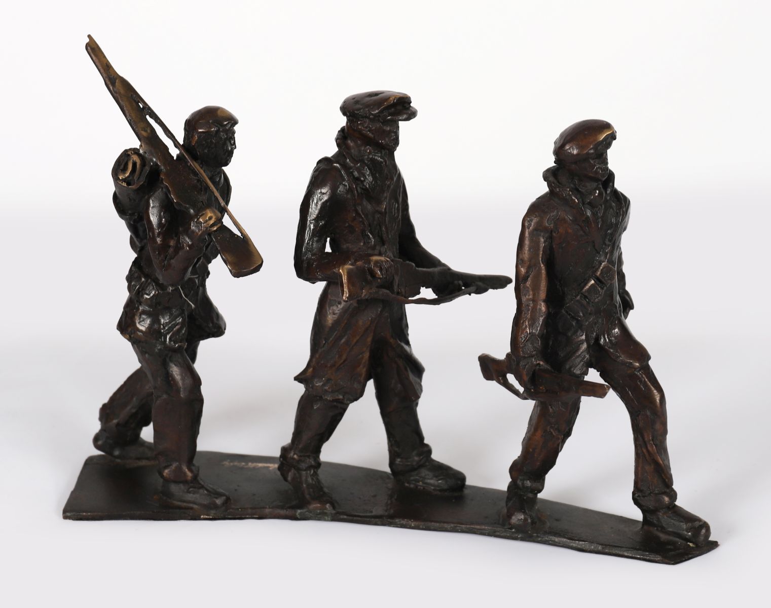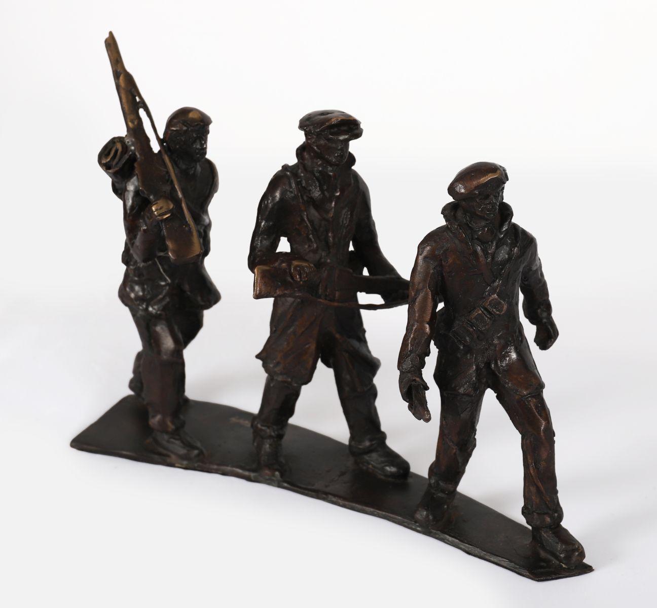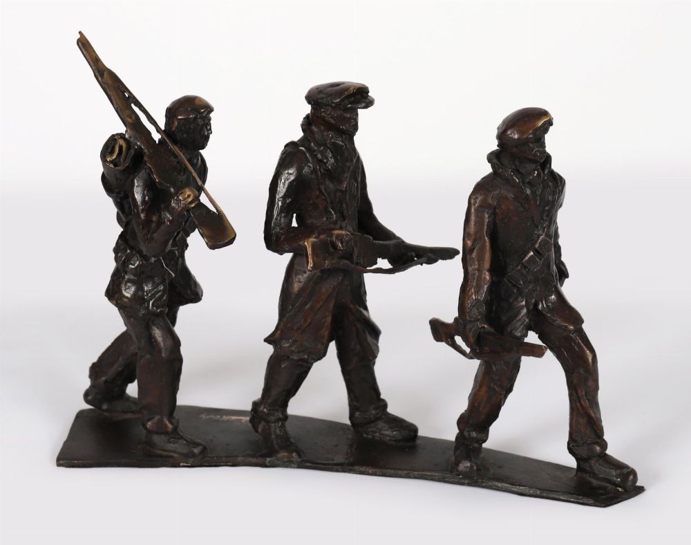 A bronze group sculpture by Jarlath Daly titled The Flying Column, depicting four armed Irish Republican fighters advancing in formation. Richly detailed and dynamically modelled. Signed by the artist.