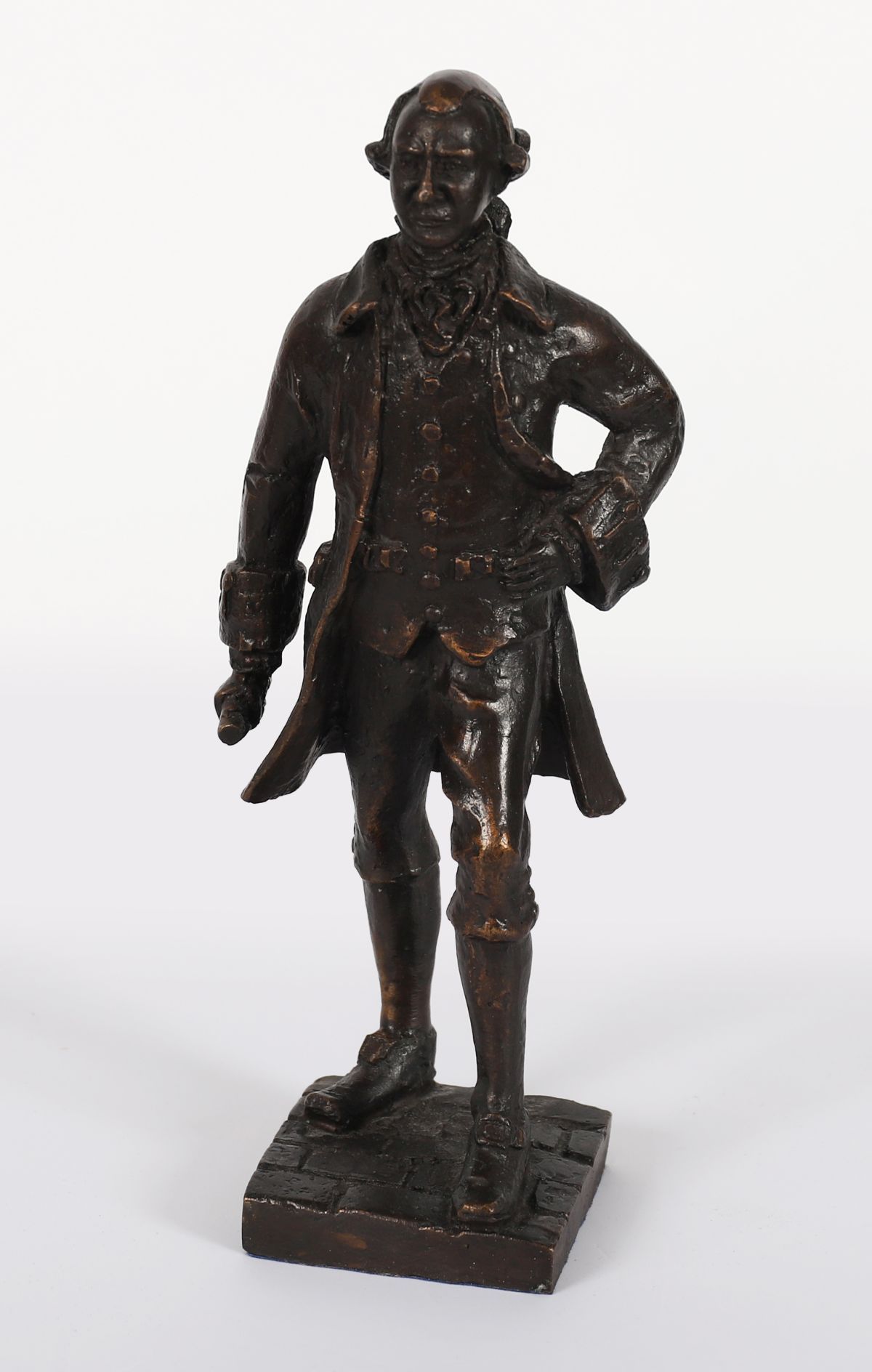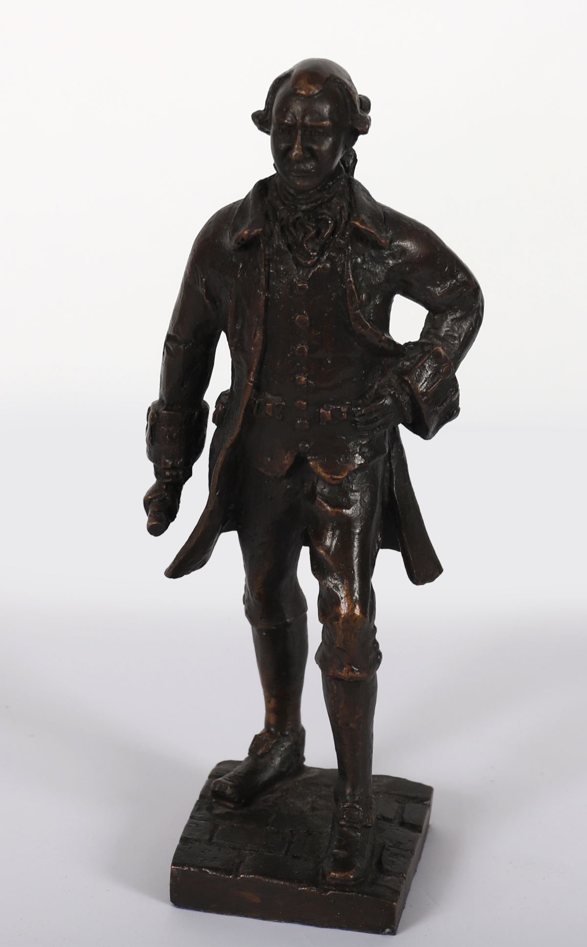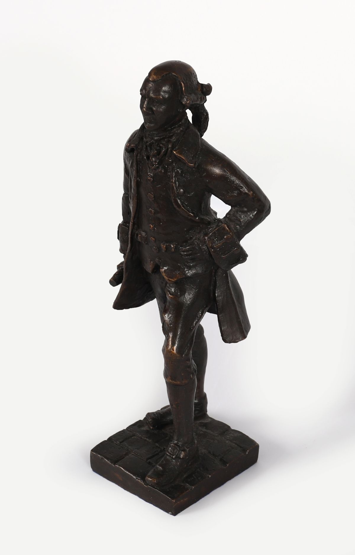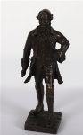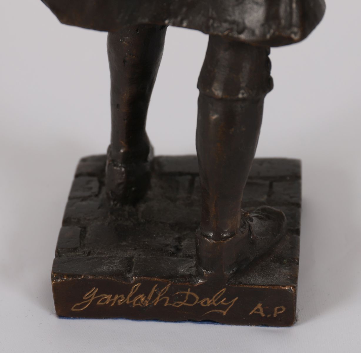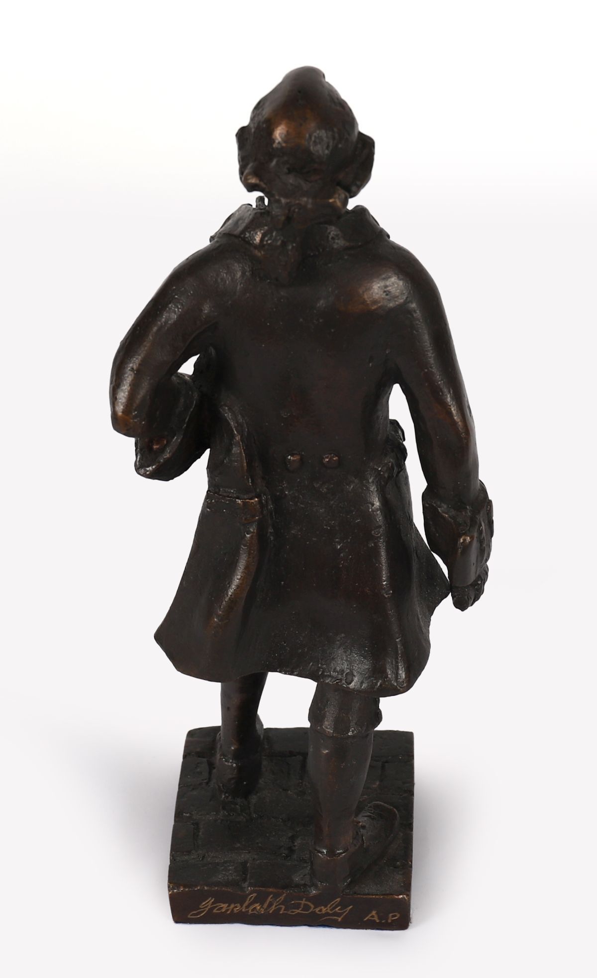 A bronze figure of Arthur Guinness, founder of the world-renowned brewery, depicted in period dress and standing confidently on a cobbled base. Modelled and signed by Jarlath Daly.