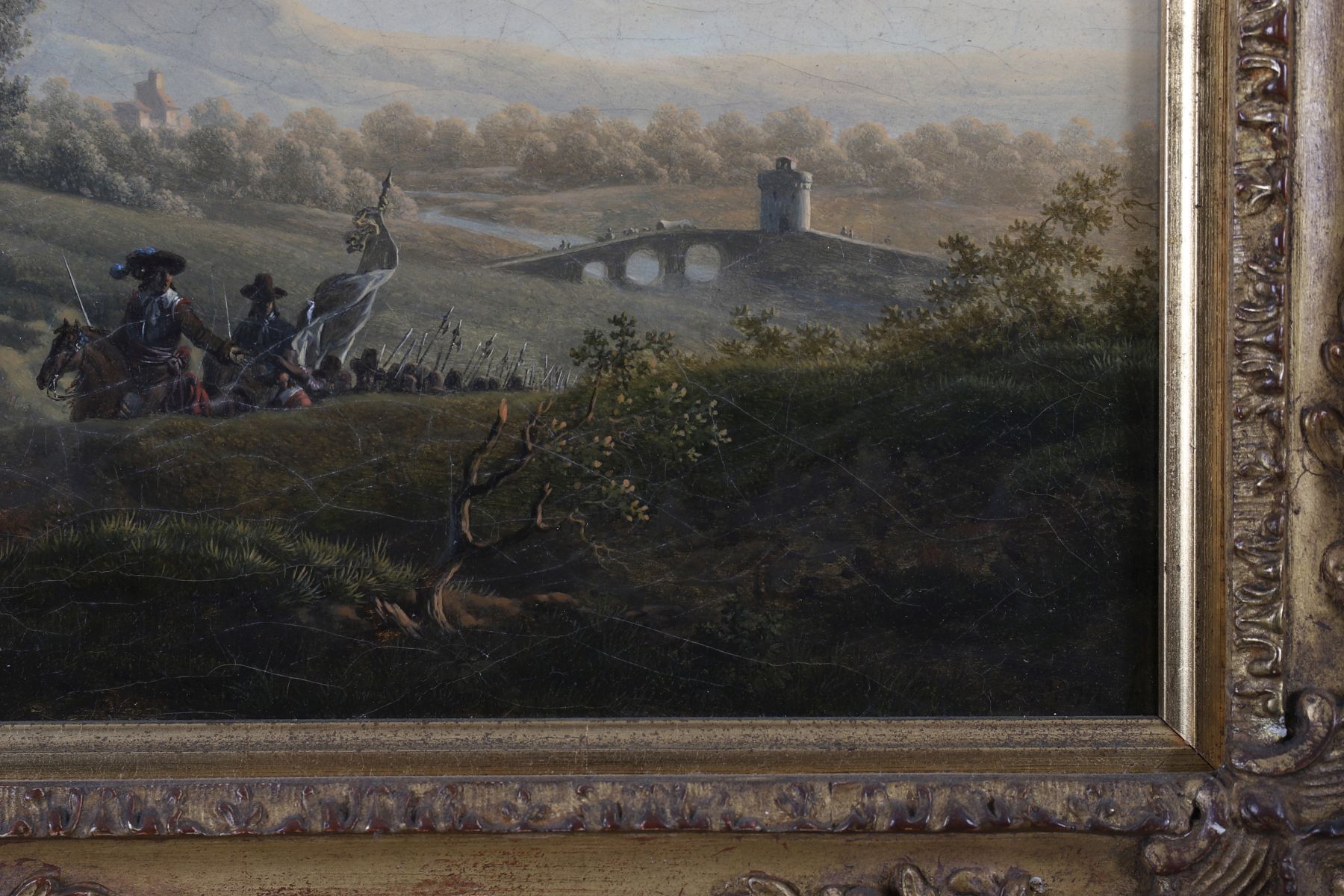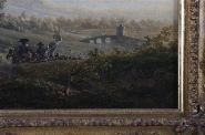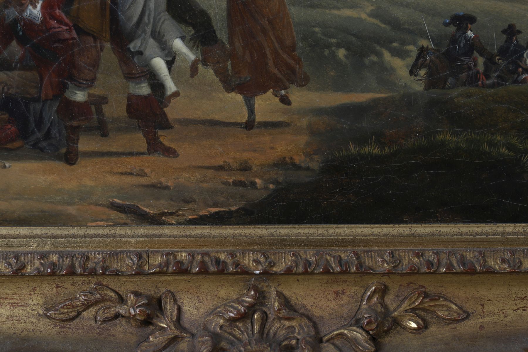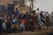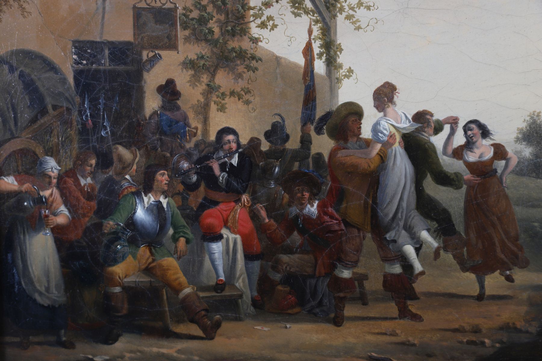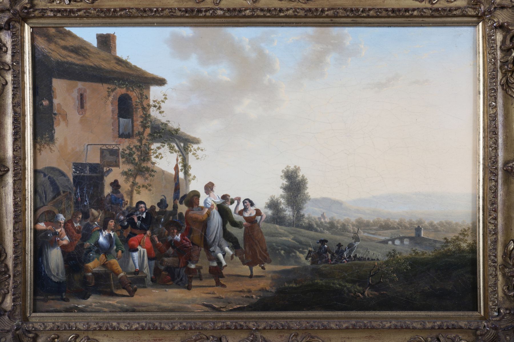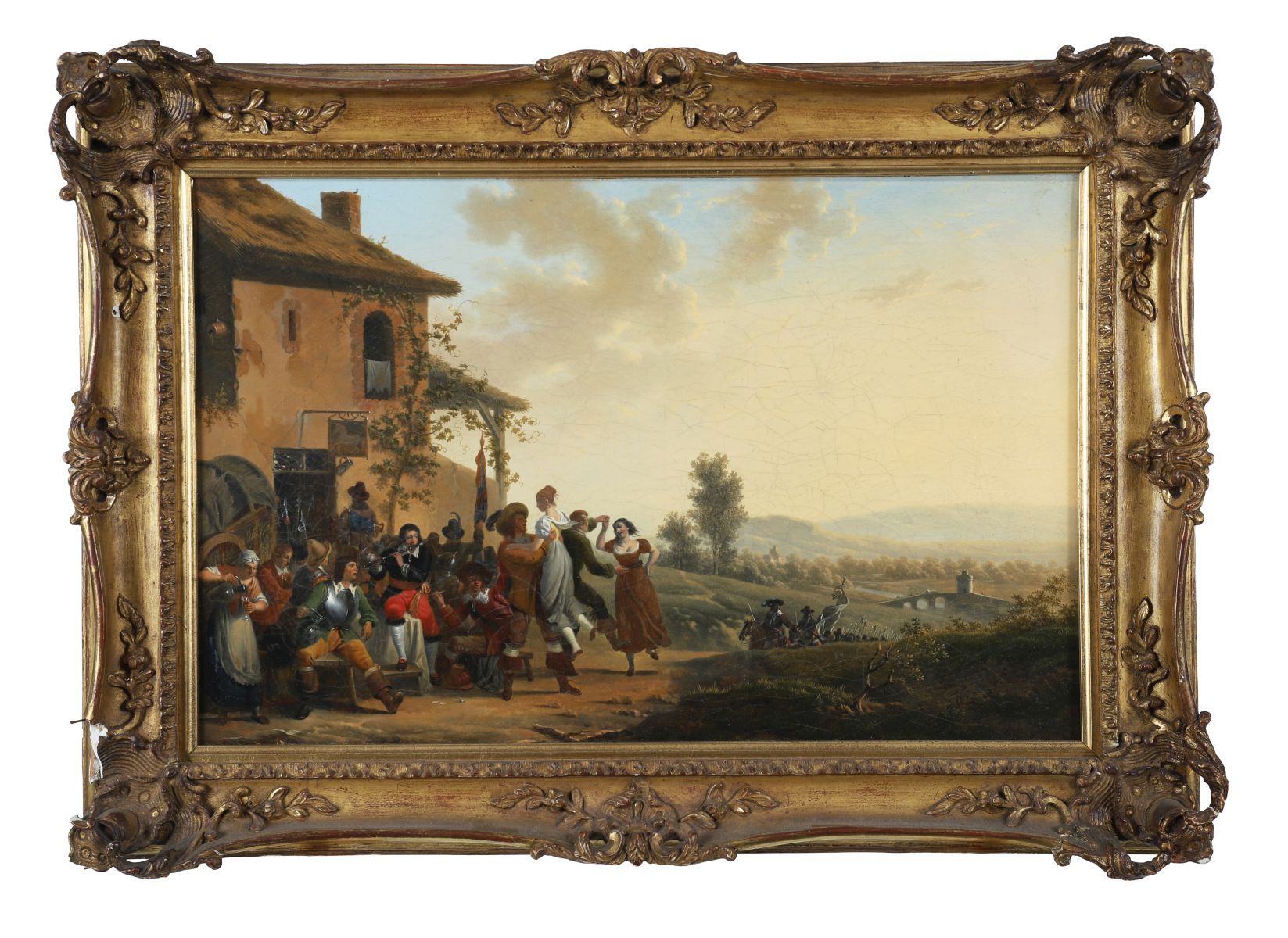 A lively genre scene depicting peasants dancing and playing music outside a rustic inn, with rolling hills and a distant bridge. Oil on canvas, signed lower right. Presented in a decorative gilt frame.