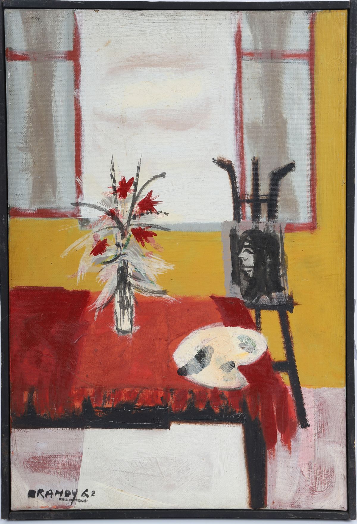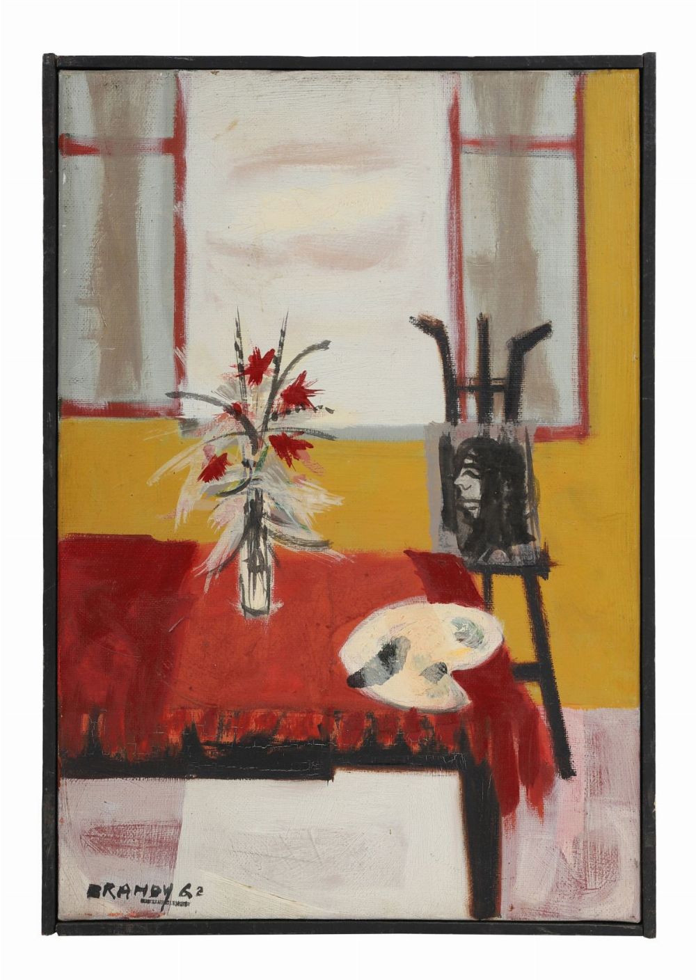 Oil on canvas depicting an artist’s studio interior with vase of flowers, painter’s palette, and portrait on an easel. Signed and dated ‘62 lower left. Presented in a simple black frame.