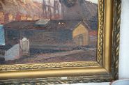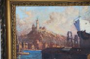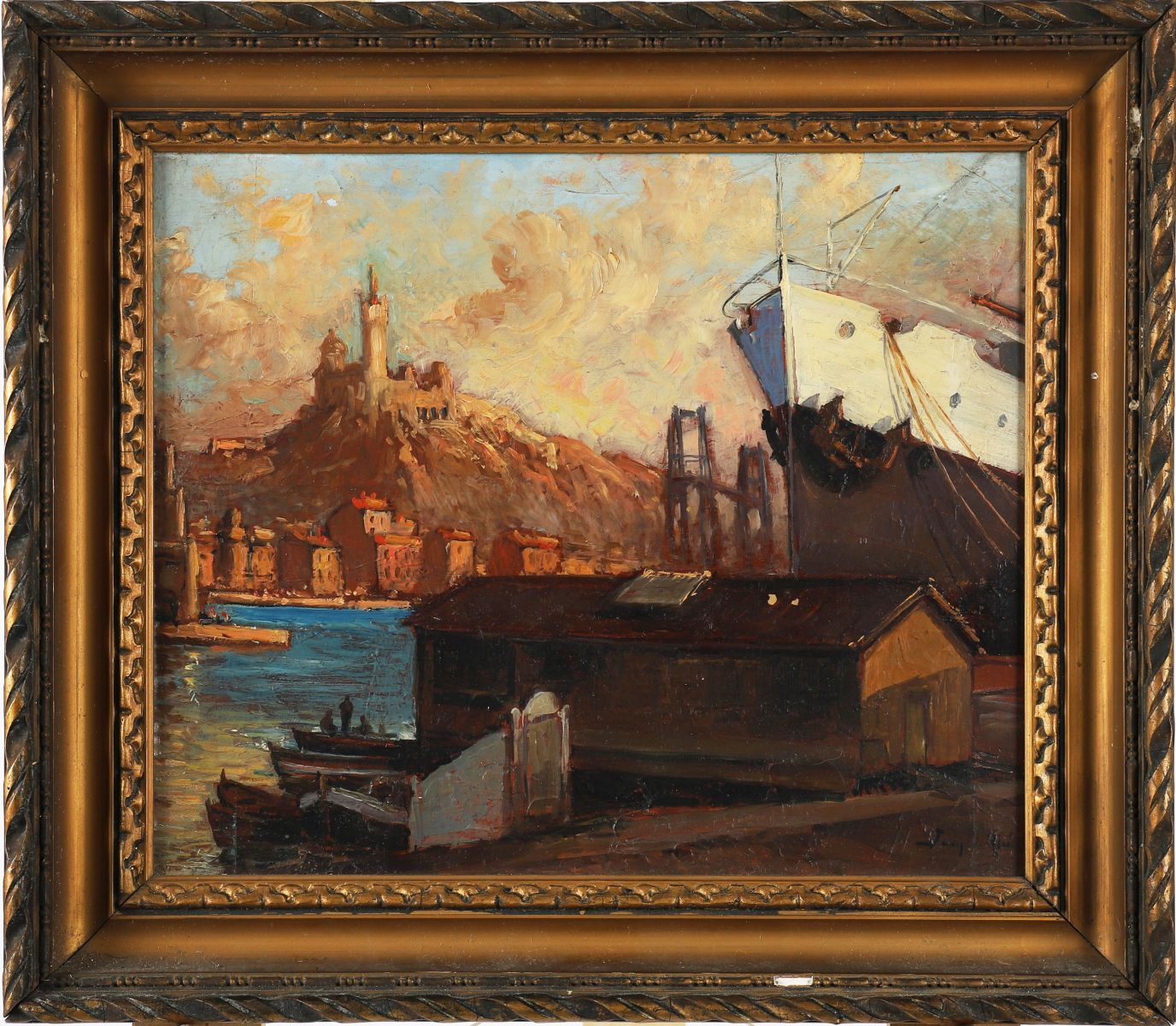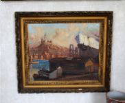 Coastal harbour. Signed oil on panel.