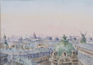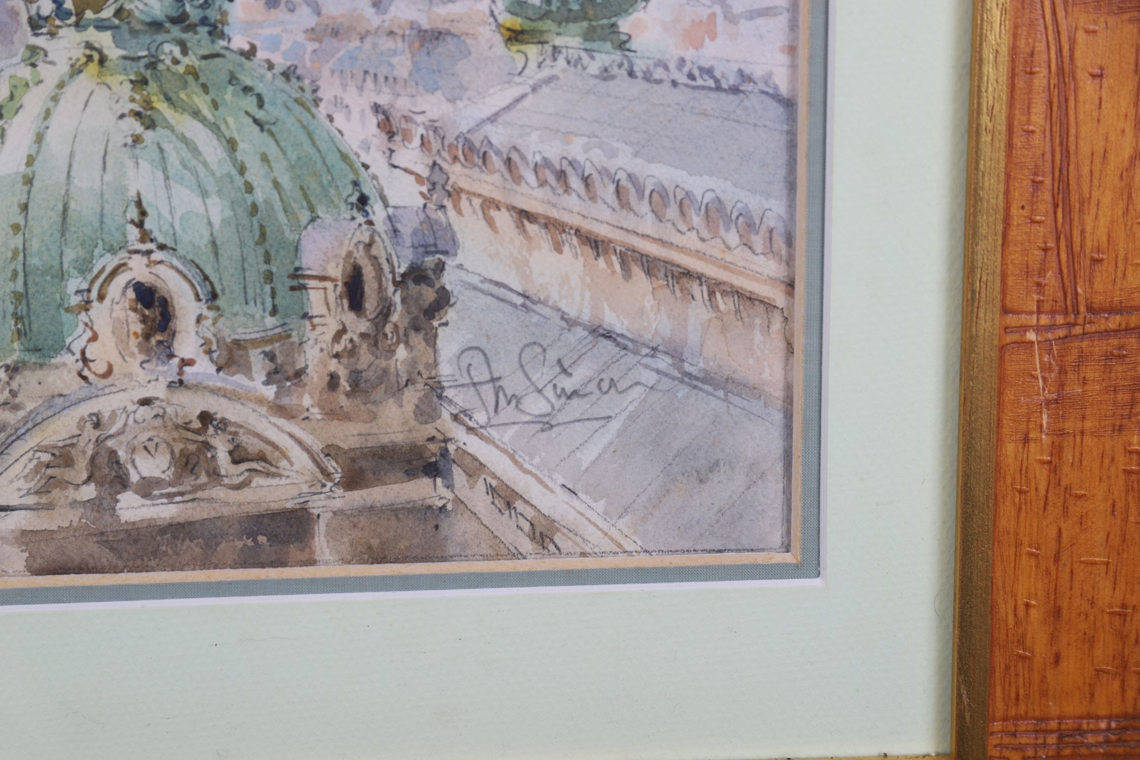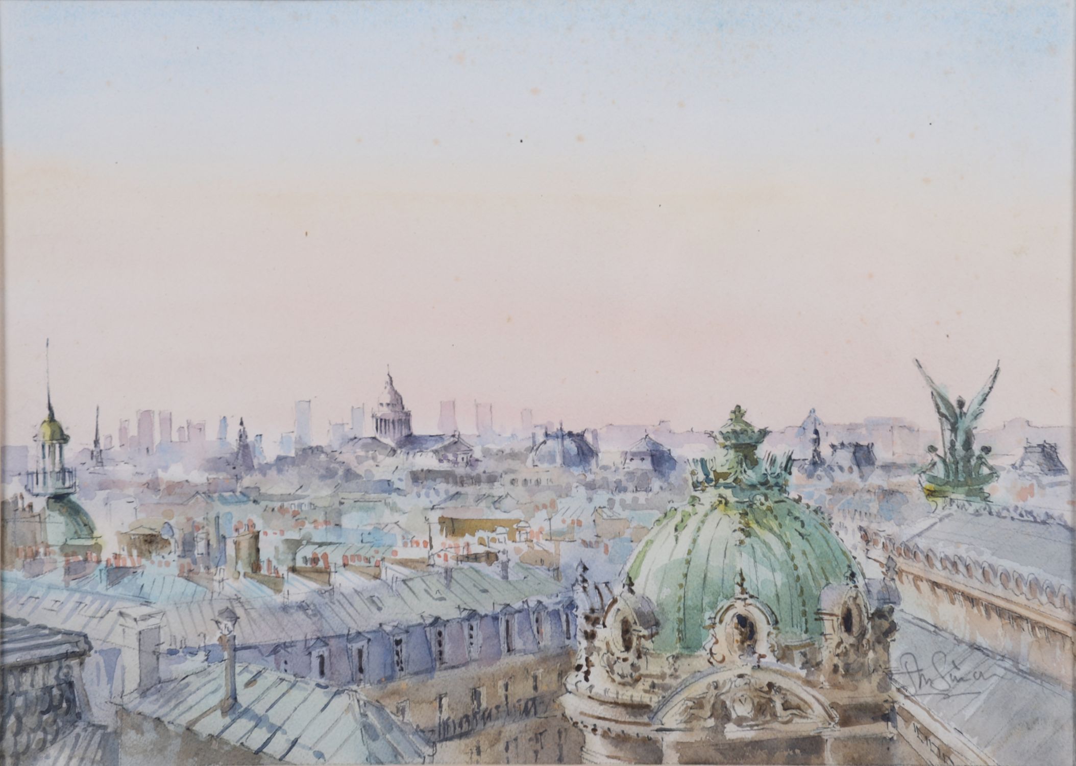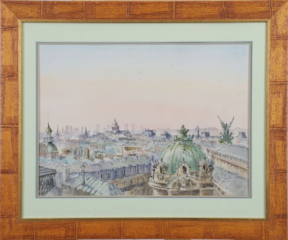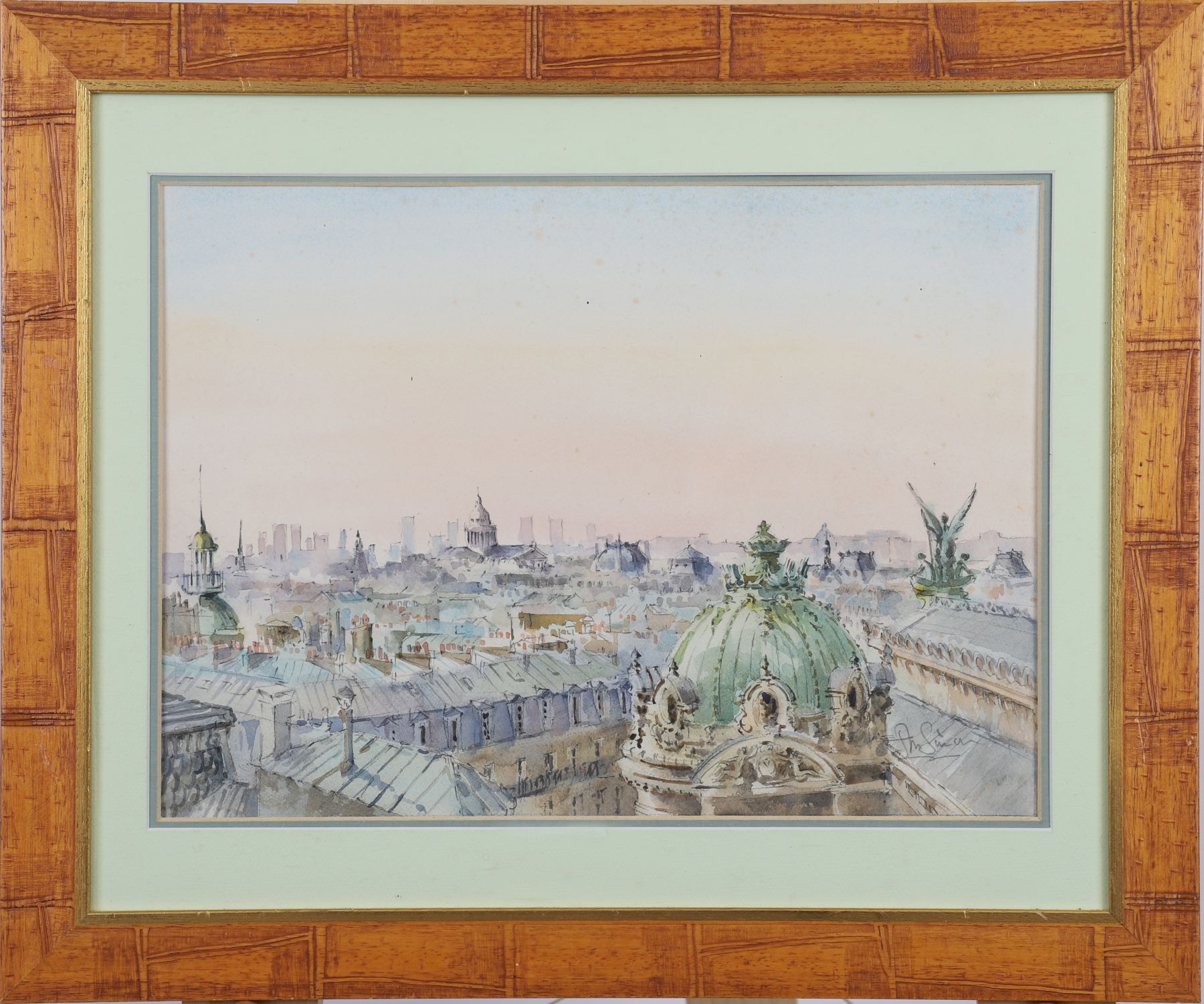 Paris Skyline. Watercolour. Dated 1985. Framed.