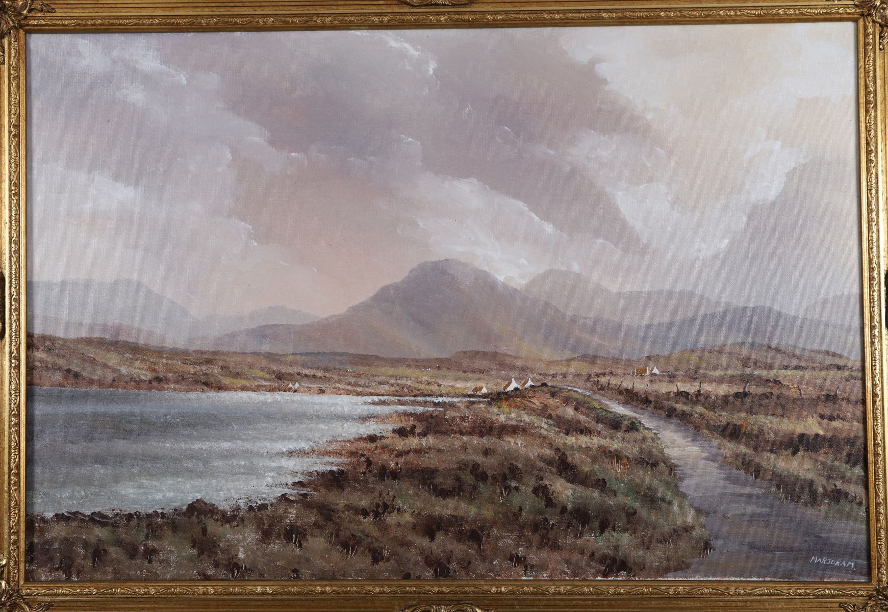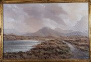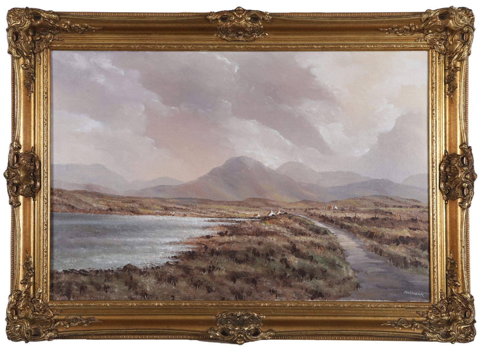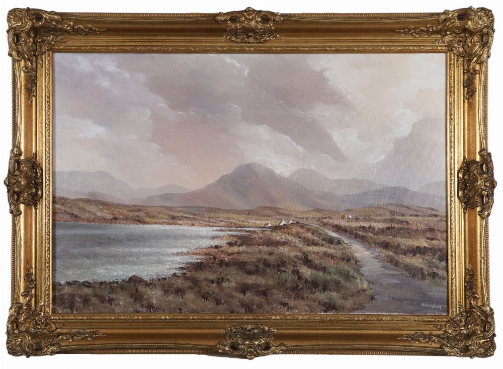 Lot 1073 JERRY MARJORAM, EXTENSIVE LAKE AND MOUNTAIN LANDSCAPE WITH COTTAGES TO THE FORE
