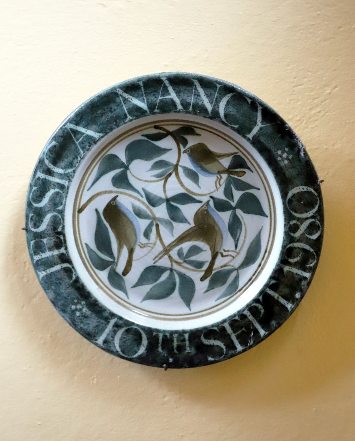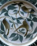 An art pottery plate by Jessica Nancy, dated September 1980, decorated with birds perched among foliage in muted green and brown tones, the rim inscribed.