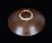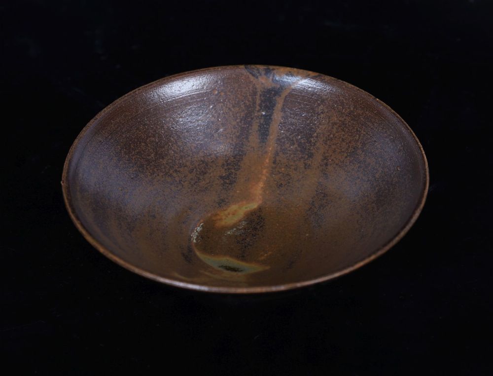 A classic Jian stoneware tea bowl with russet-brown glaze flecked with black, thinning to reveal the dark body at the rim and foot.