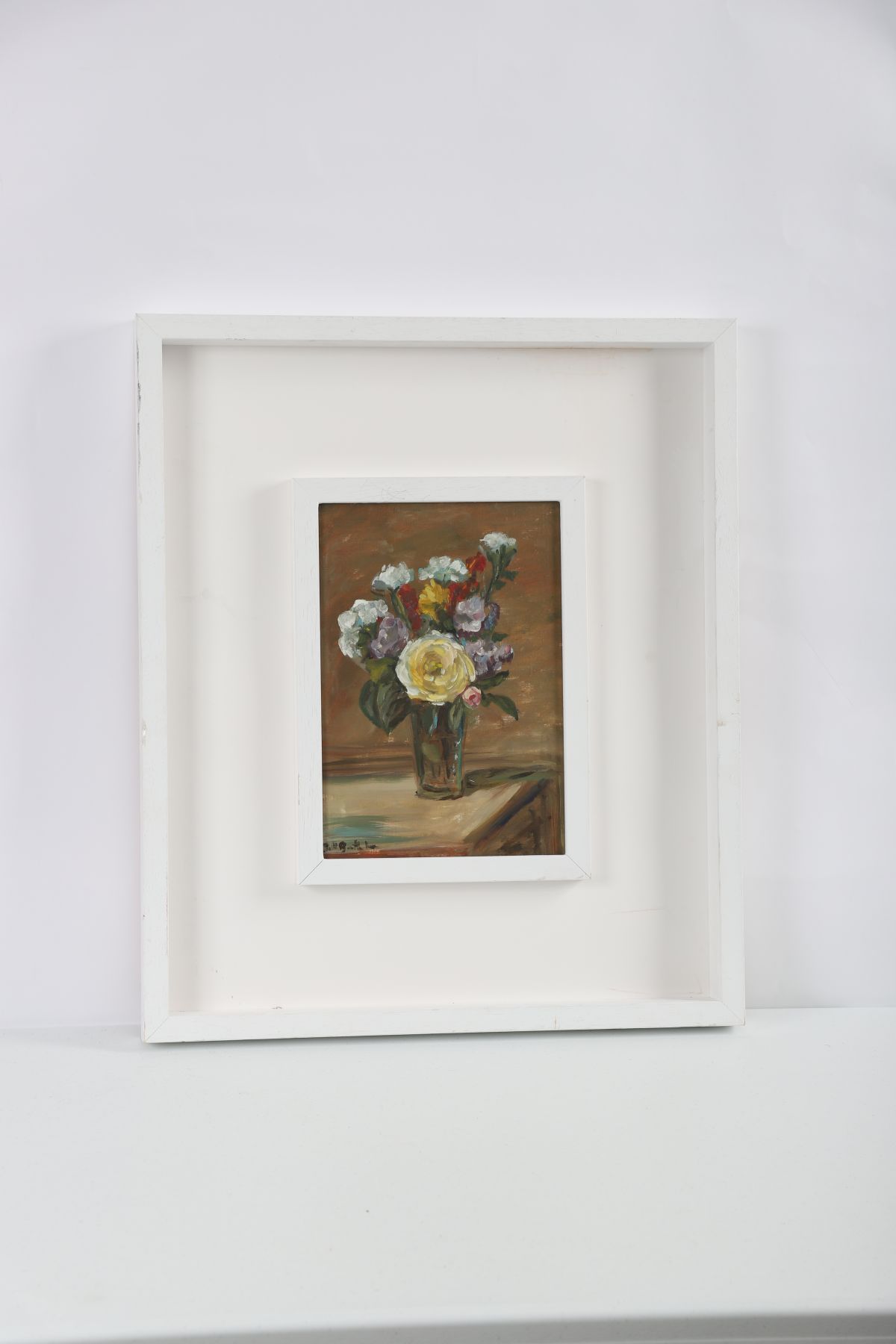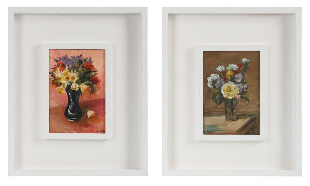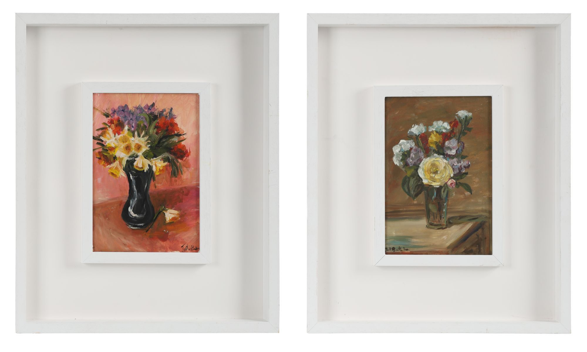 A pair of expressive floral still lifes. One portrays roses and mixed flowers on a muted ground; the other features a vibrant bouquet set against a warm pink background. Both works display lively brushwork and are uniformly framed in white. Signed.