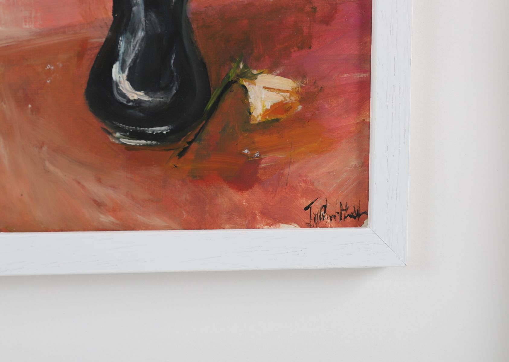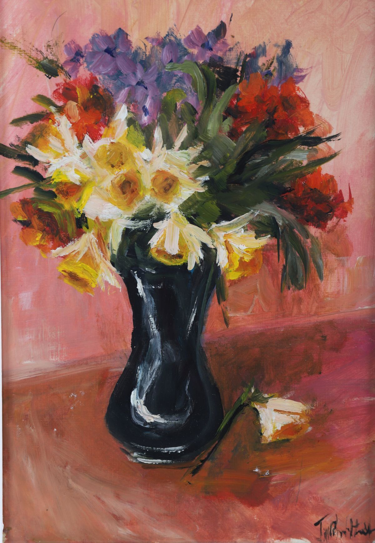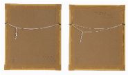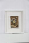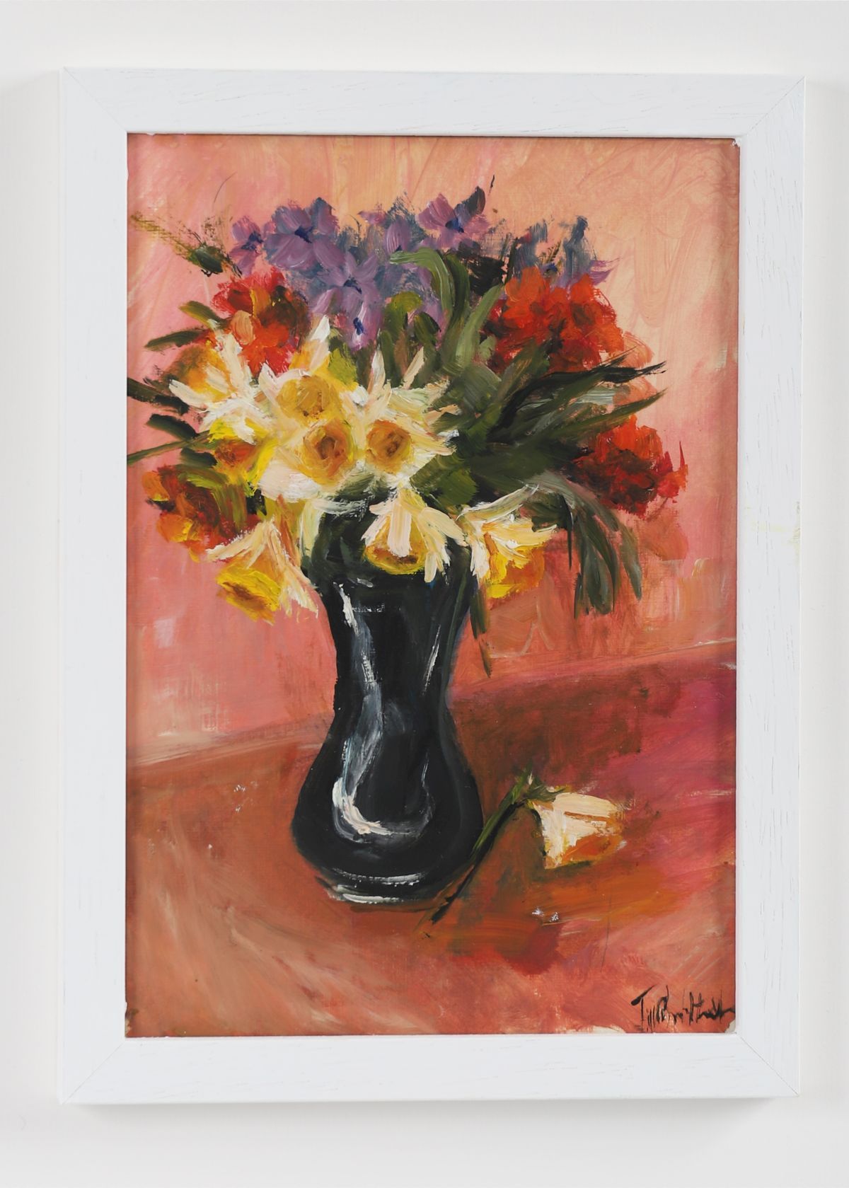 A pair of expressive floral still lifes. One portrays roses and mixed flowers on a muted ground; the other features a vibrant bouquet set against a warm pink background. Both works display lively brushwork and are uniformly framed in white. Signed.