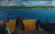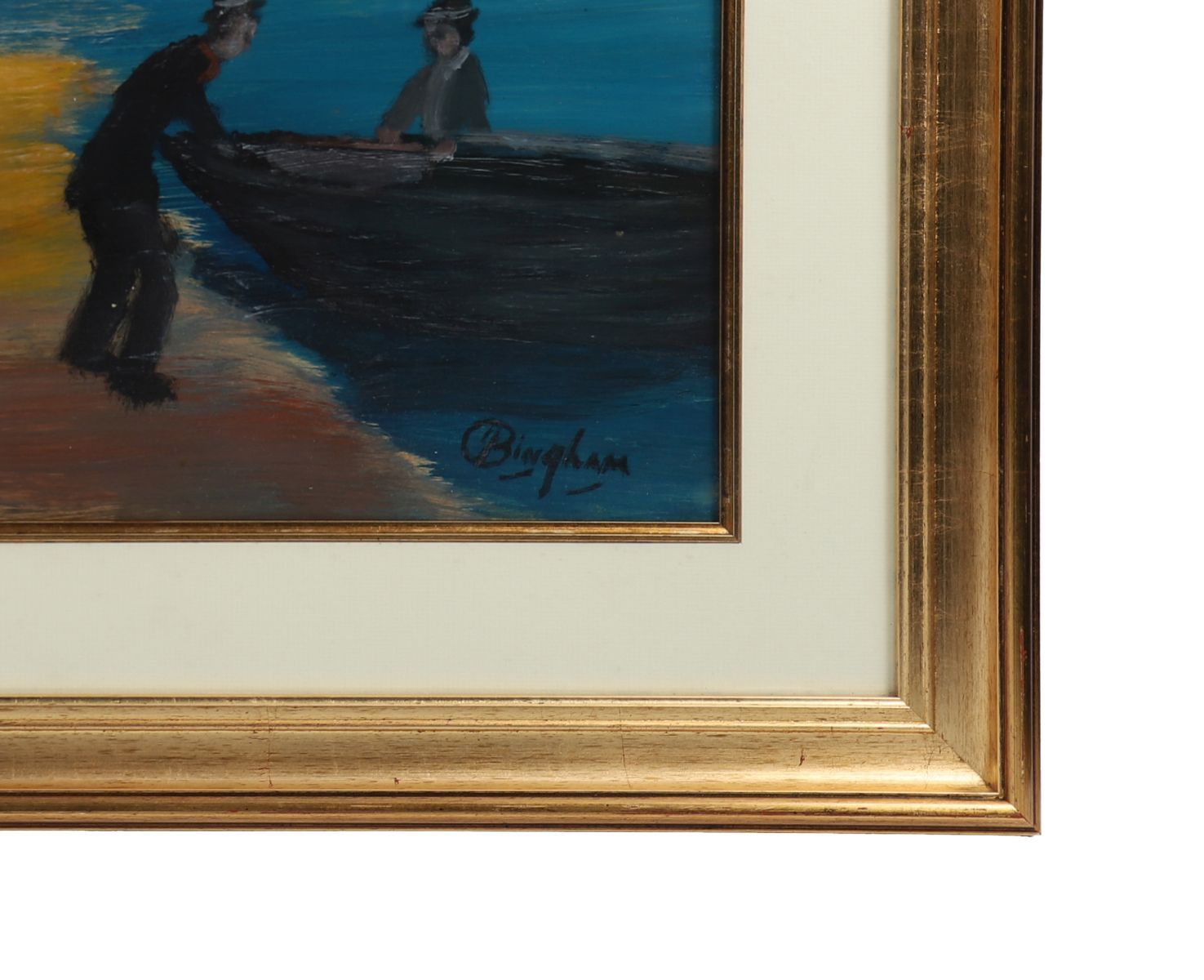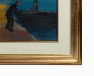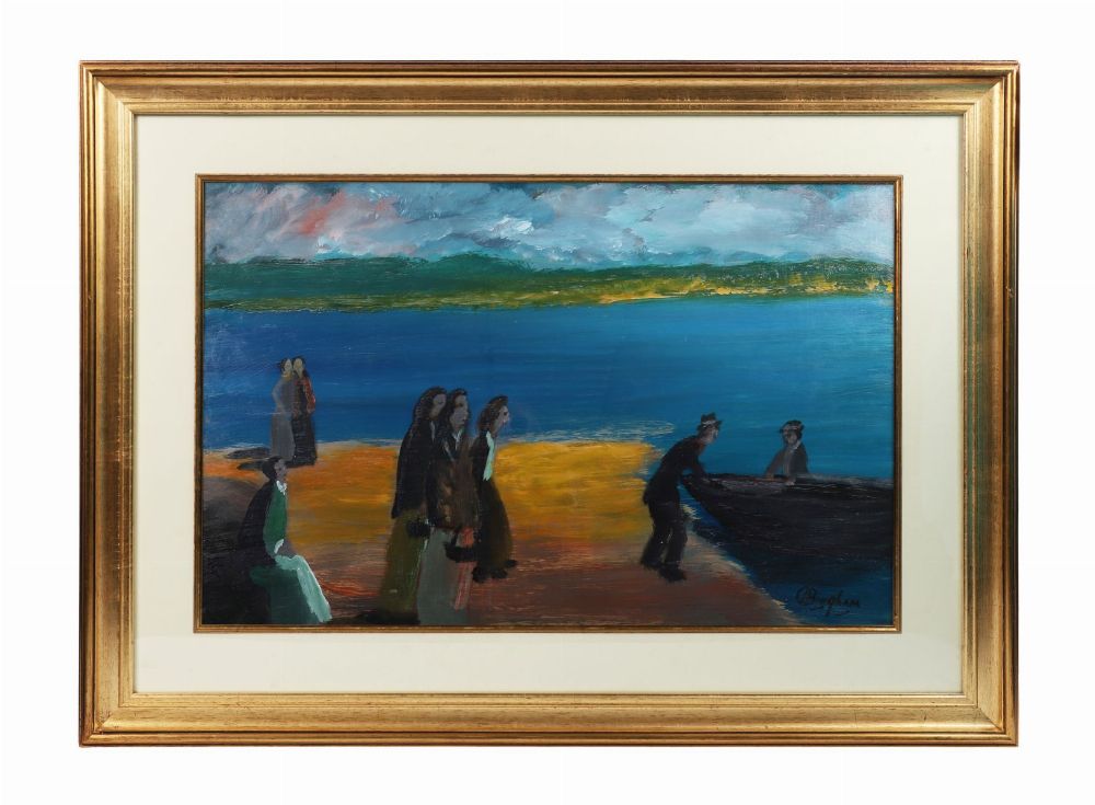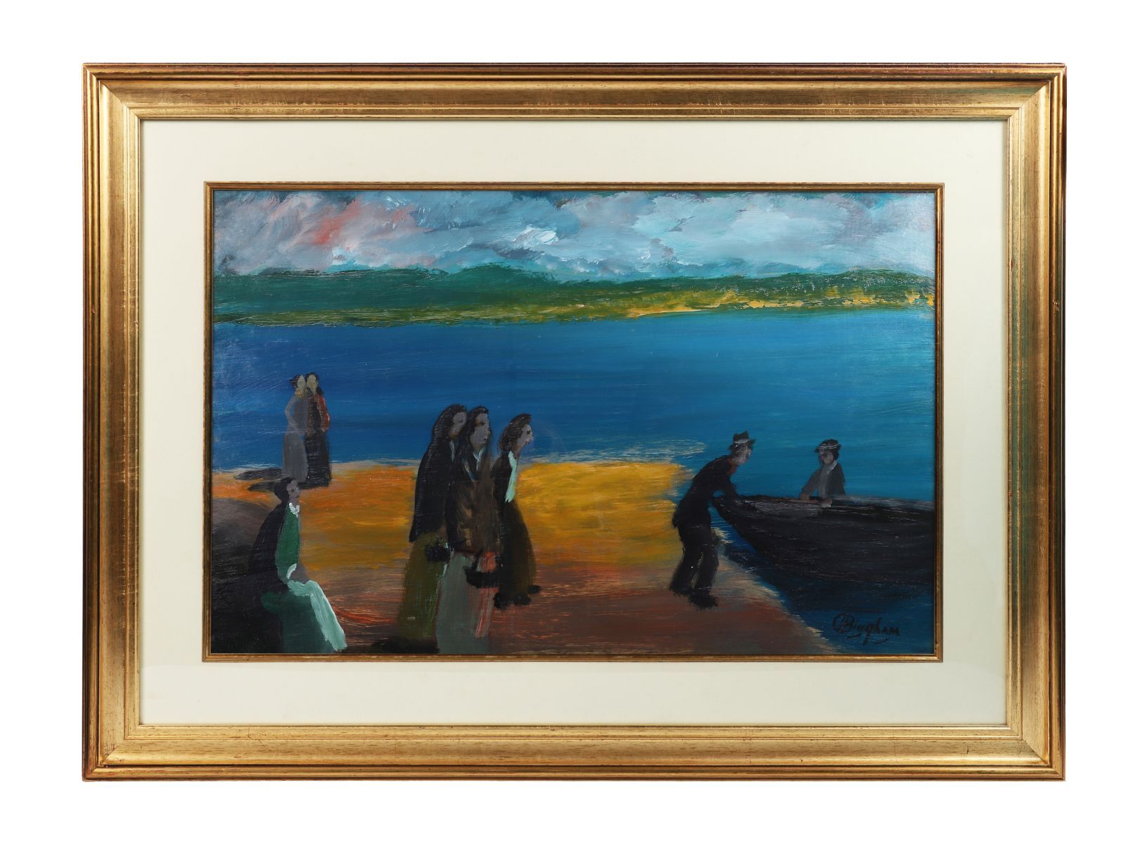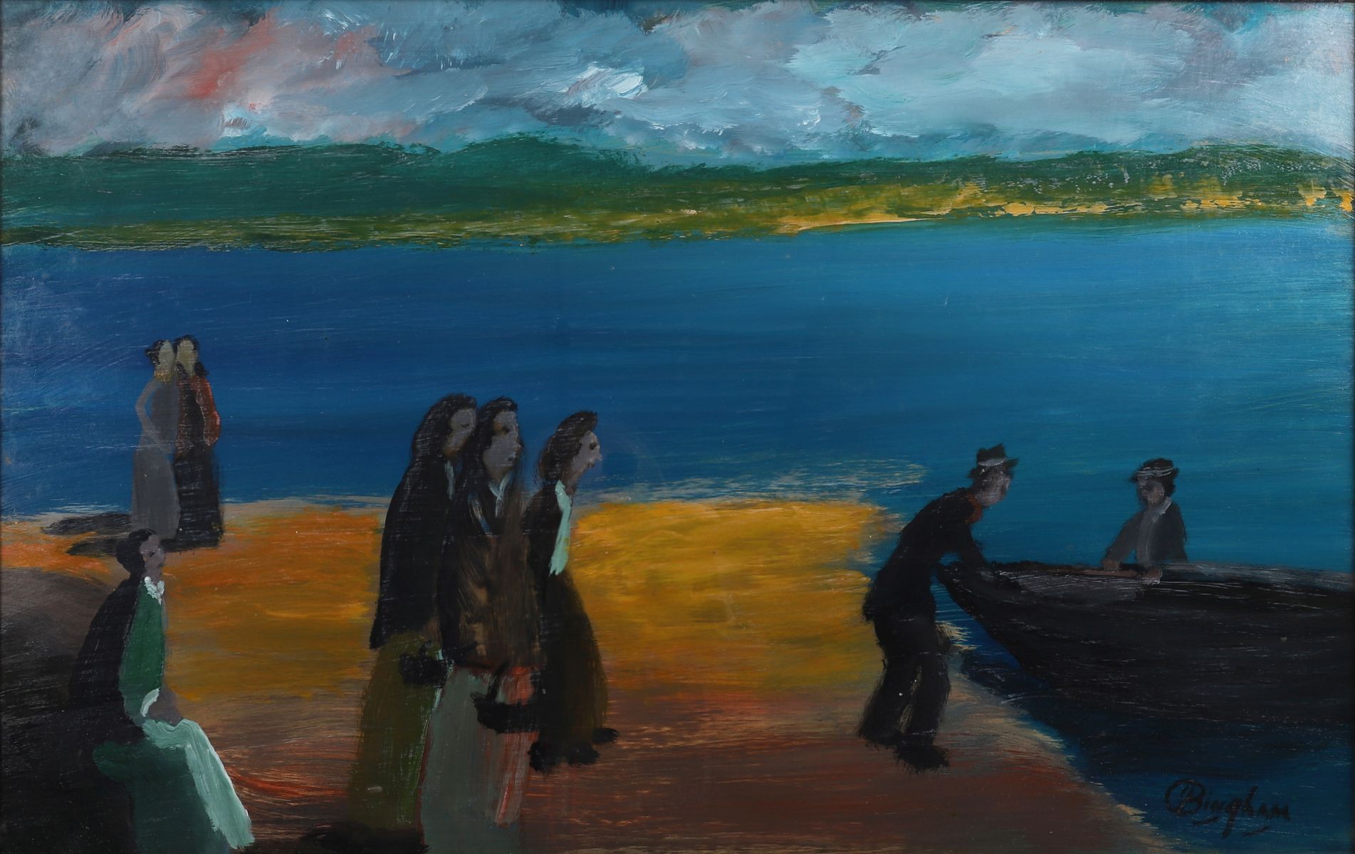 Oil on board depicting a group of figures gathered on a shoreline as fishermen bring a currach to land, the composition set against vivid tones of blue and ochre under a turbulent sky. Executed in Bingham’s distinctive expressive style, with simplified forms and strong colour contrasts evoking the rhythms of coastal Irish life. Signed lower right. Presented in a gilt frame.