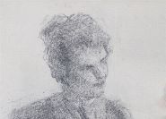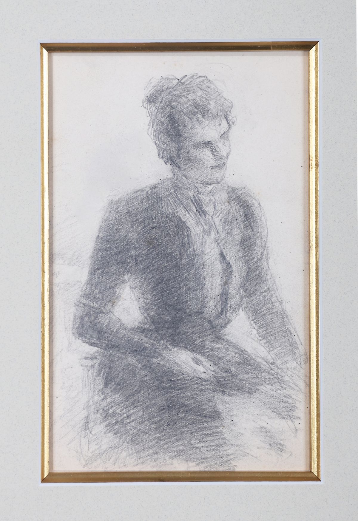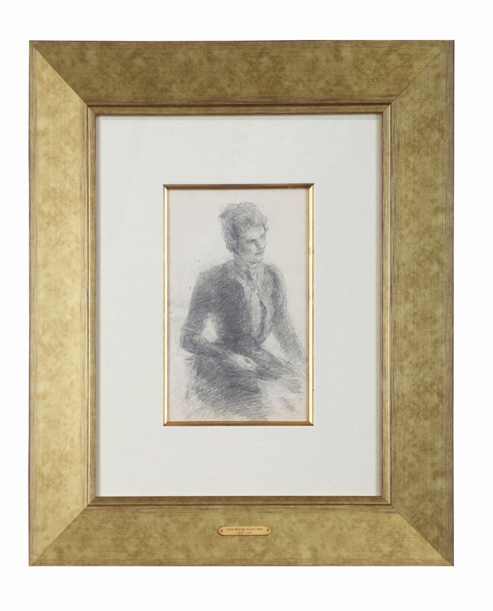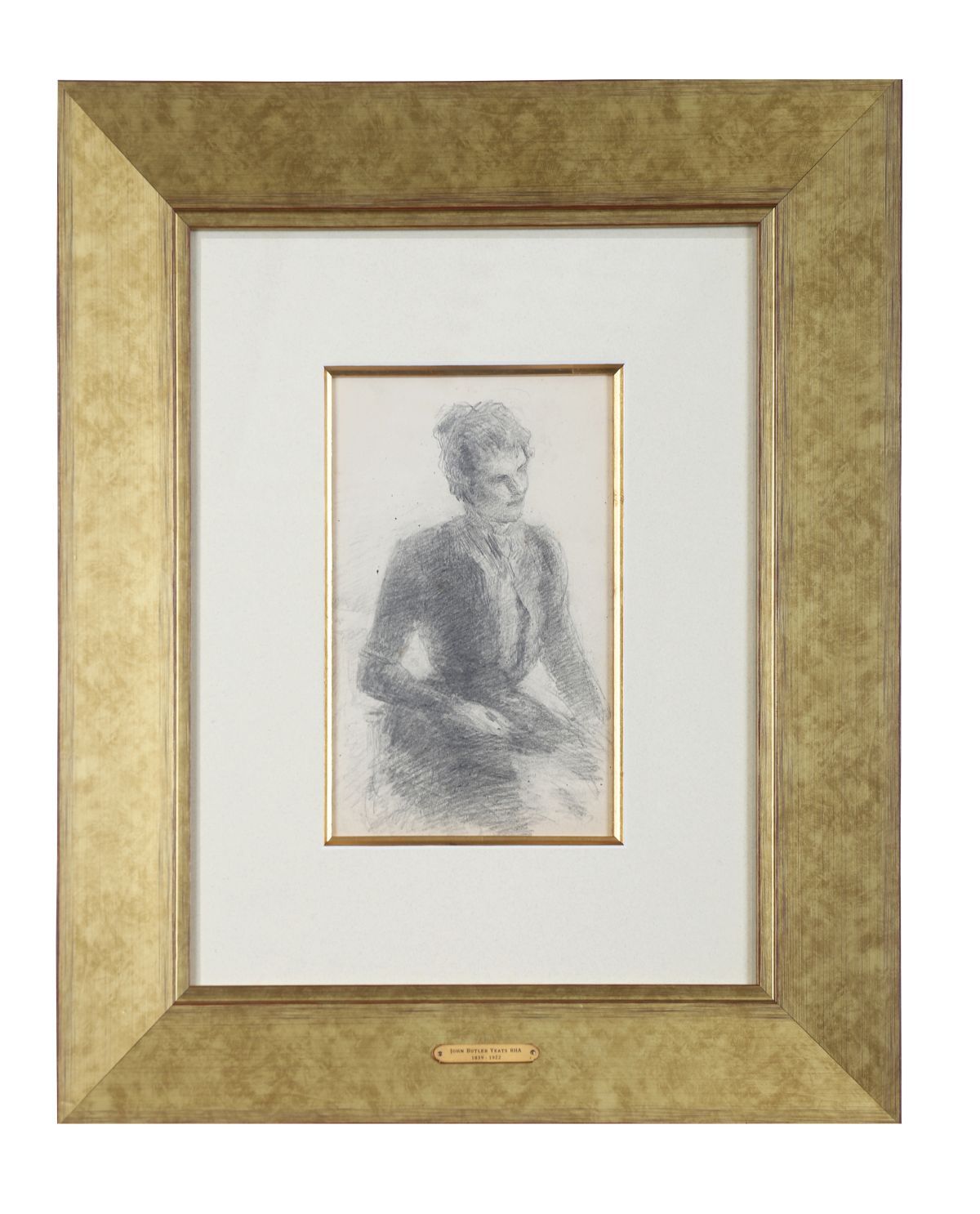 Expressive pencil sketch of Lily in formal attire, executed with confident cross-hatching and tonal shading characteristic of Yeats’s late drawing style. The work reveals the artist’s continued exploration of human character and mood through graphite. Presented mounted and gilt-framed.