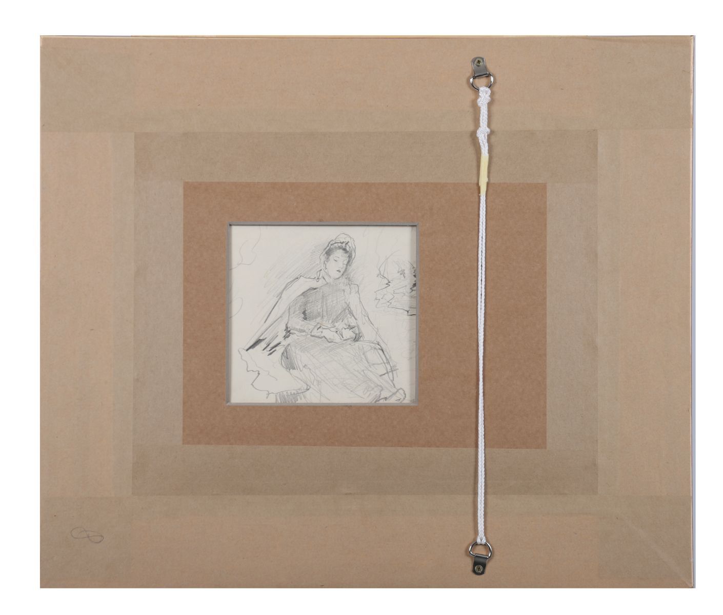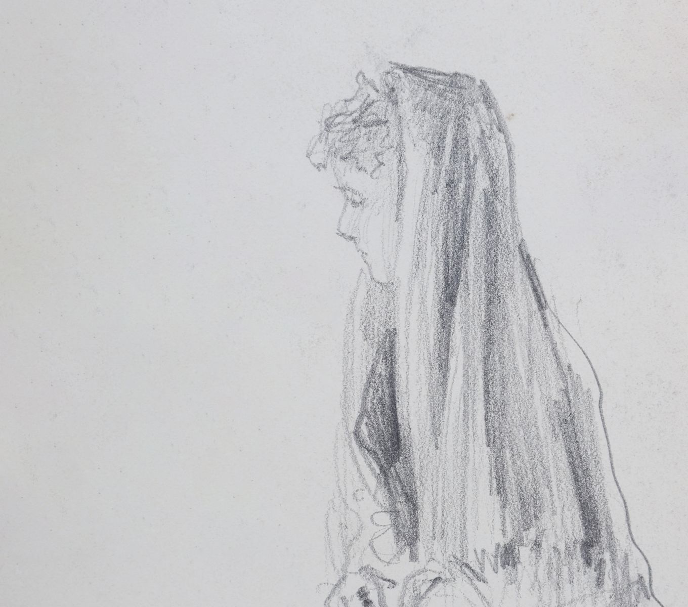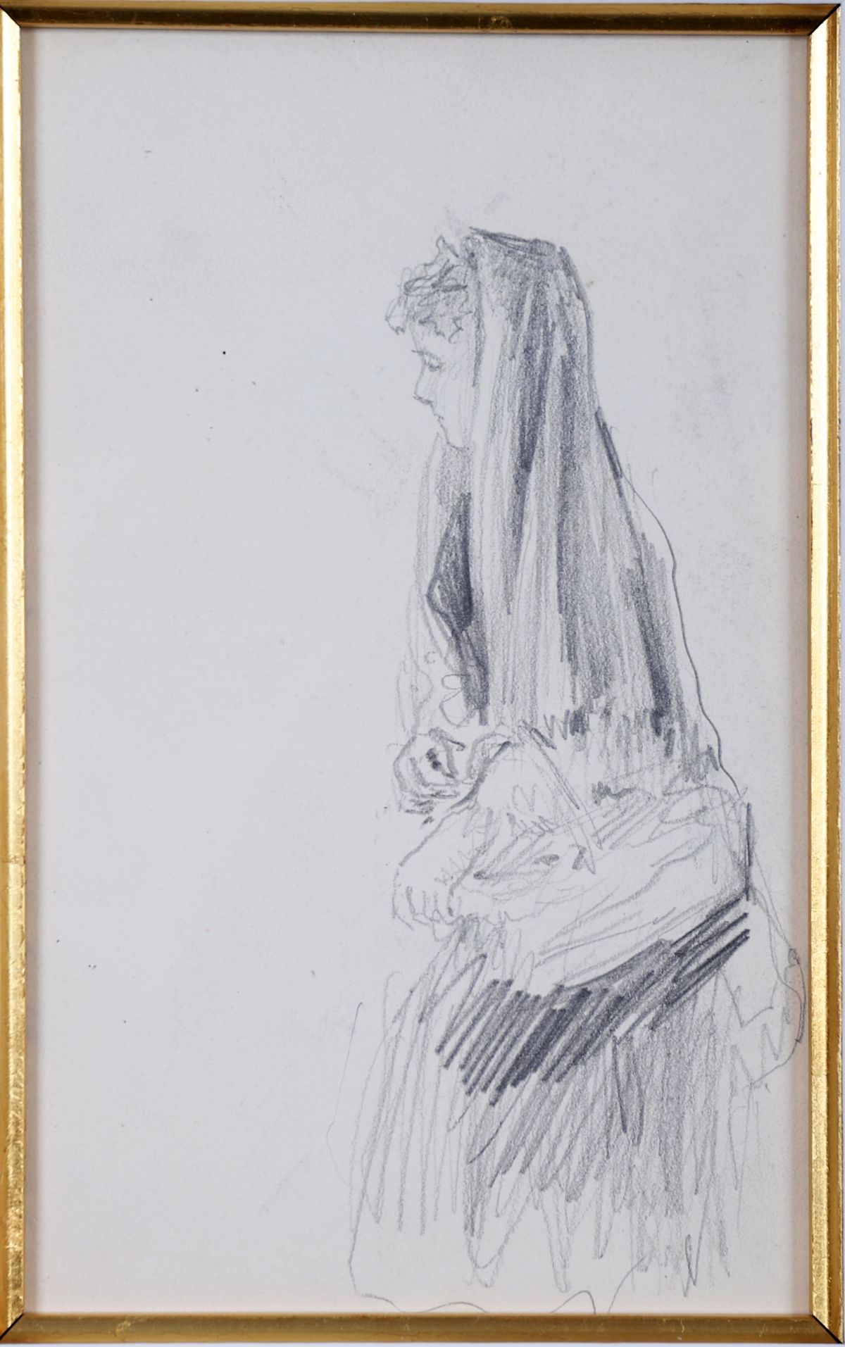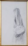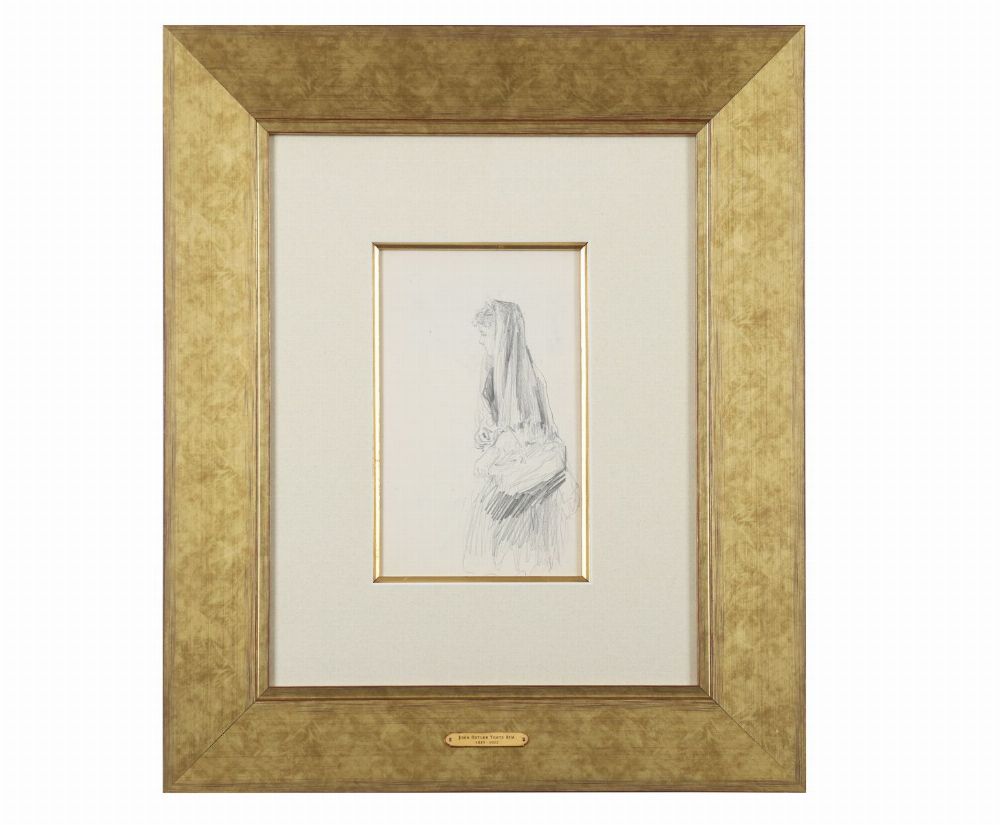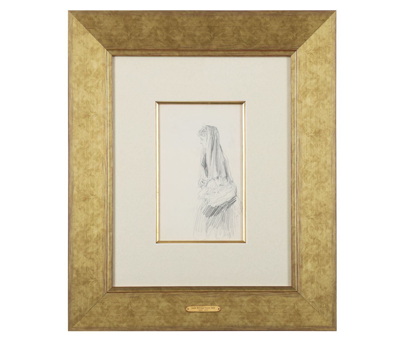 A finely executed pencil study depicting a woman in profile, draped in a long shawl and bonnet. The sensitive treatment of line and tone reflects Yeats’s mastery in capturing quiet introspection and domestic character. Mounted and presented in a gilt frame.