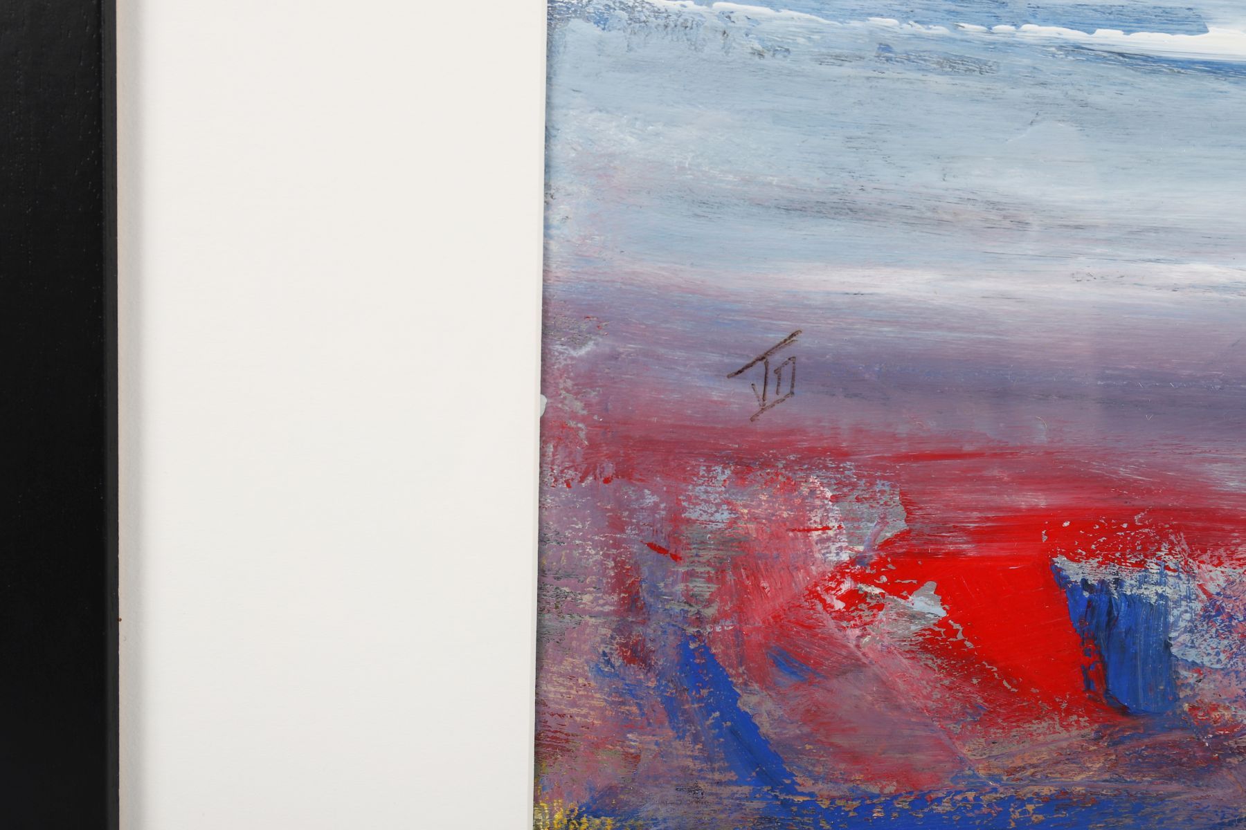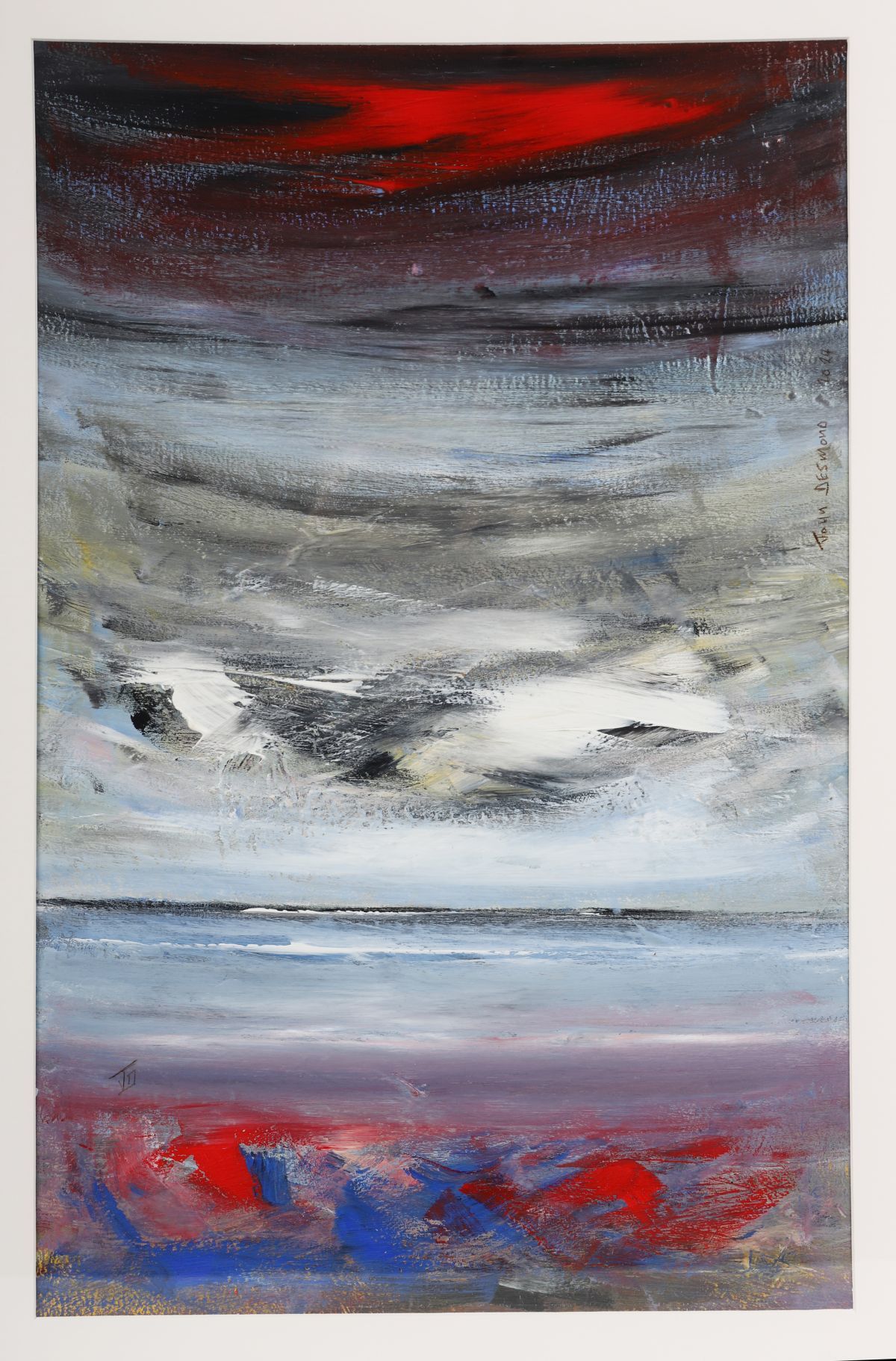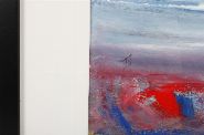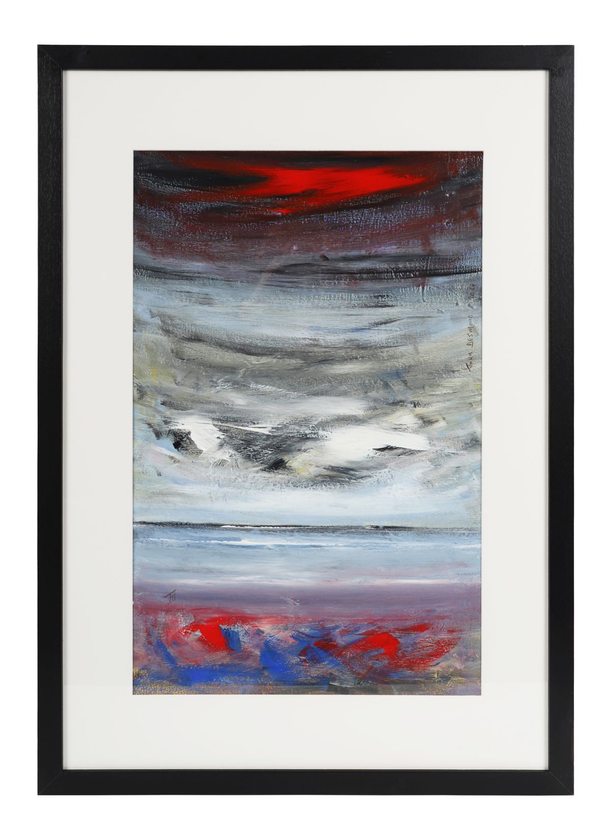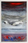 An expressive abstract seascape in layered tones of red, grey, and indigo, capturing the shifting light and atmospheric reflection of sea and sky. The gestural brushwork and textured impasto lend the piece a dynamic yet contemplative quality.