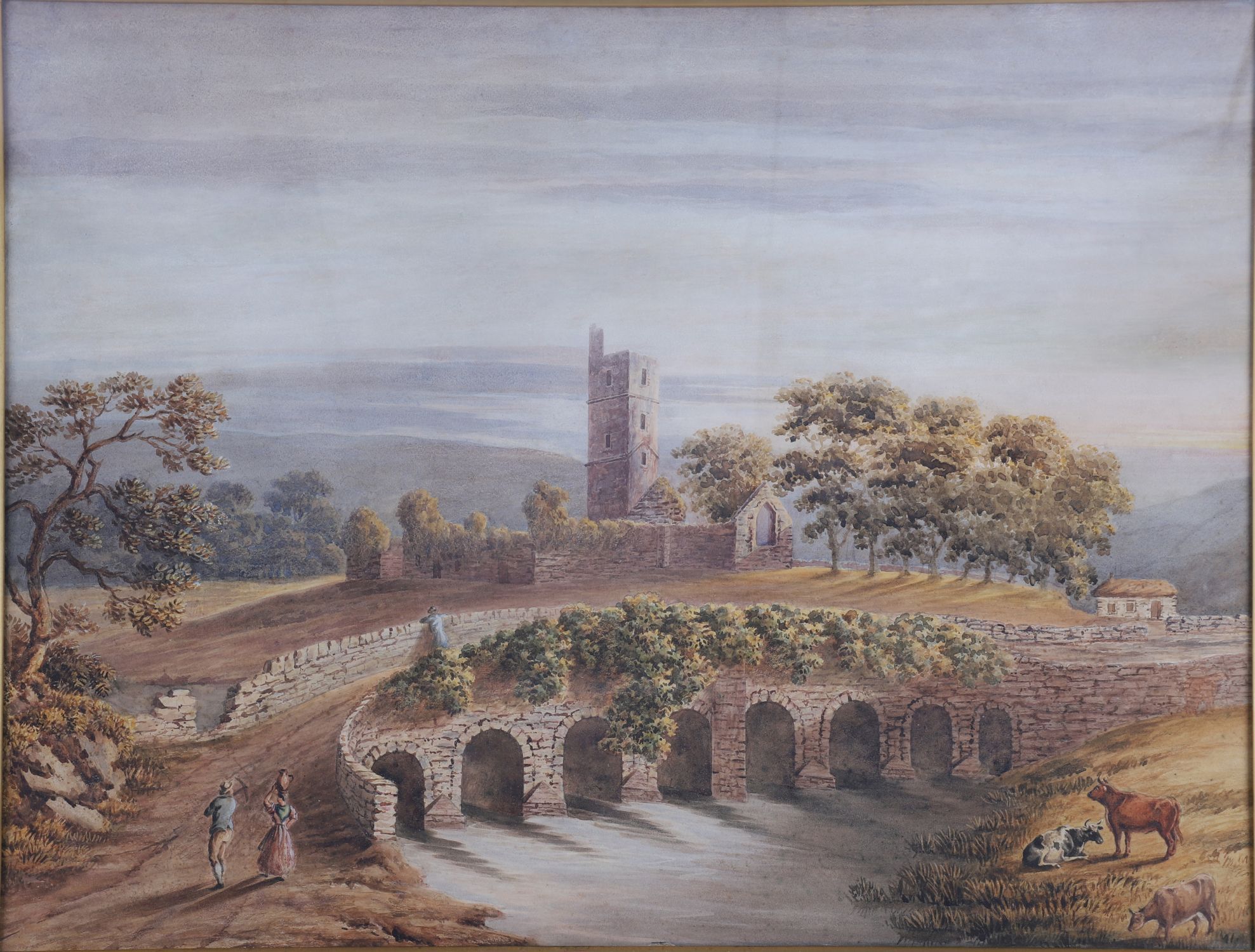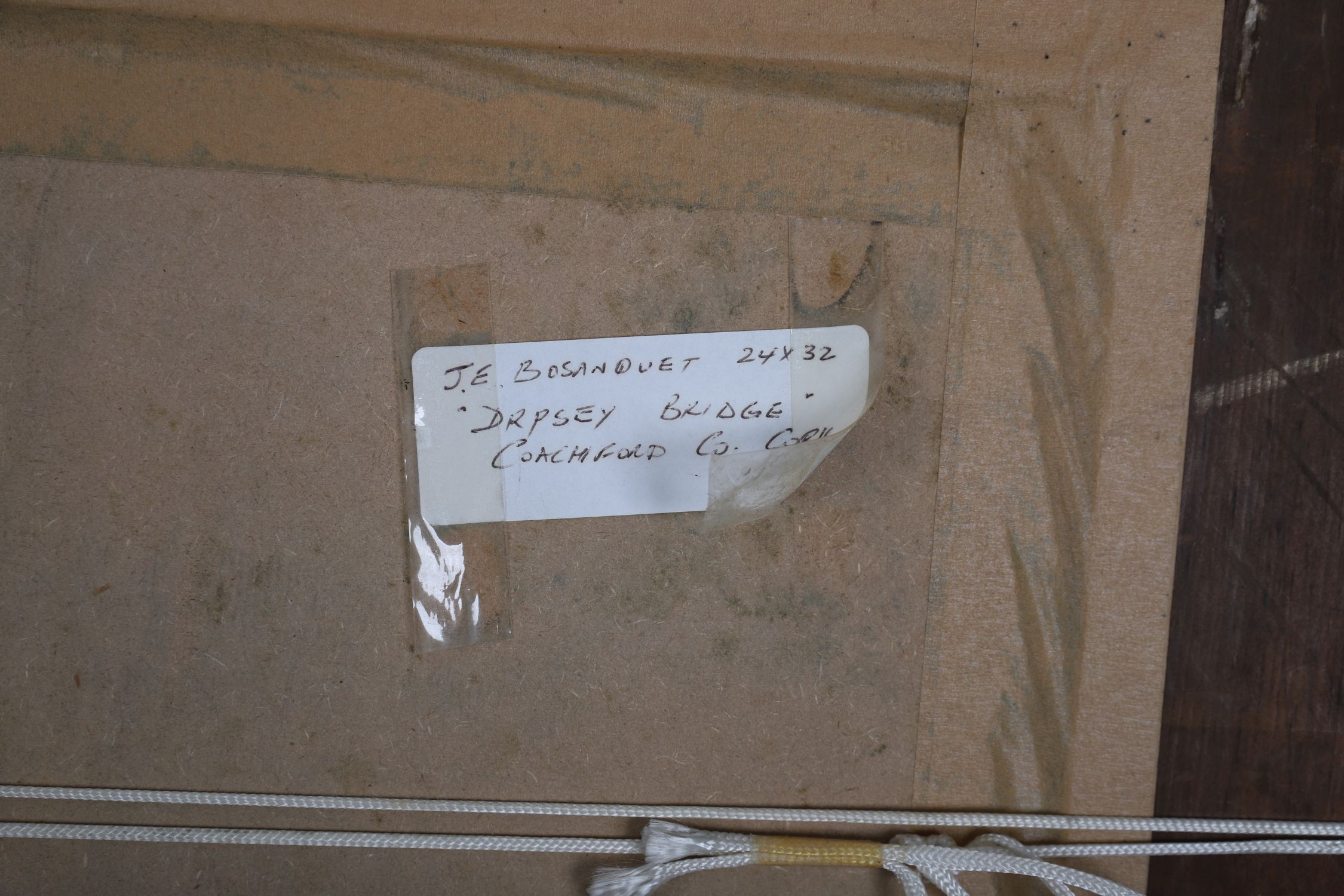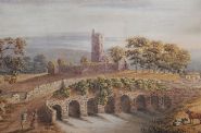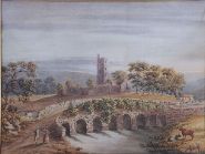 Description: A finely detailed landscape painting depicting Dripsey Bridge near Coachford in County Cork. Rendered in naturalistic tones with careful attention to the stonework, riverbank, and surrounding vegetation.