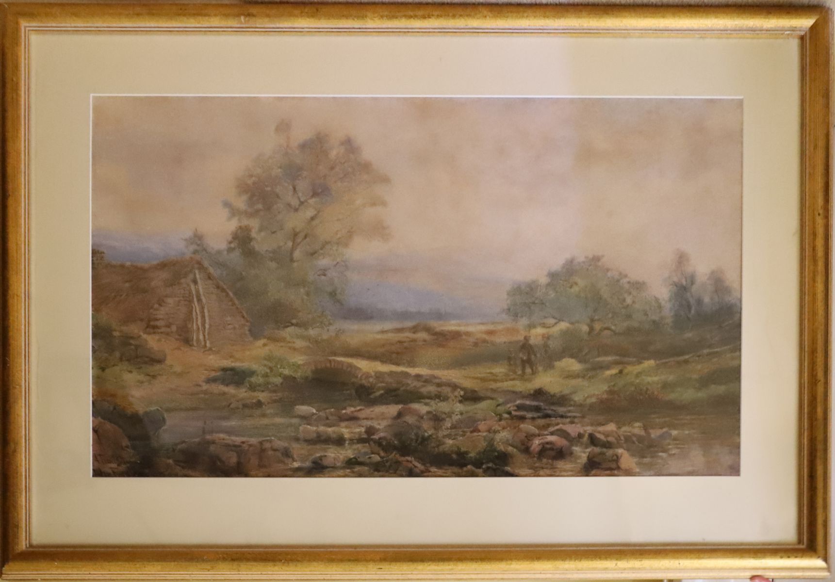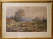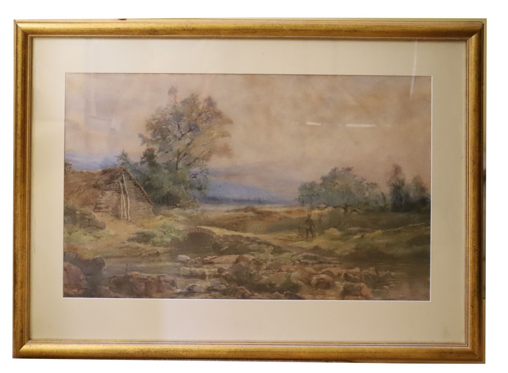 Landscape study of a flowing trout stream with wooded banks, signed. Enclosed in a gilt frame. Watercolour on paper.