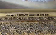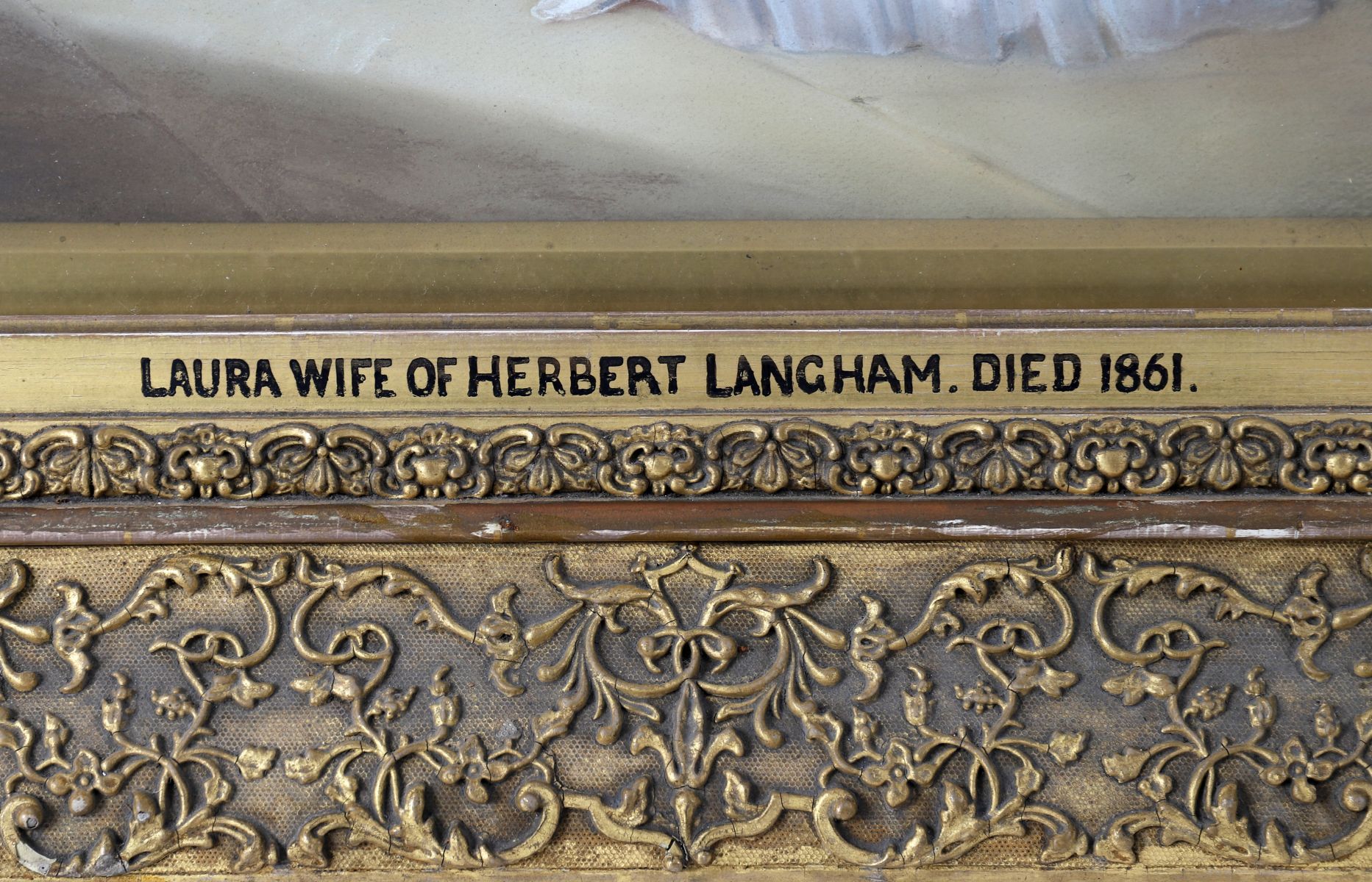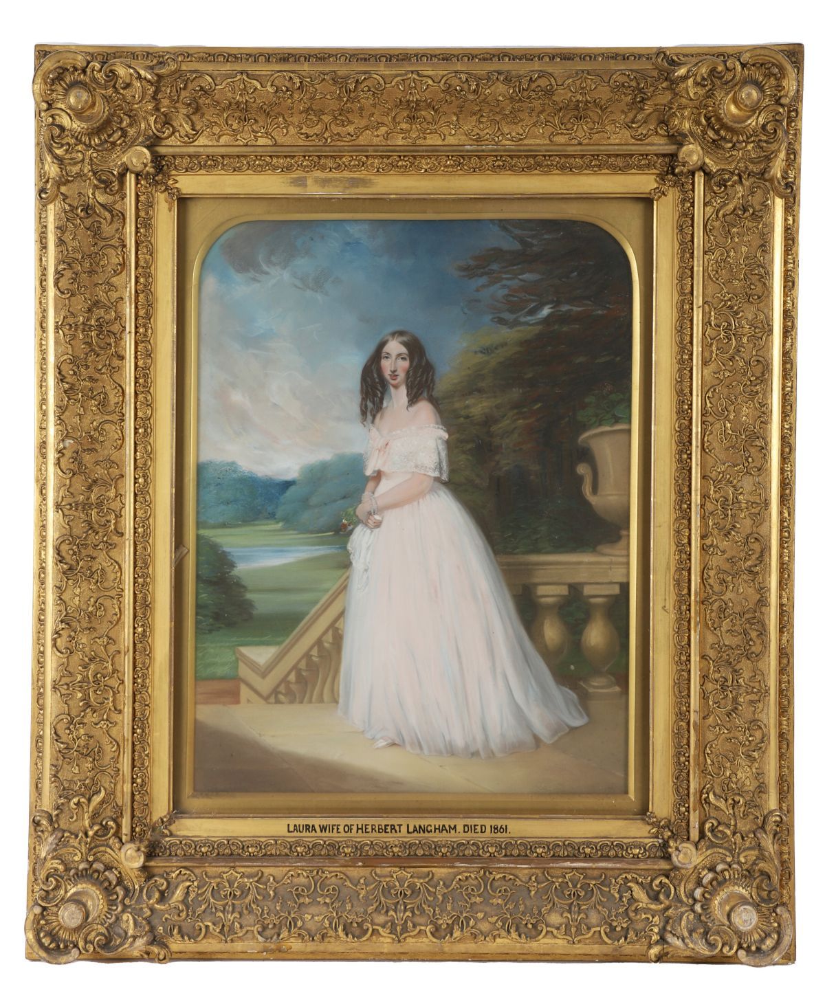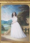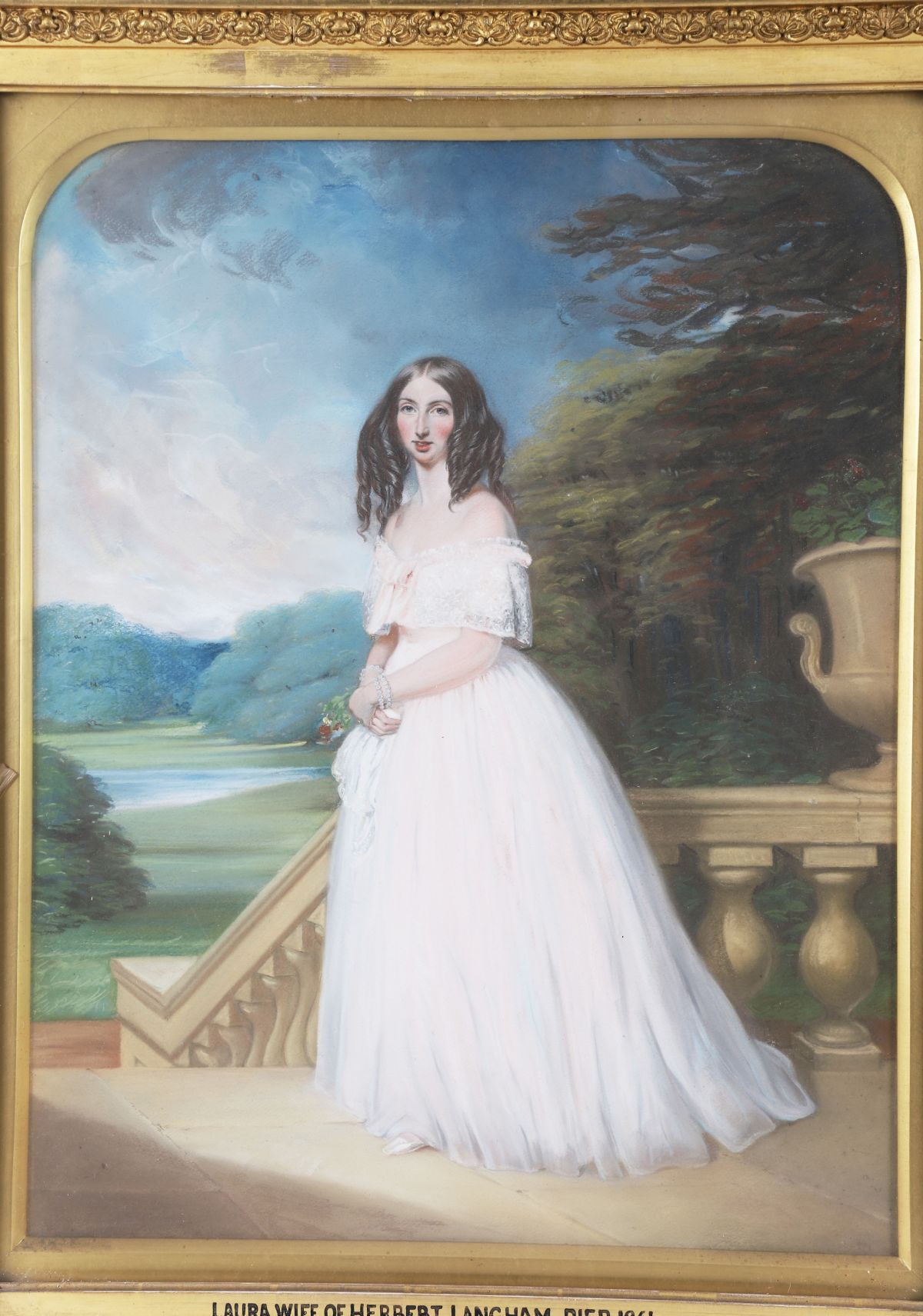 Portrait of Laura Micklethwaite, wearing a white dress and standing on a terrace at Cottesbrooke, arched top in an elaborate gilt plaster frame. Pastel. Literature: See, Masquerier and His Circle, London 1992, p 210. Note: Laura Charlotte Micklethwait married Herbert Langham in 1839. Illustration.