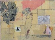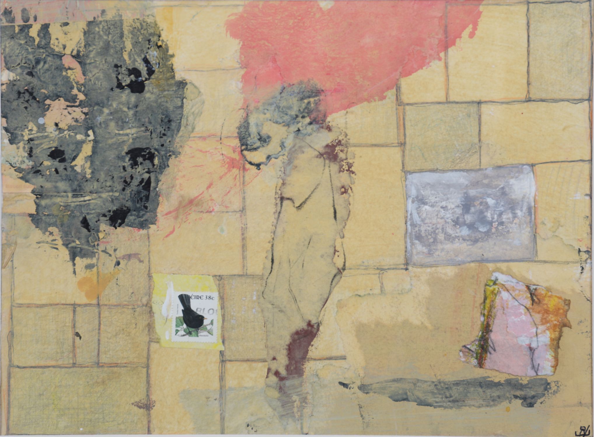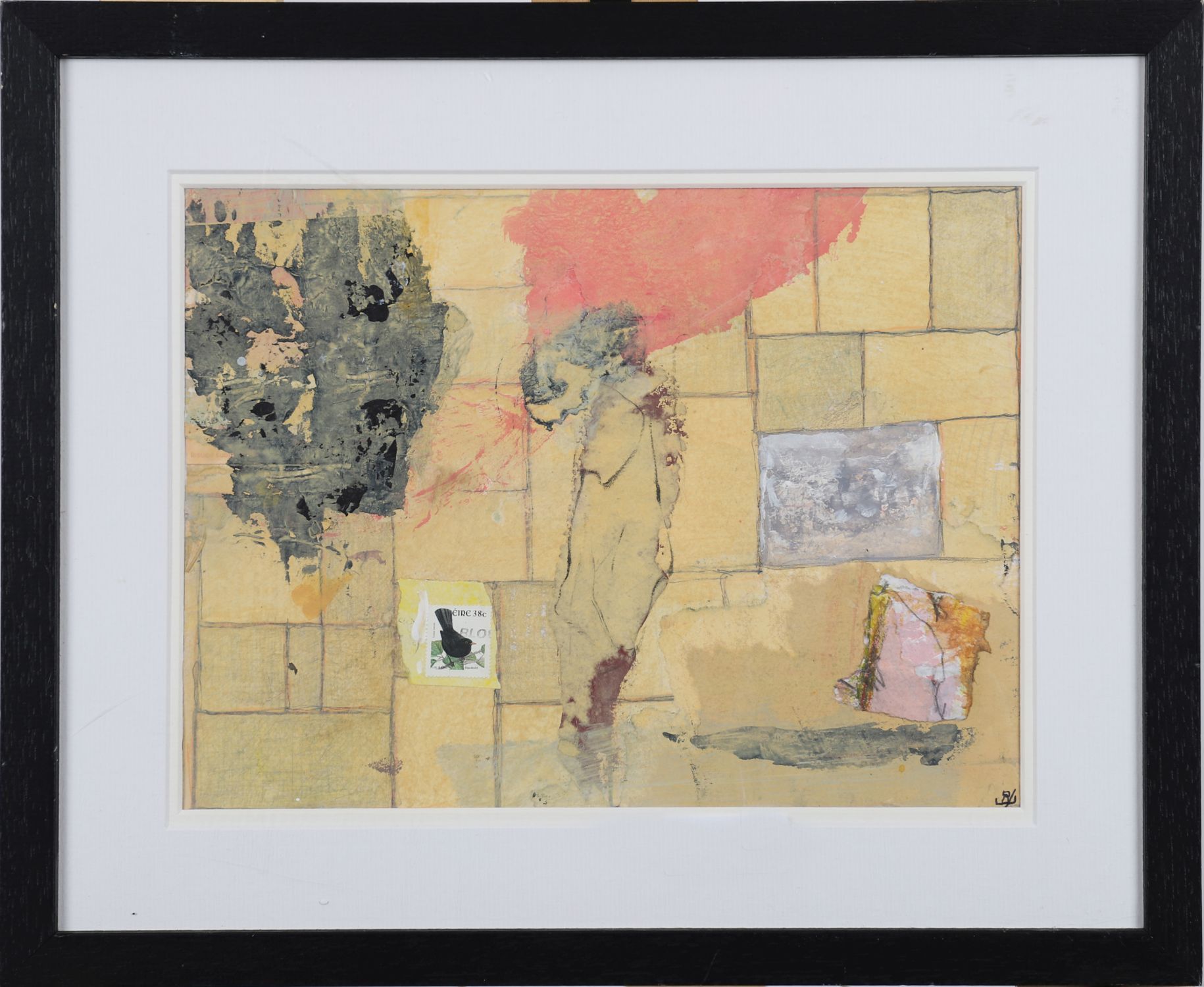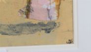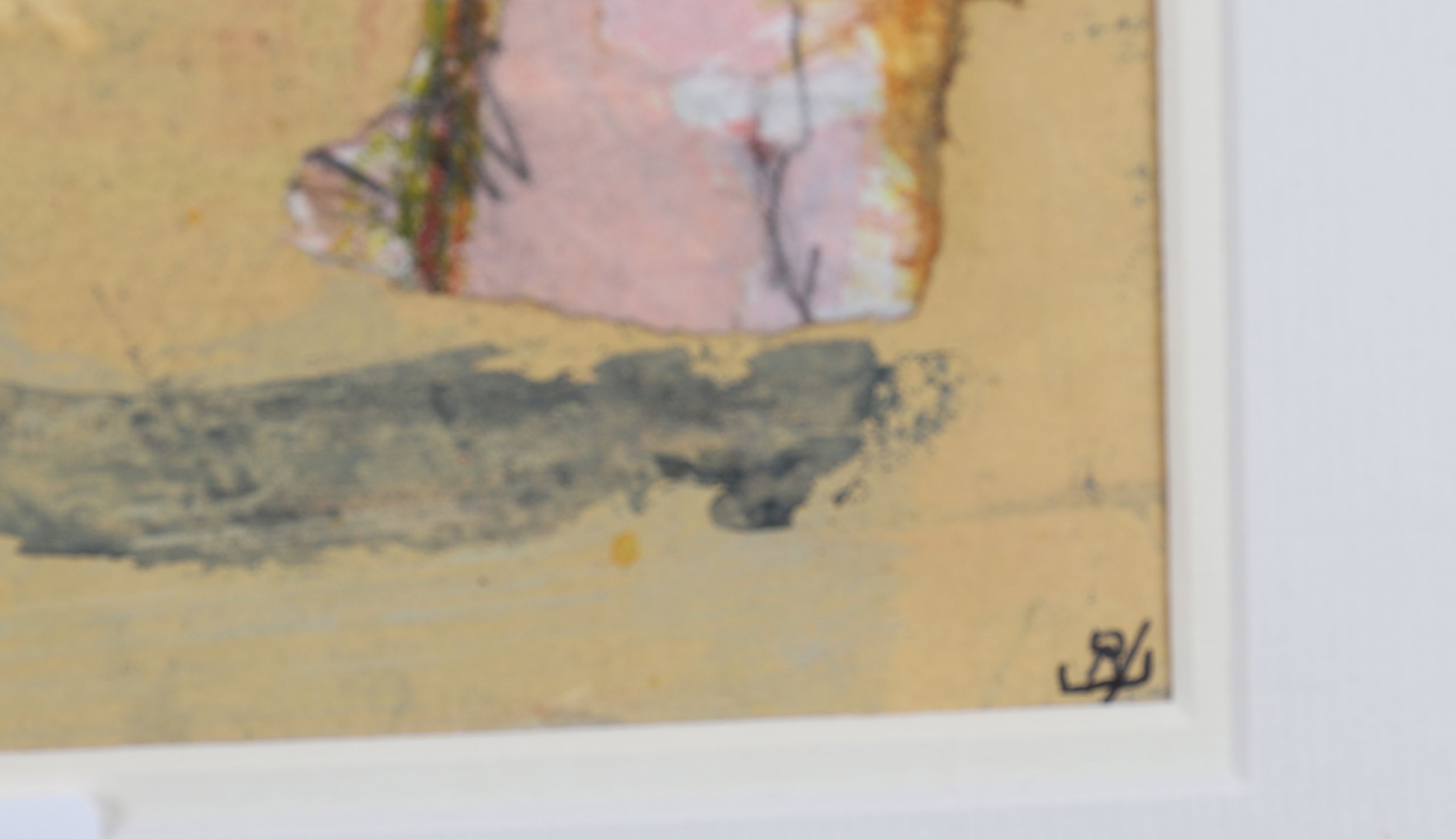 Lot Description: Mixed media abstract composition titled ‘Spanish Grid’, featuring layered textures, muted earth tones, and collaged elements, mounted and framed.