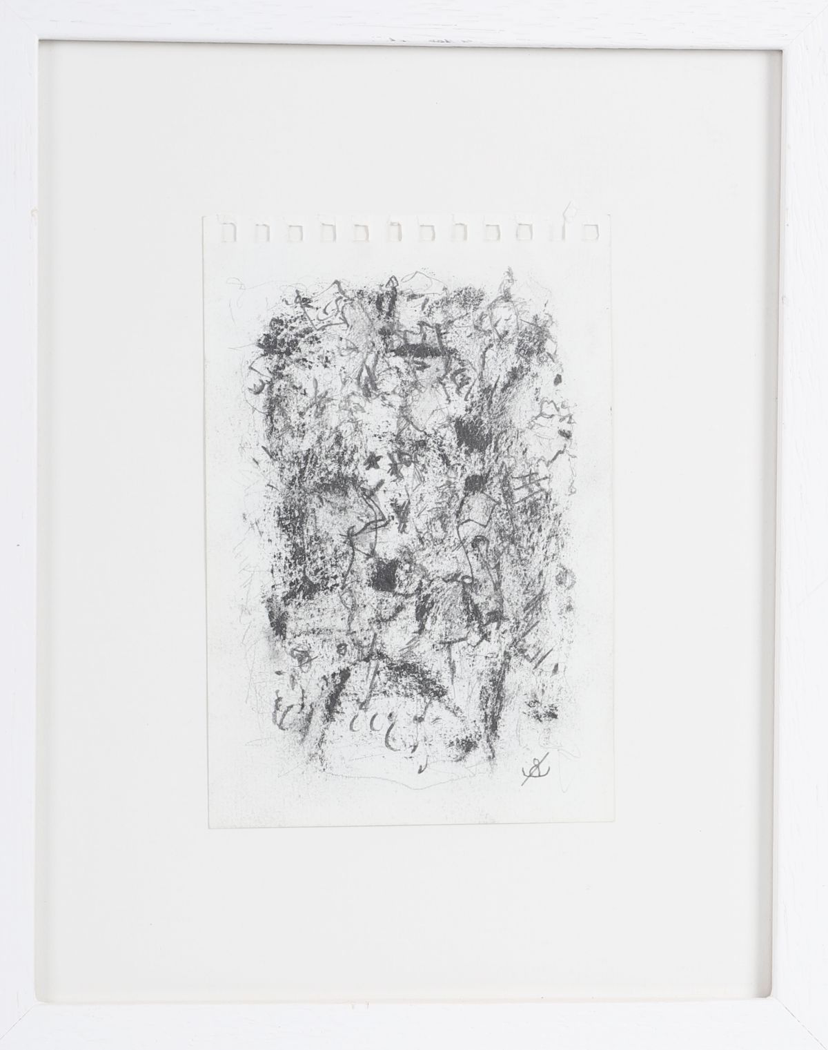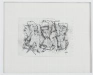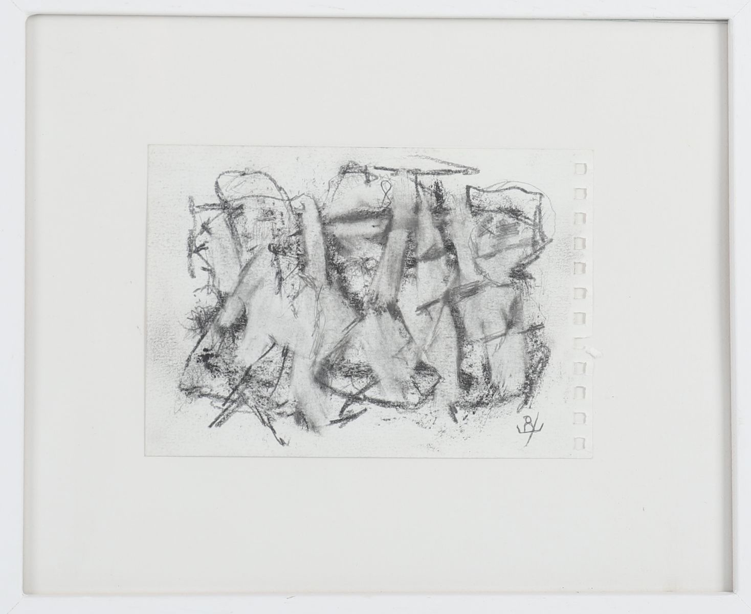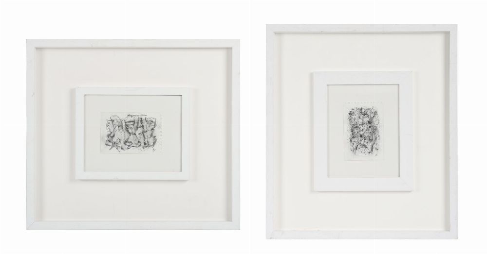 A pair of expressive charcoal drawings, one showing a compact group of abstracted figures and the other a dense organic study. Both sheets are monogrammed and framed individually with deep white mounts.