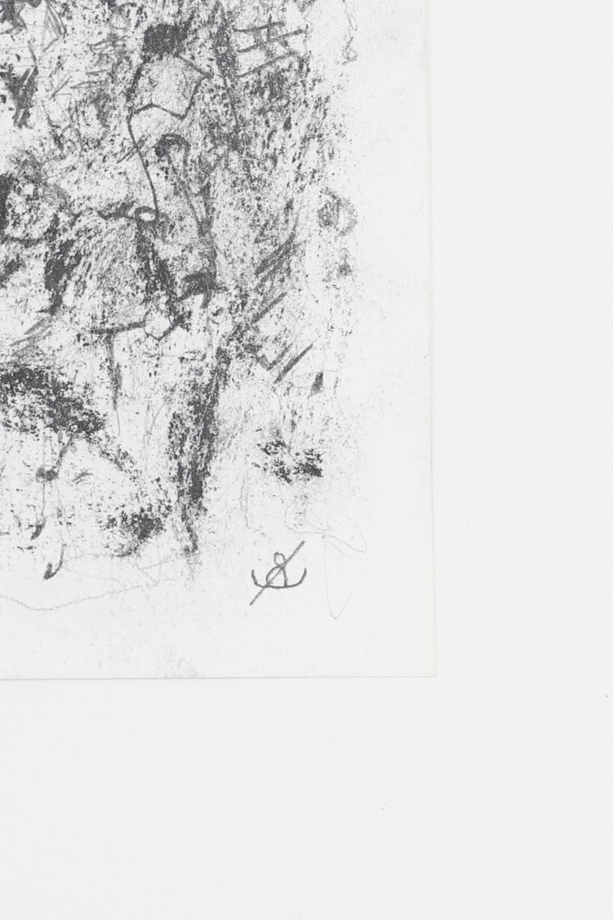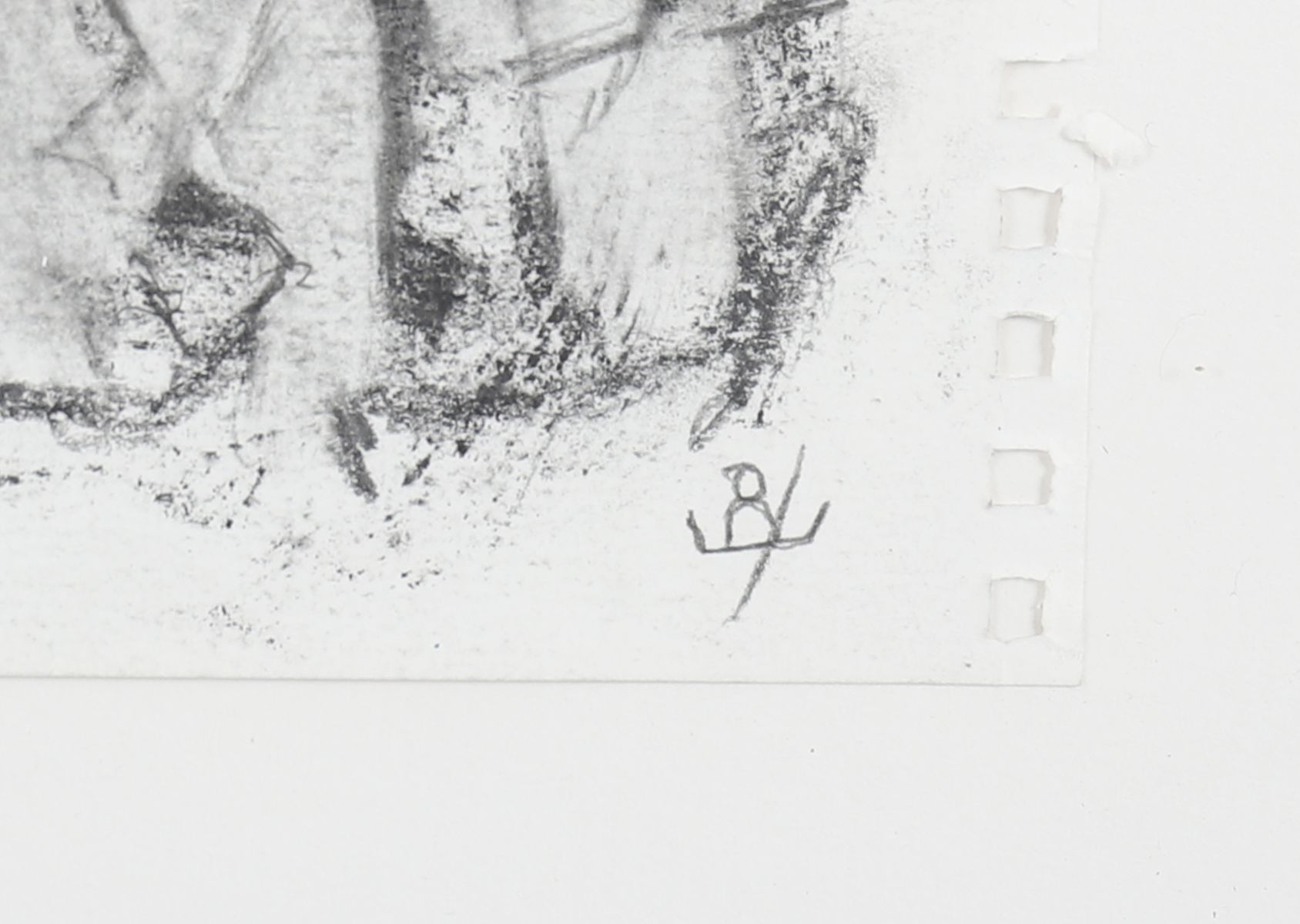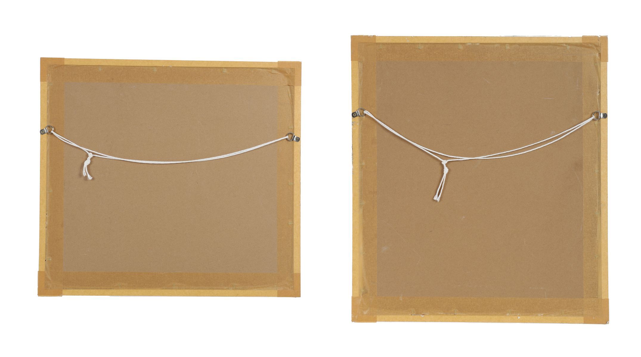 A pair of expressive charcoal drawings, one showing a compact group of abstracted figures and the other a dense organic study. Both sheets are monogrammed and framed individually with deep white mounts.