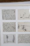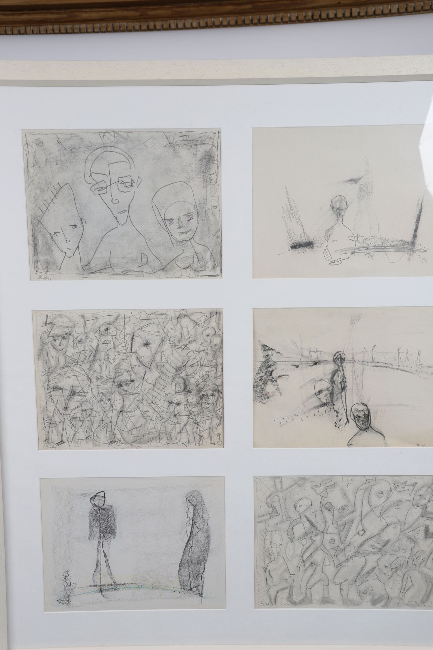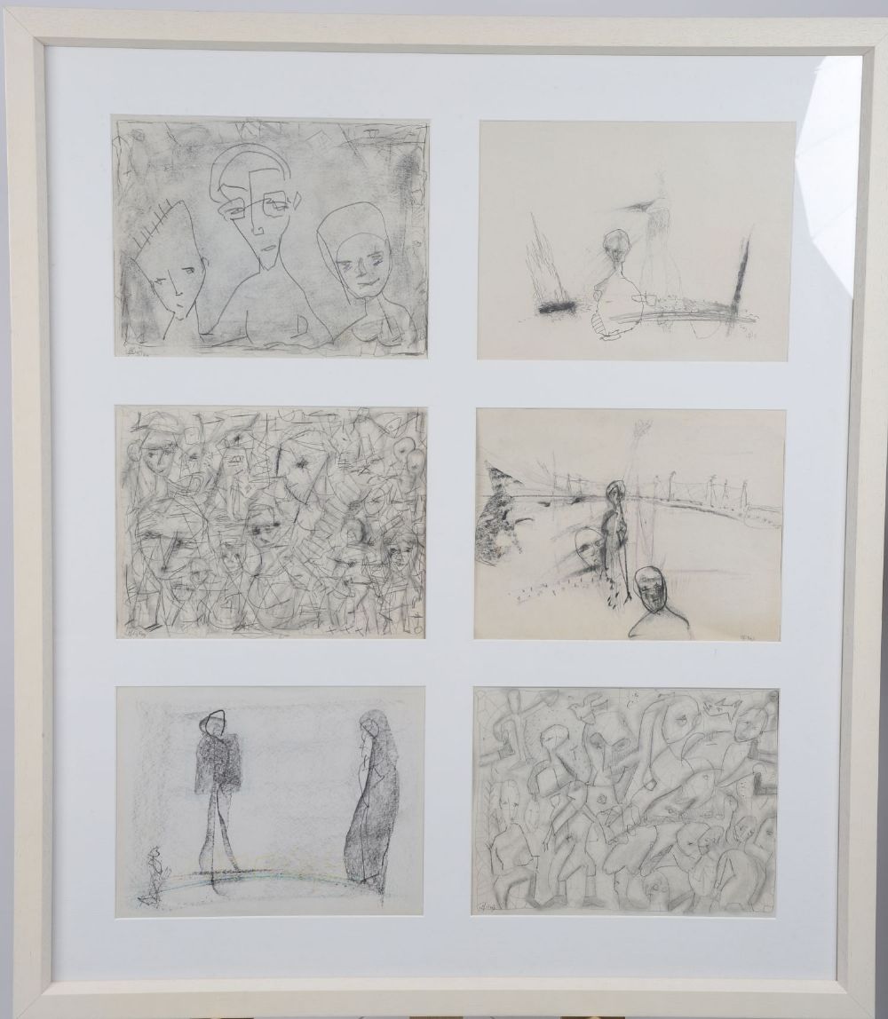 A striking suite of six abstract figurative drawings by Irish artist John Kingerlee, presented together in a modern white frame. Executed in pencil and graphite on paper, each sketch explores the human form through layered linework and expressionist distortion. The works range from dense, near-chaotic compositions to sparse, introspective figures, characteristic of Kingerlee's distinctive, intuitive approach. Thematically resonant with ideas of memory, displacement, and inner states, the group offers insight into the artist's raw and gestural mark-making.