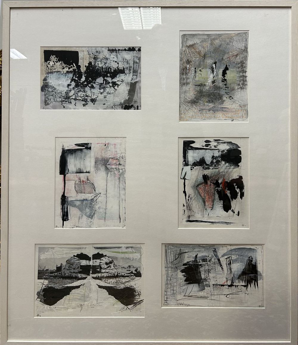 A striking suite of six mixed media works on paper by renowned Irish artist John Kingerlee. Each composition features Kingerlee’s characteristic layering, mark-making, and abstract forms, with a dynamic interplay of line, tone, and texture. The works explore a restrained yet expressive palette—blacks, greys, whites, and occasional hints of red—reflecting the artist’s interest in memory, perception, and unconscious structure. Presented in a unified white frame and mount. Each piece bears Kingerlee’s distinct hand, with a gestural and intuitive approach to surface and form.