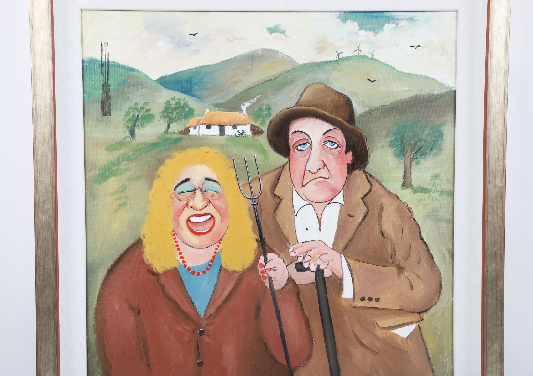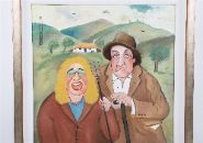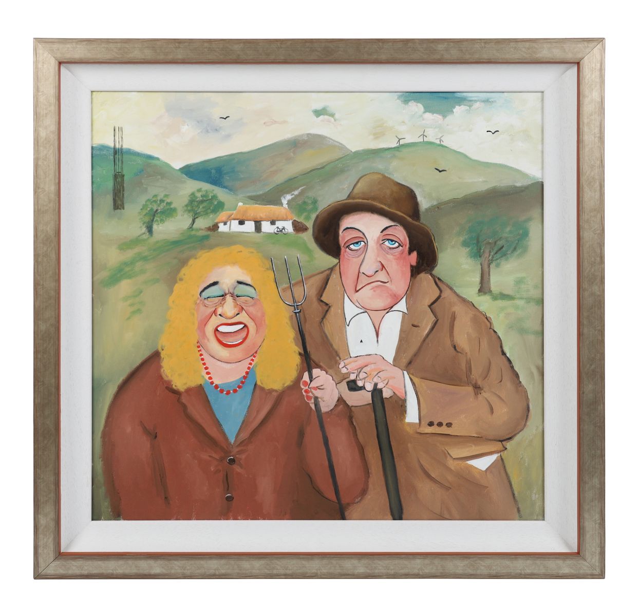 Oil on canvas, A humorous rural portrait of a farmer and his wife before a mountainous backdrop, painted in Schwatschke’s distinctive satirical style. The exaggerated expressions and earthy palette lend the work a blend of caricature and affection typical of the artist’s social observation. Monogrammed.
