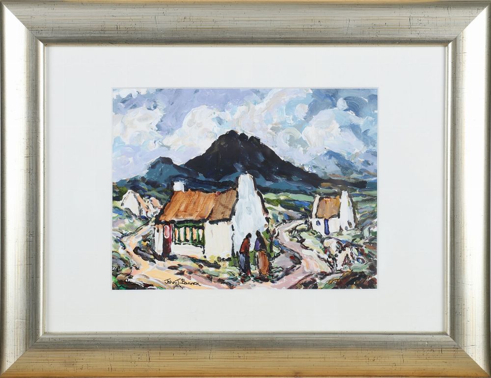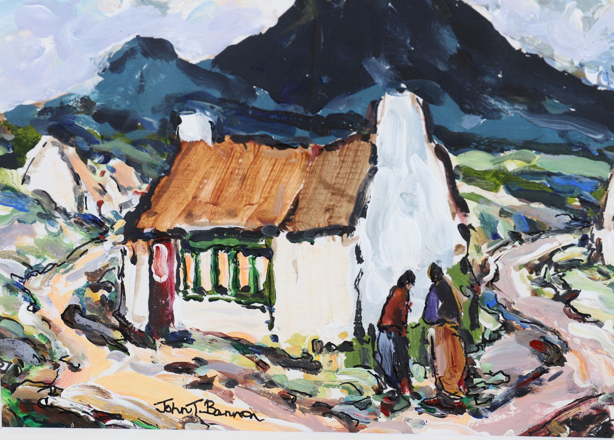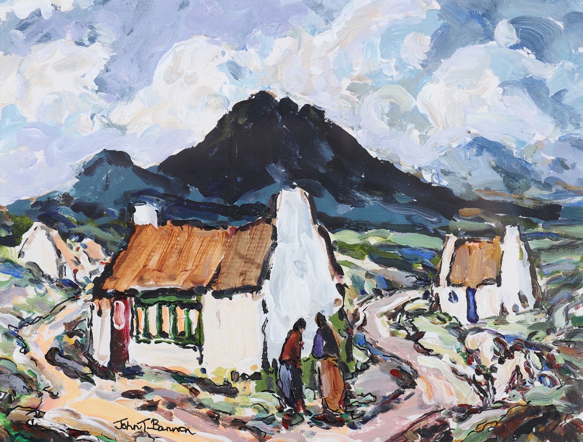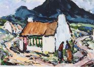 Description: A lively expressionist depiction of Irish cottages with thick impasto brushwork and vibrant, swirling skies. Signed lower right.