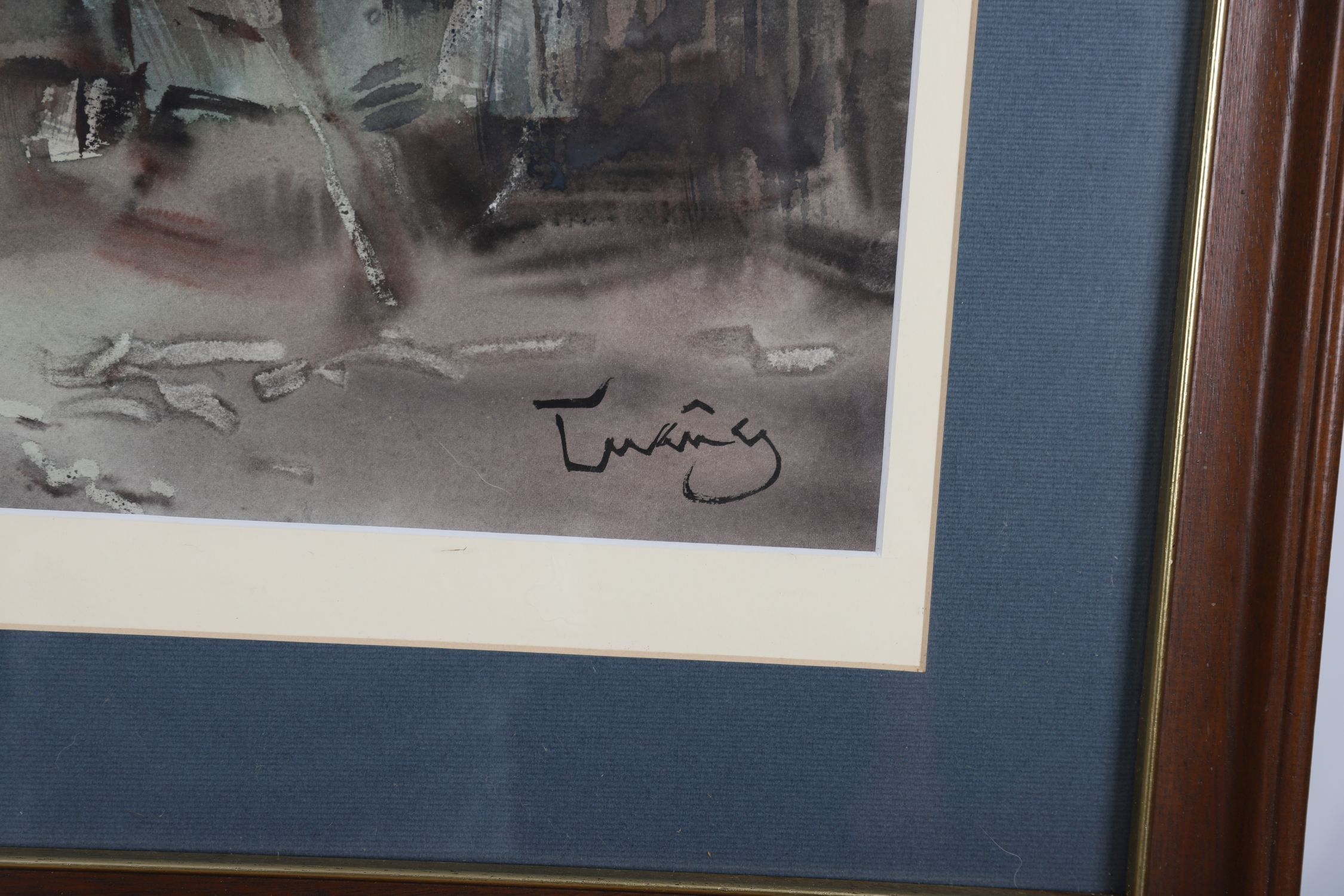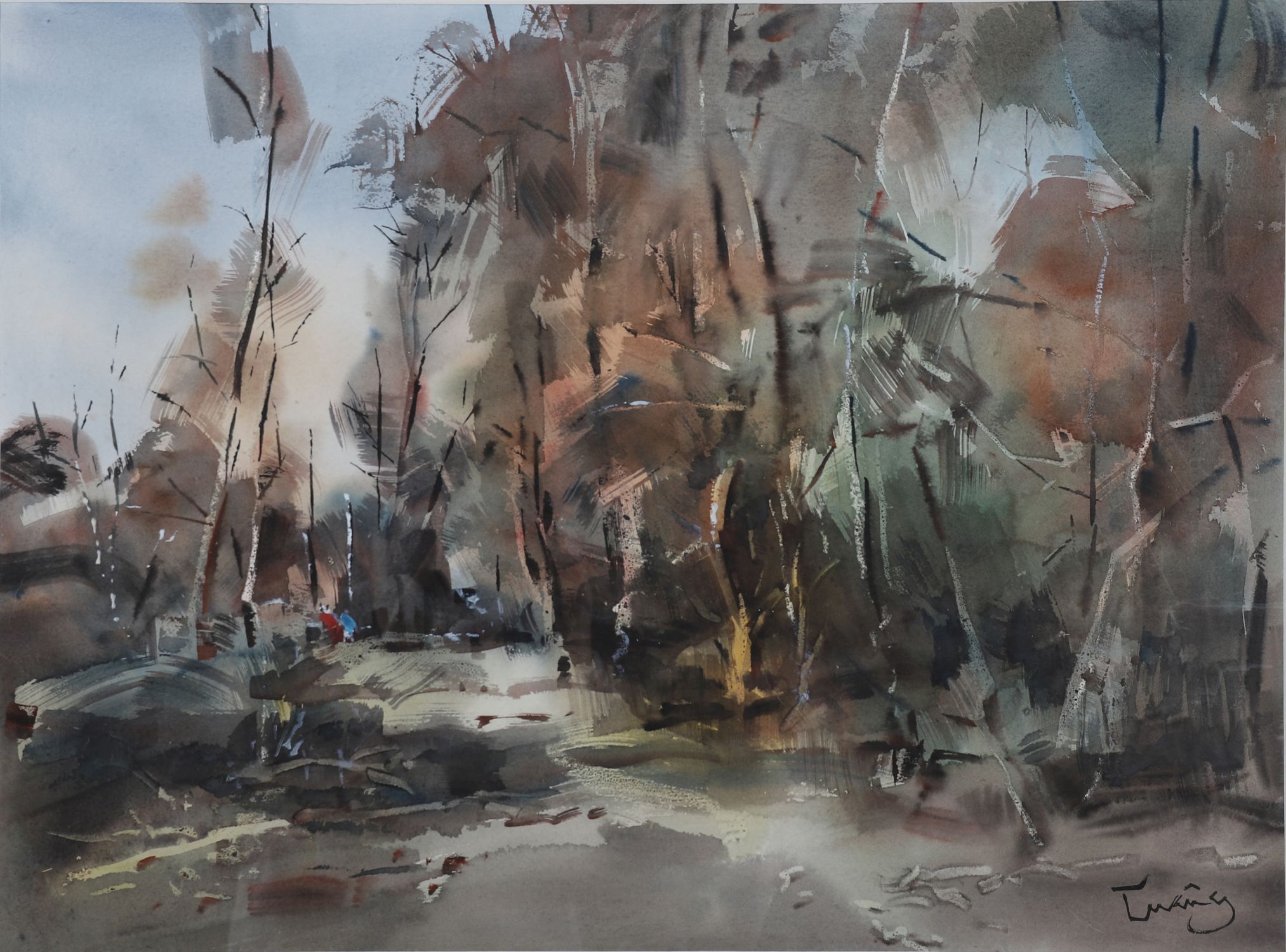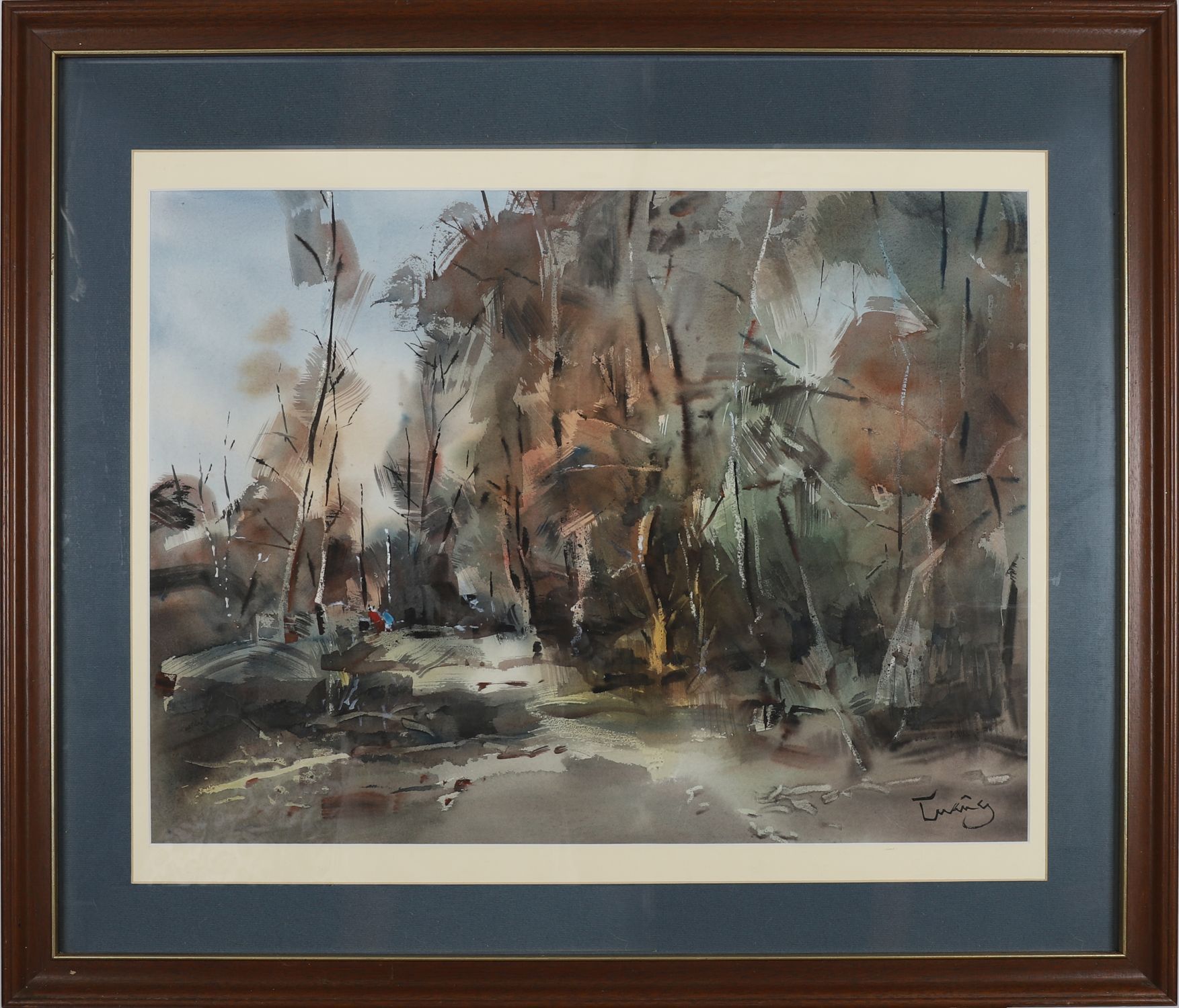 Watercolour, depicting a woodland scene with figures on a pathway. Signed lower right. Mounted and framed. Watercolour.