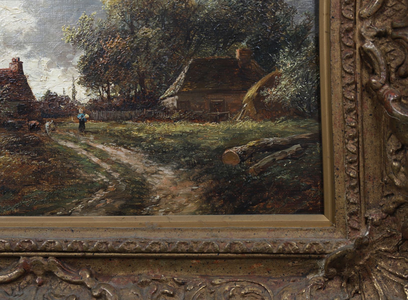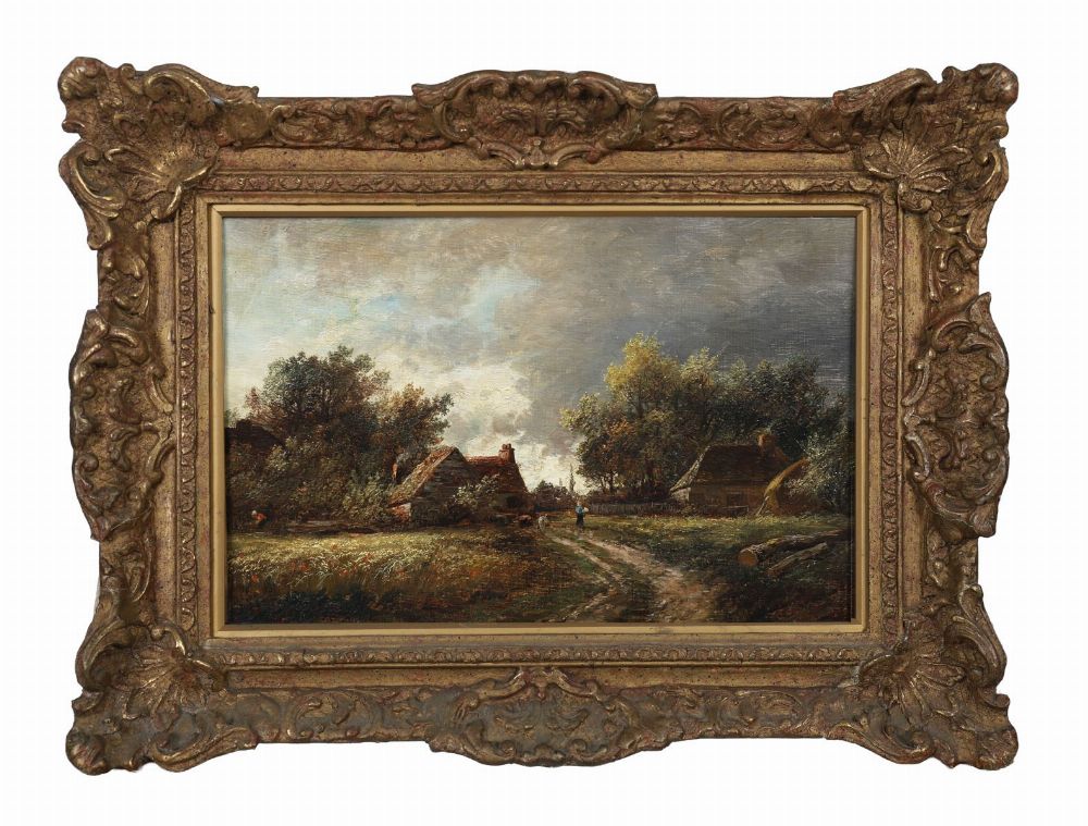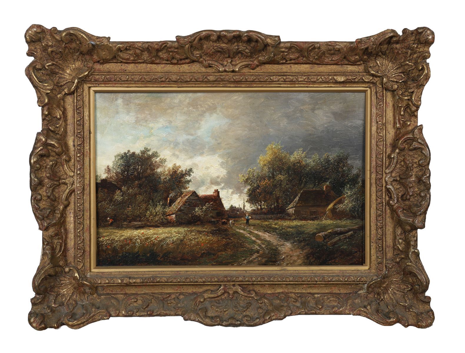 Tranquil rural landscape depicting a lone figure walking along a wooded track with cottages beyond. Oil on panel. Presented in a gilt frame.