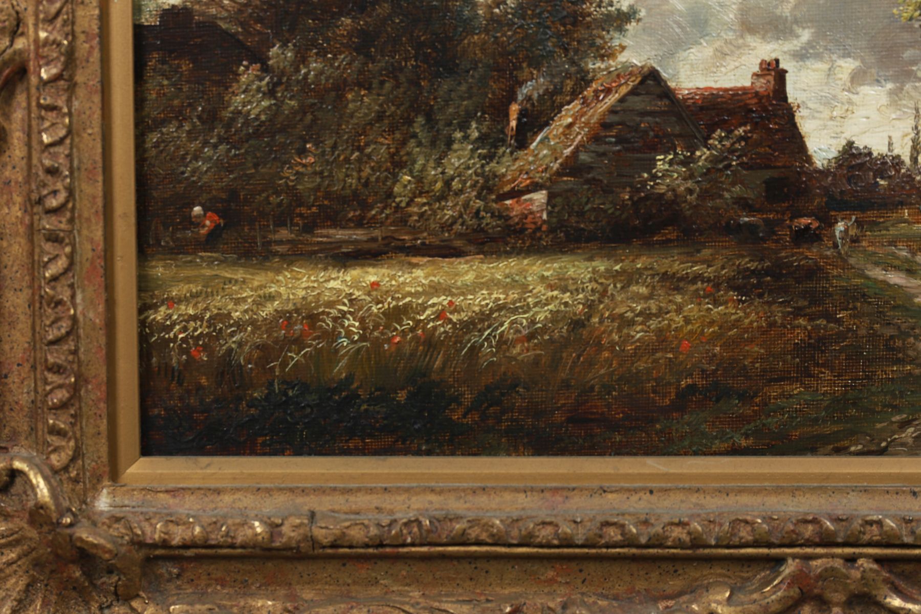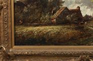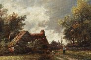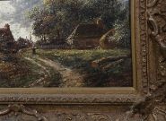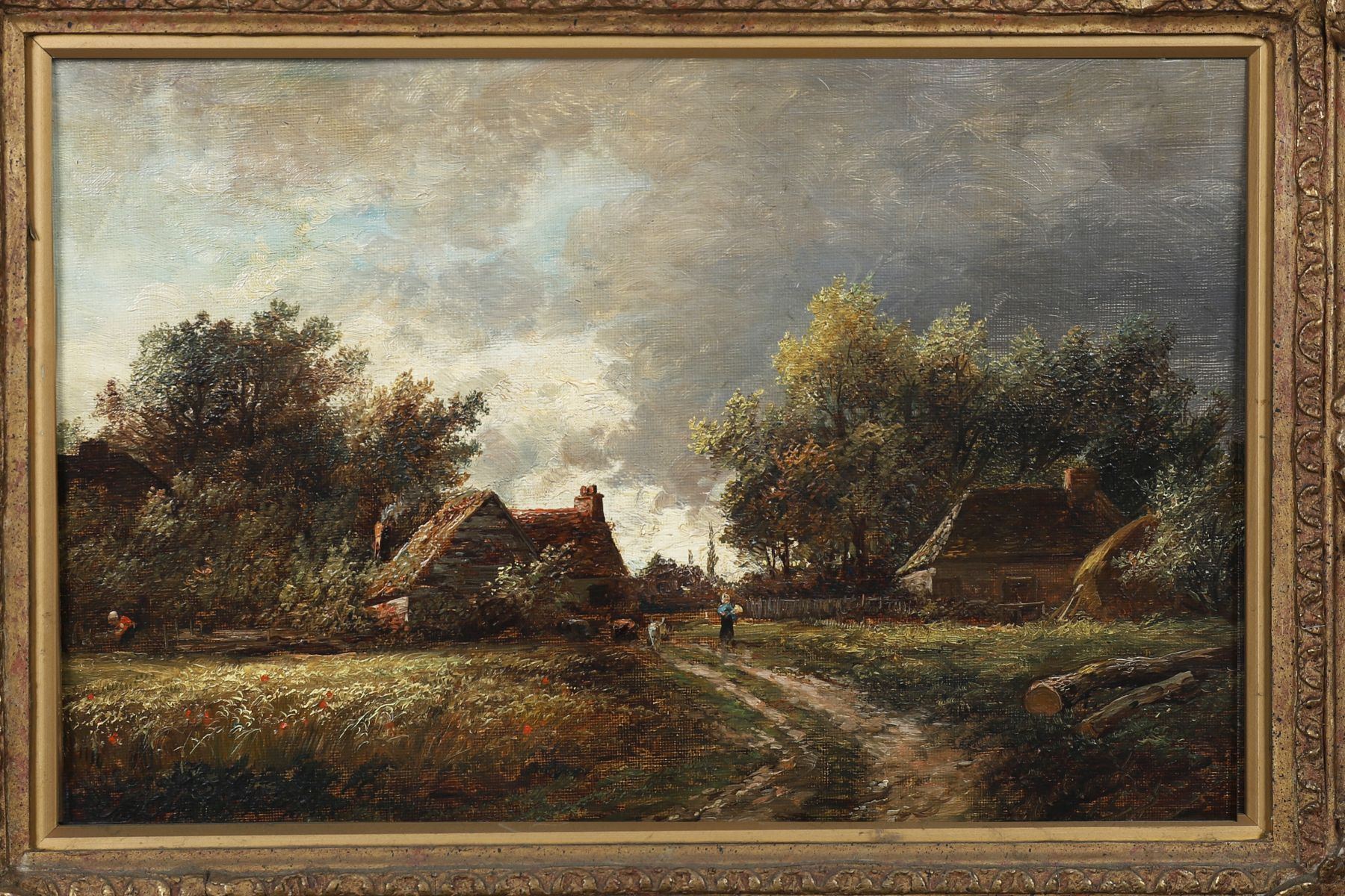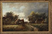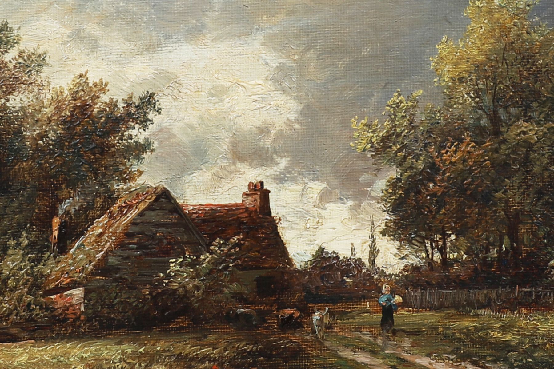 Tranquil rural landscape depicting a lone figure walking along a wooded track with cottages beyond. Oil on panel. Presented in a gilt frame.
