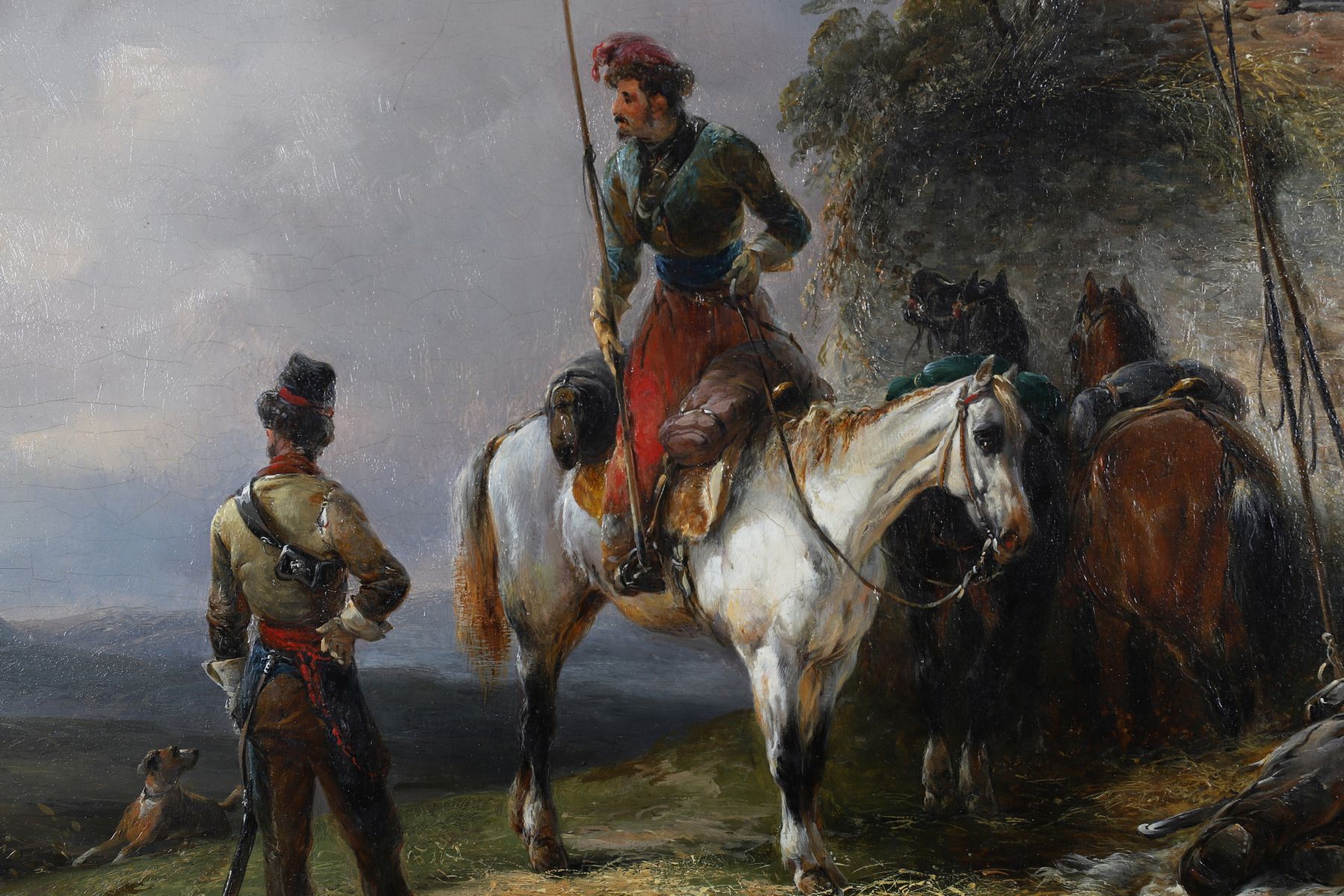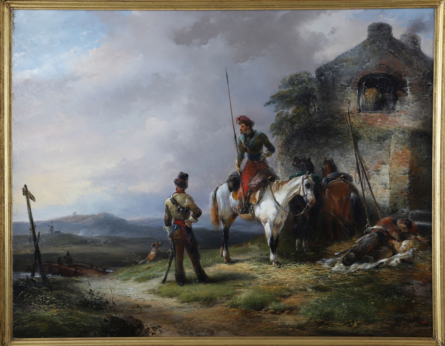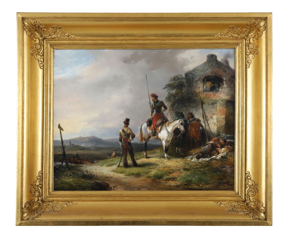 Historical scene depicting Cossack soldiers resting and conversing beside a stone building, one tending to a wounded comrade. Oil on panel, signed lower right. Presented in a gilt frame.