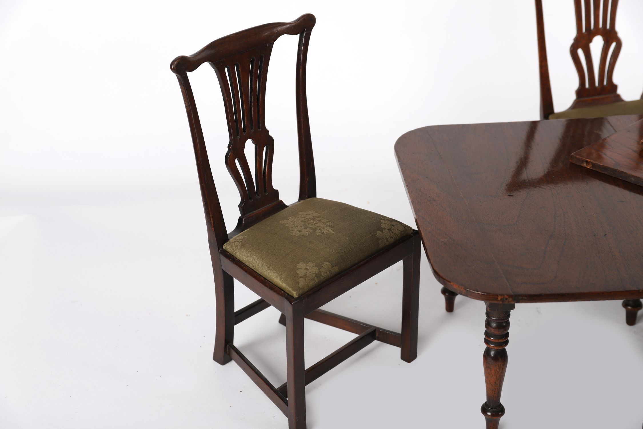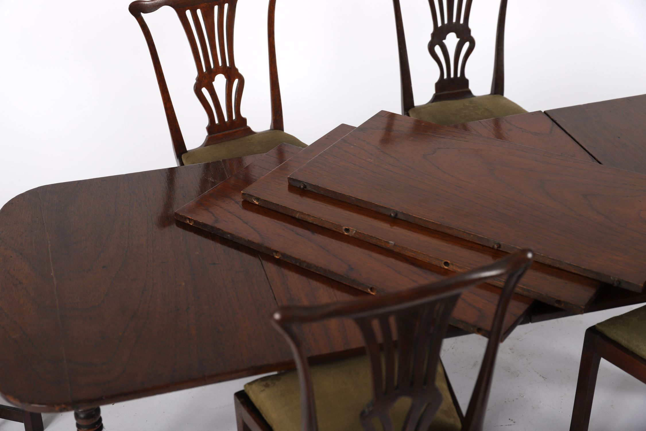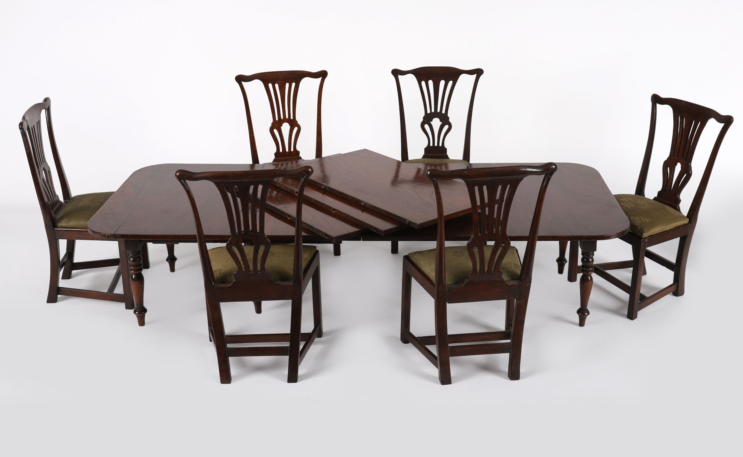 An exceptional journeyman's model of a Regency period dining suite, comprising a D-end extending table and six matching chairs with shaped splats and upholstered seats, all in finely grained timber. The table with extending leaves and turned legs.