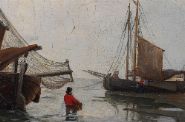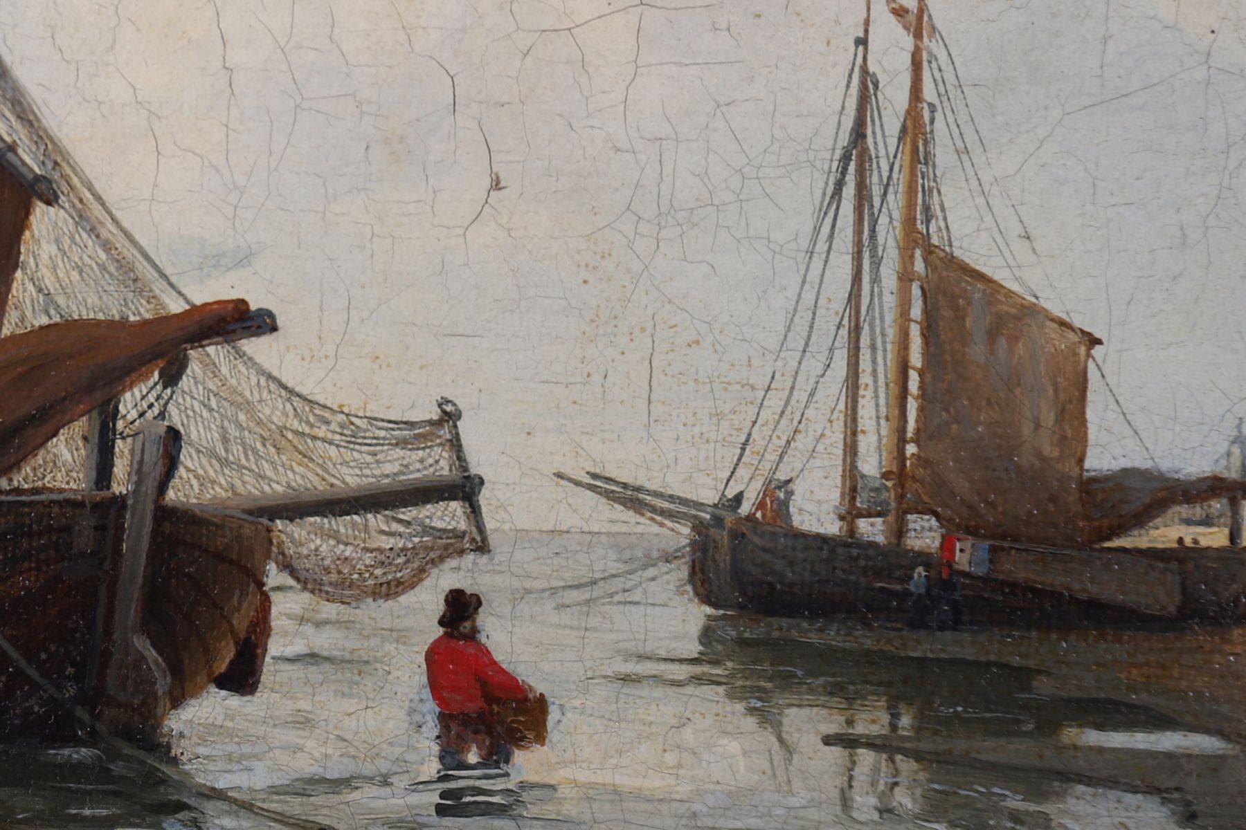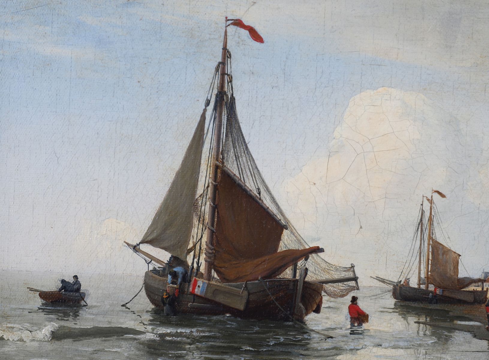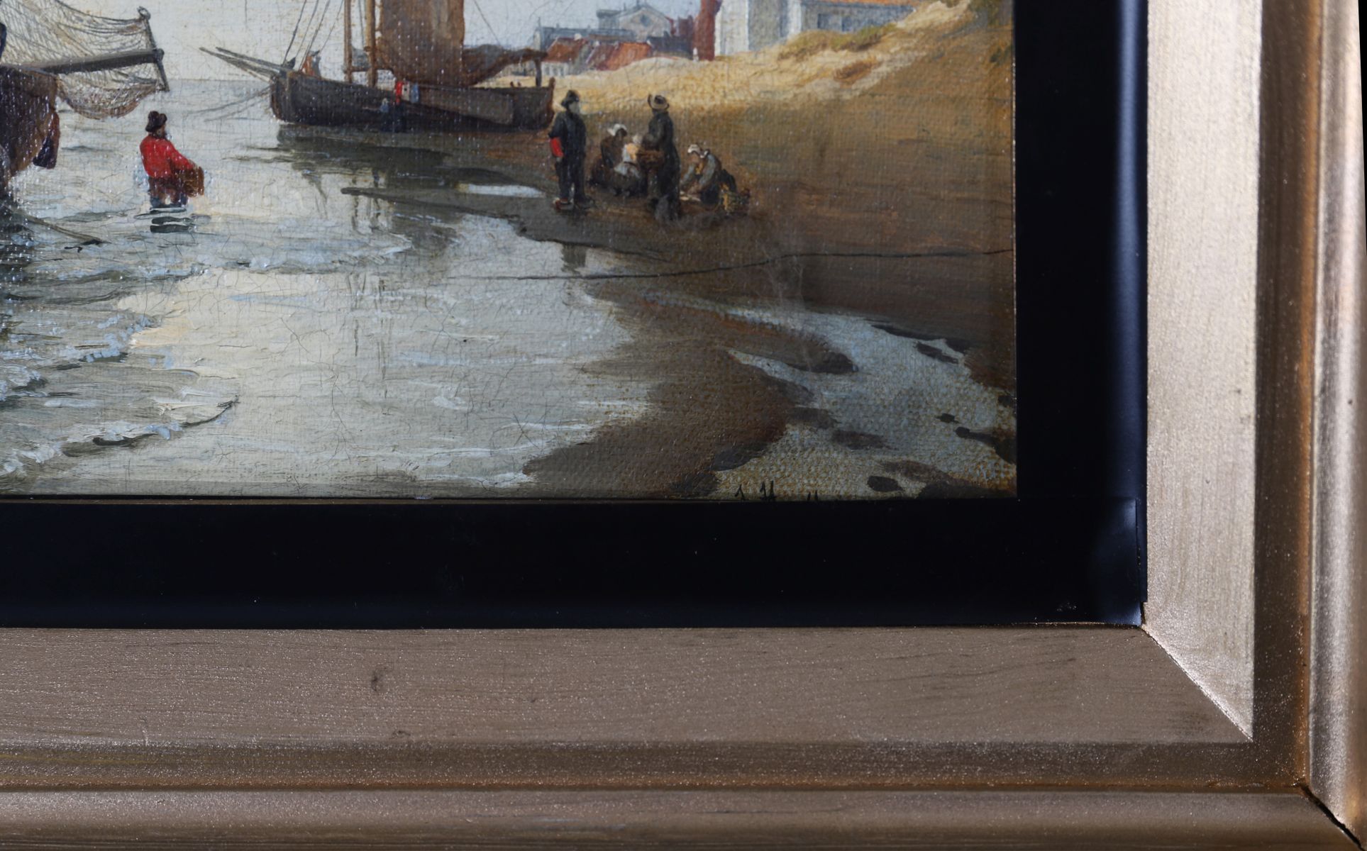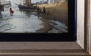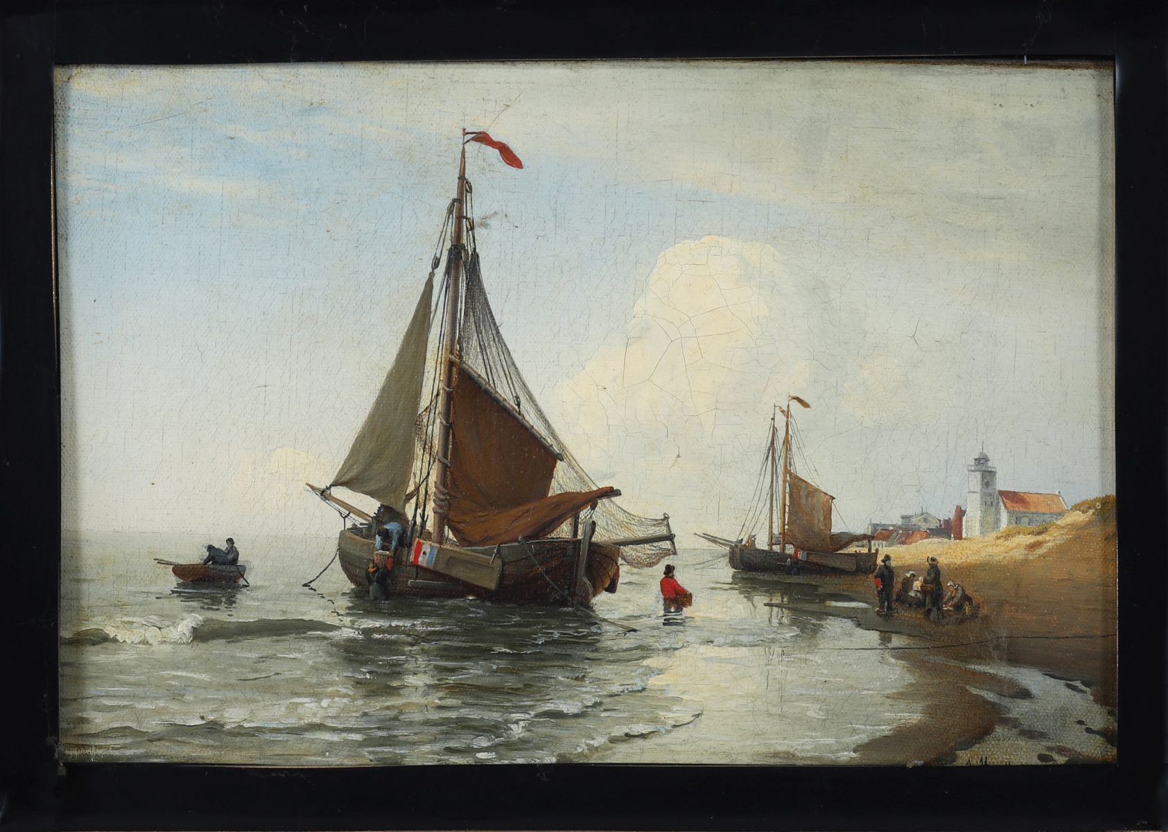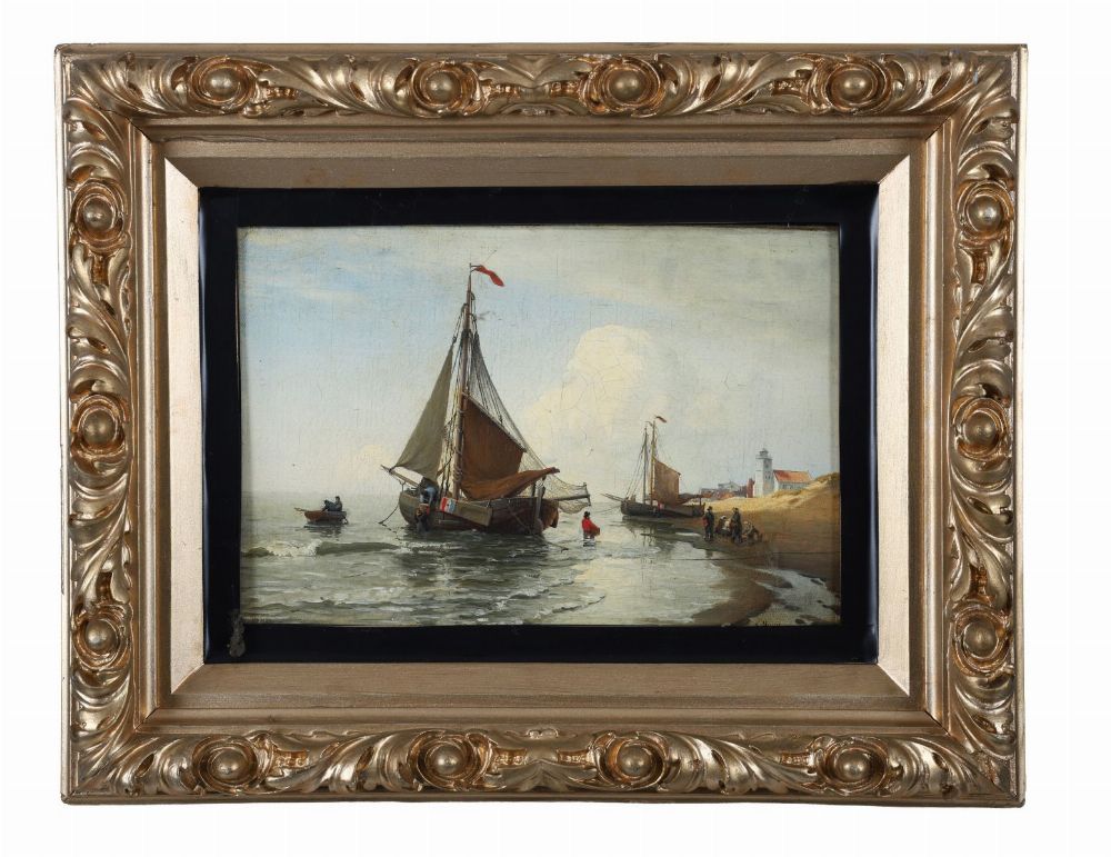 A lively coastal scene showing fishermen unloading their boats on the beach near Katwijk, with sailboats and a lighthouse beyond. Oil on canvas, signed lower right. Presented in a carved gilt frame.