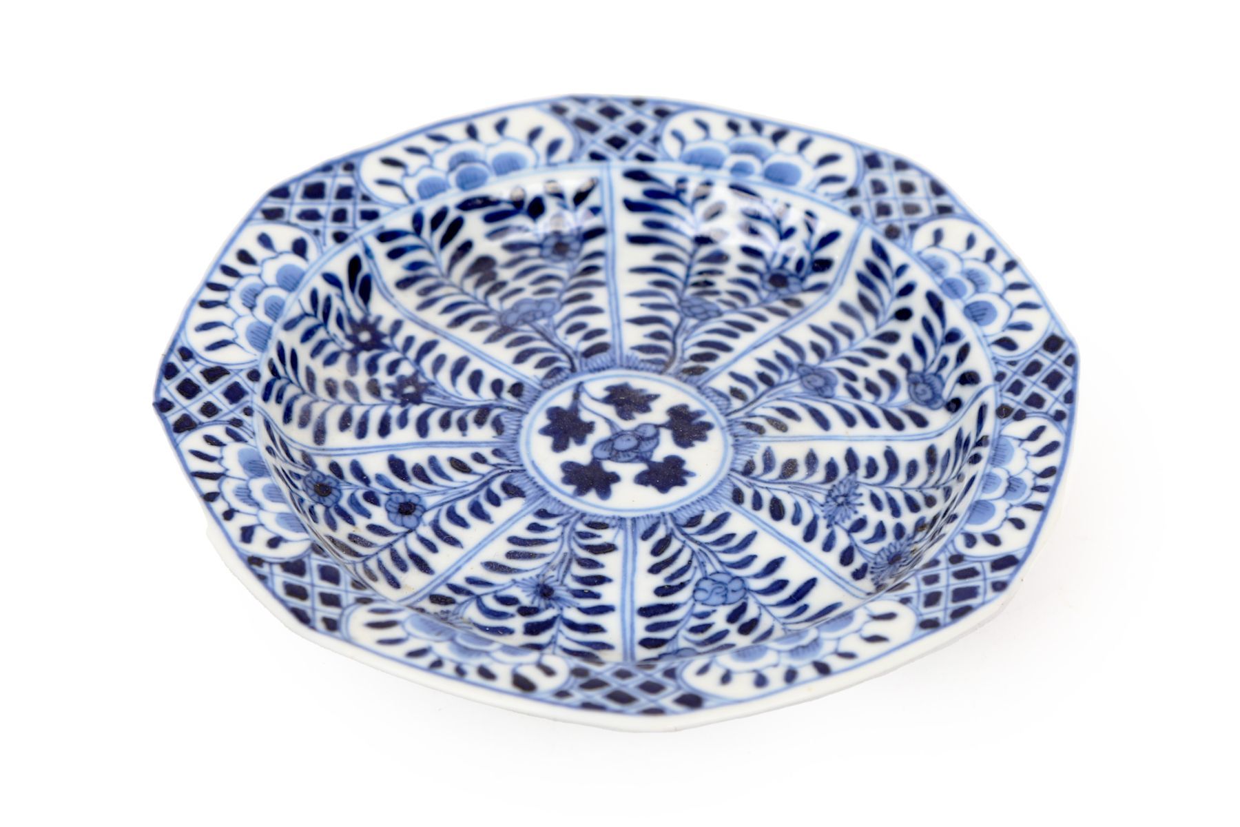 Octagonal-section plate painted in underglaze blue with stylised floral panels and geometric borders, the form and decoration associated with the Kangxi period.