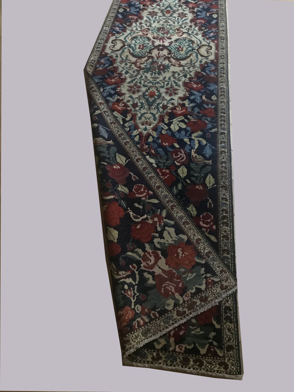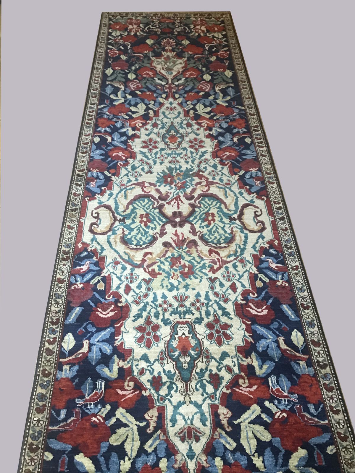 Blue field decorated with an elongated medallion and bird and foliate decoration, enclosed by an ivory border.