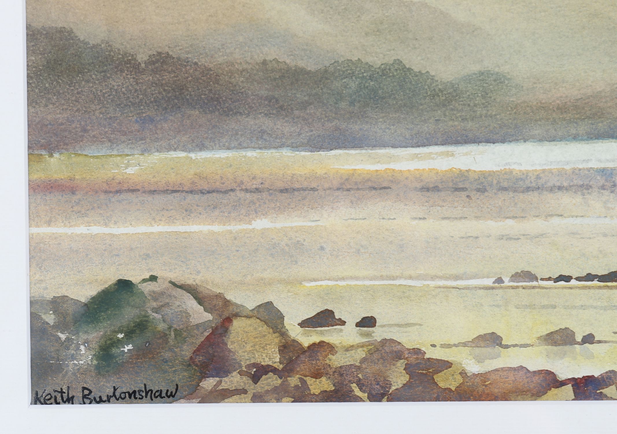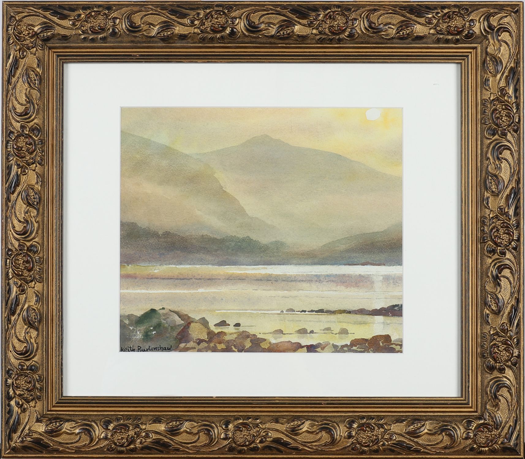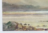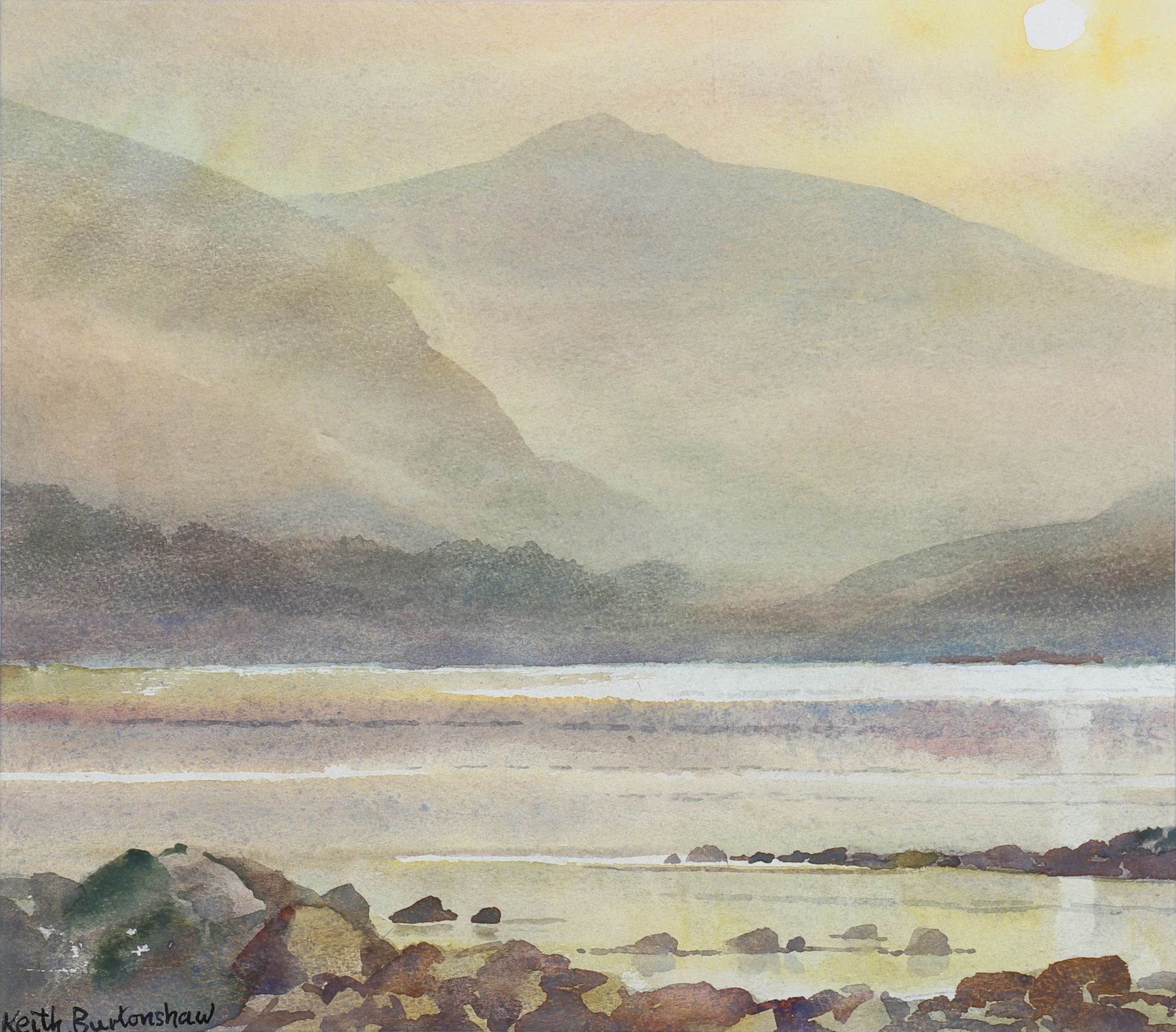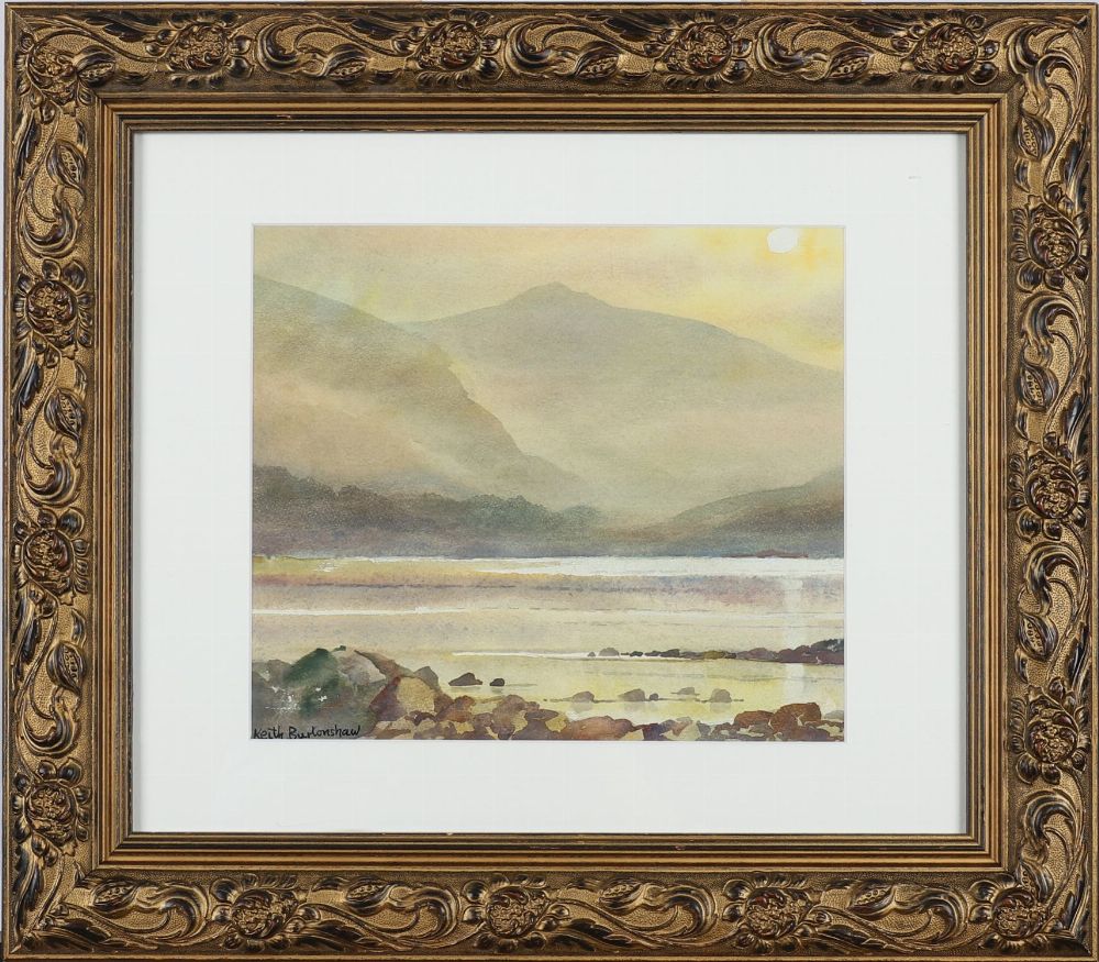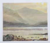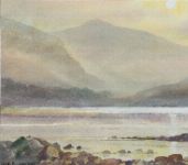 Description: A moody watercolour of layered Connemara mountains and low evening sun. Gentle tones and soft gradations. Signed lower left.