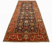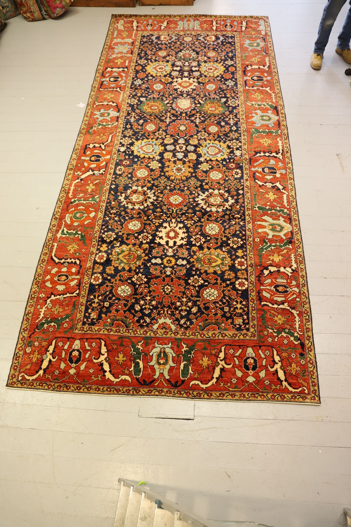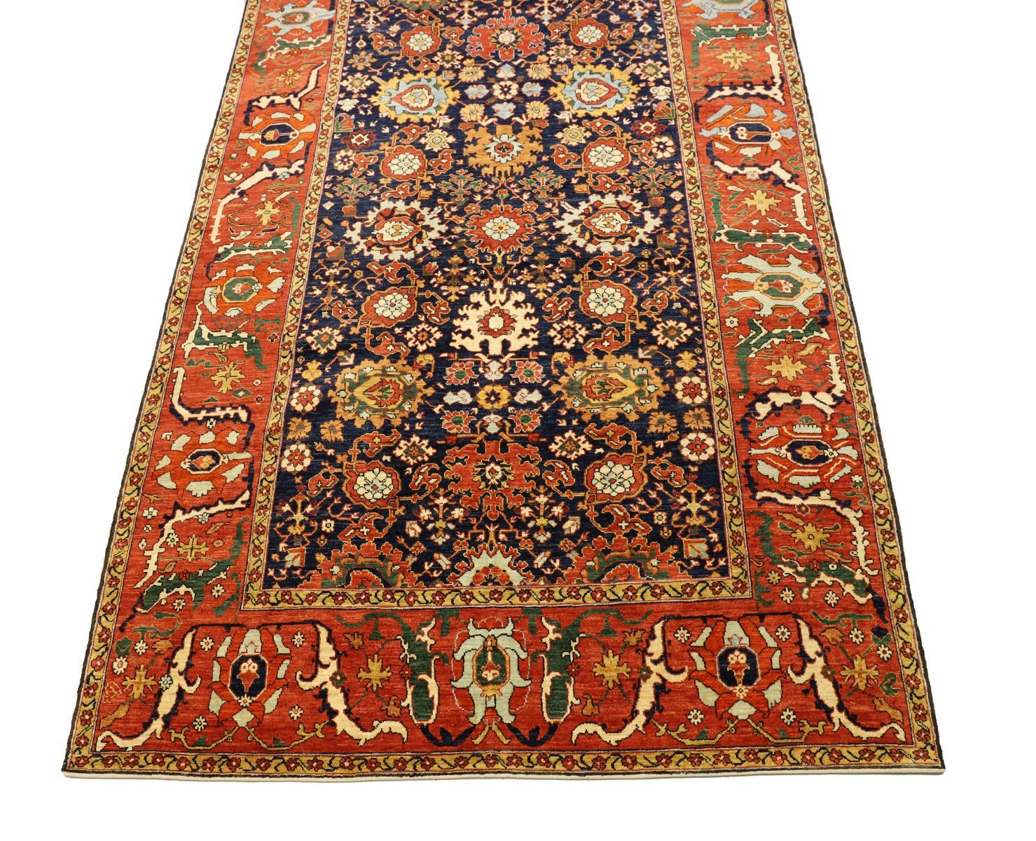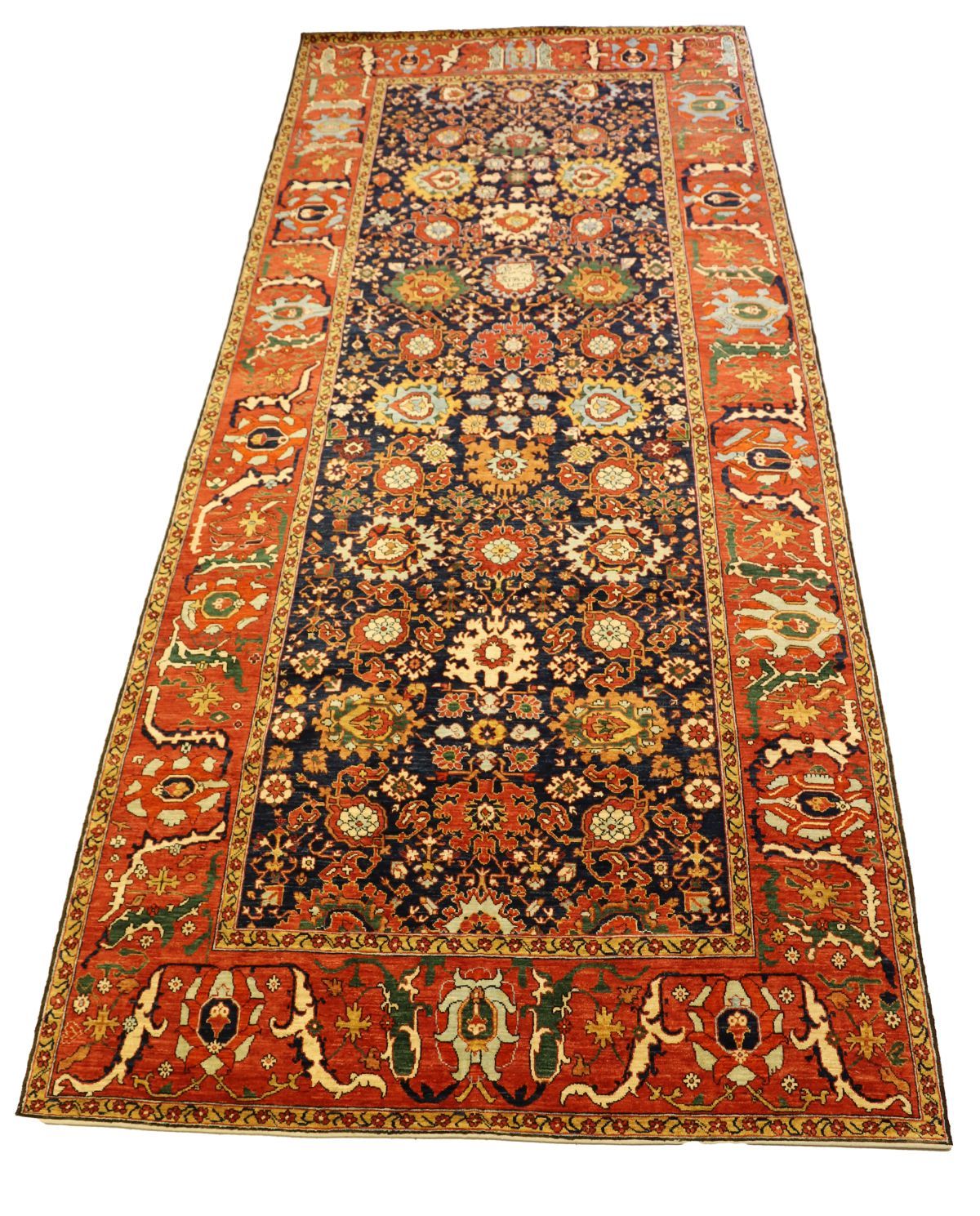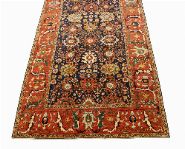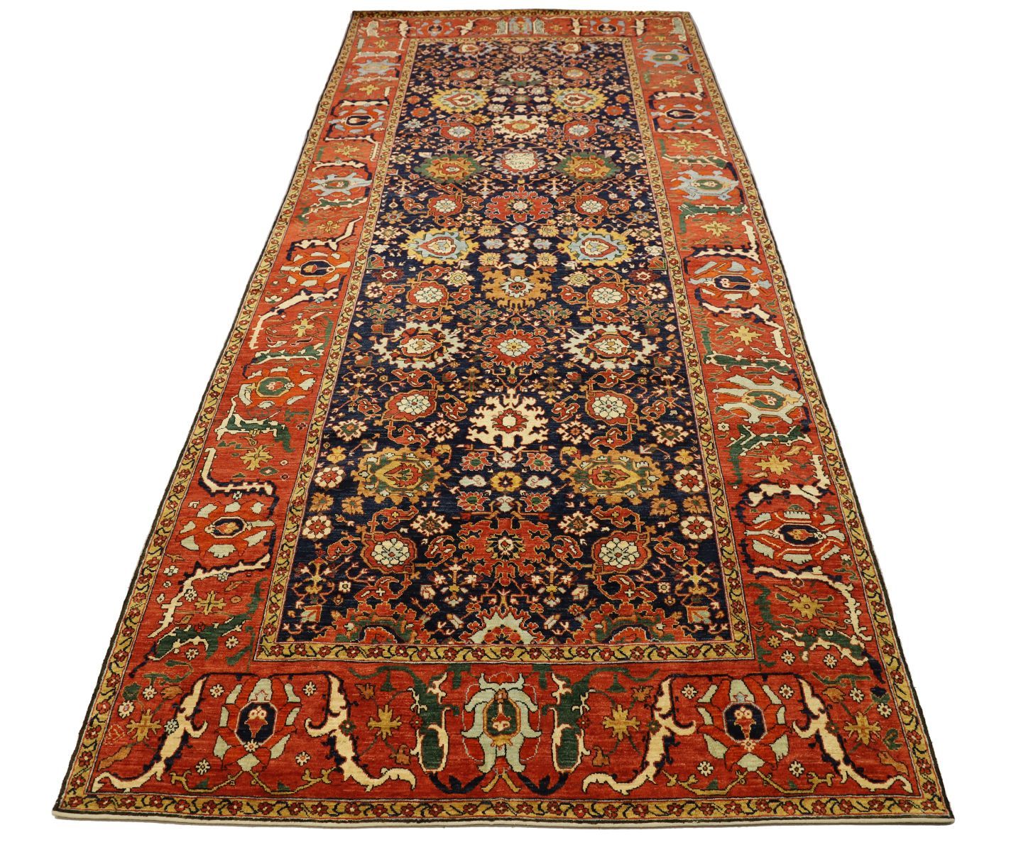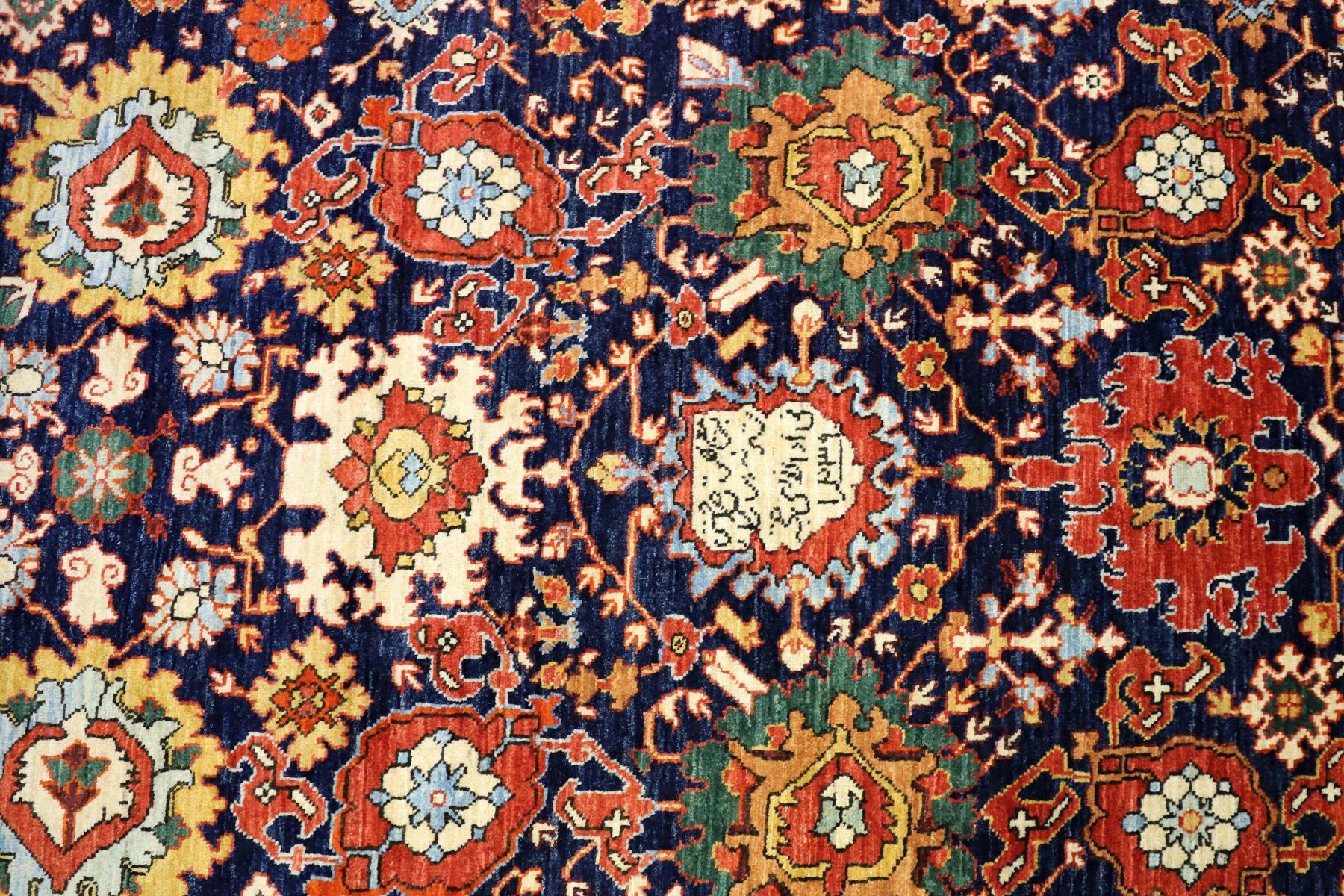 deep navy blue field densely decorated with stylised floral rosettes enclosed by a red border decorated with botanical and floral motifs.