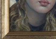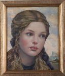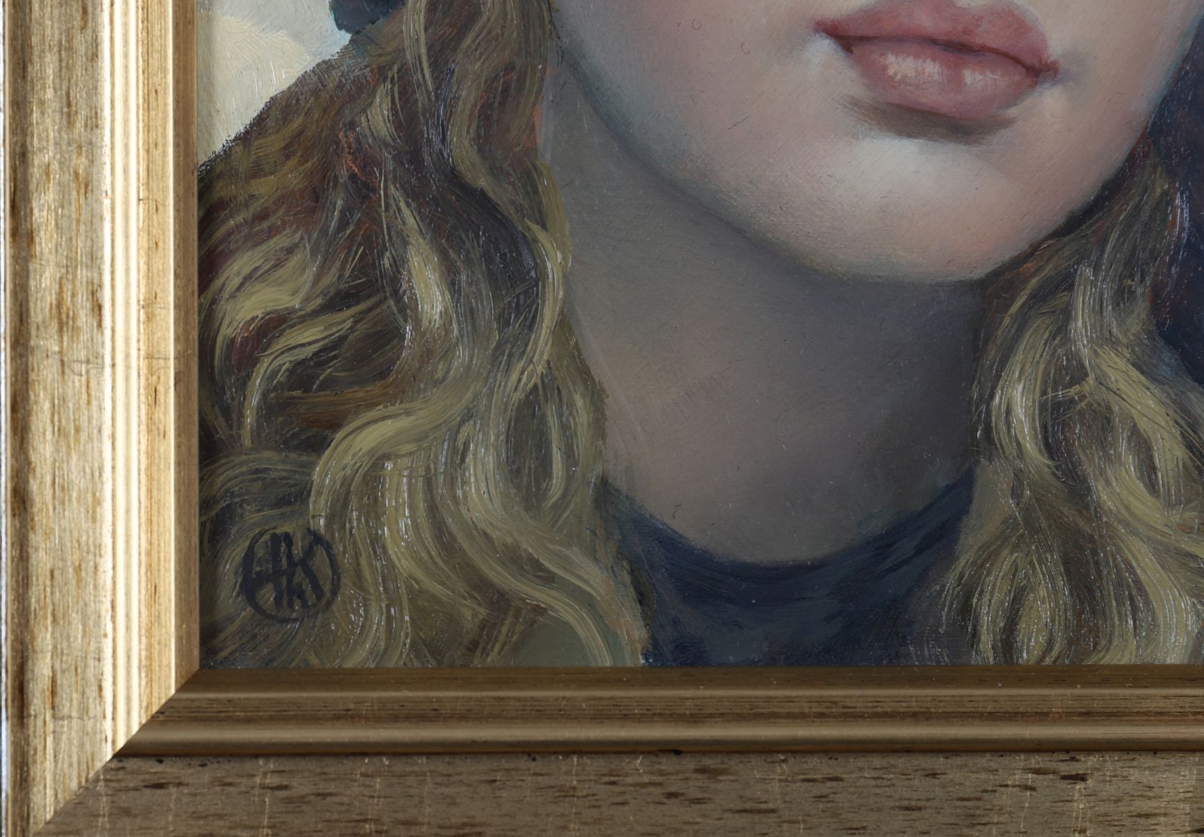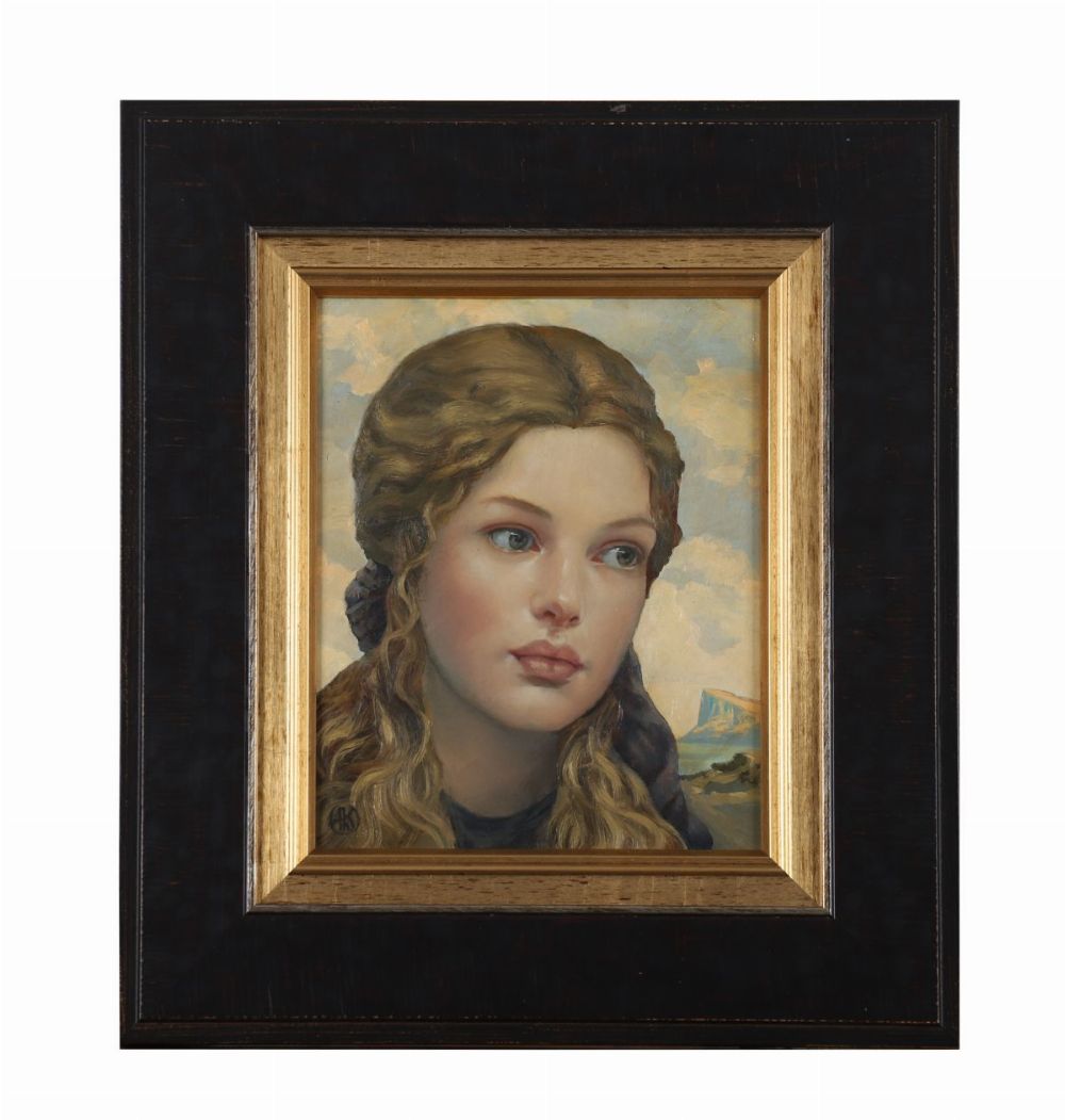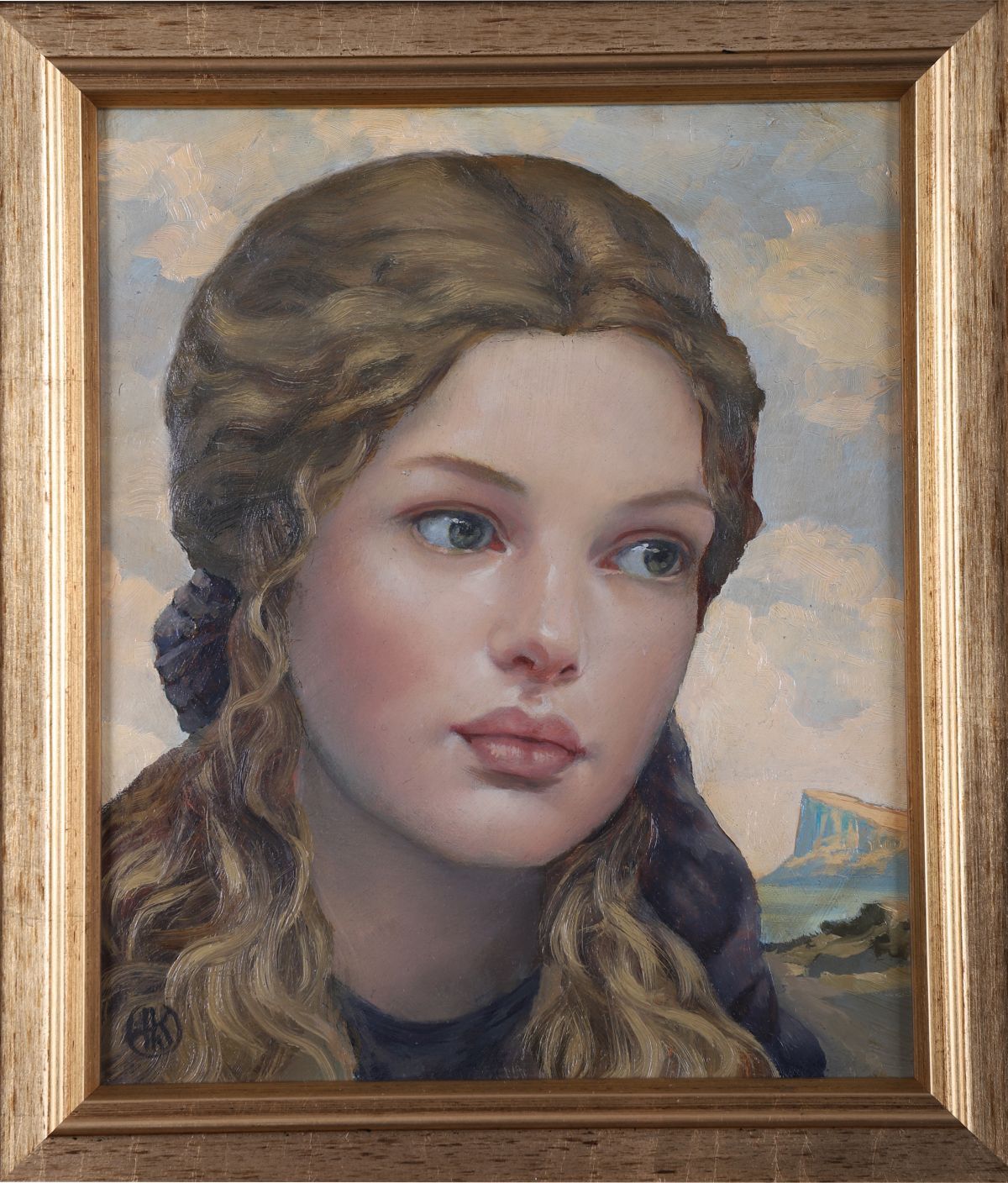 A finely rendered oil on board by Ken Hamilton depicting the serene head and shoulders of a young woman set against a coastal backdrop. The artist’s meticulous technique, smooth modelling, and luminous skin tones exemplify his classical approach inspired by Renaissance and Baroque traditions. Signed lower left with artist’s monogram. Presented in a gilt-edged frame.