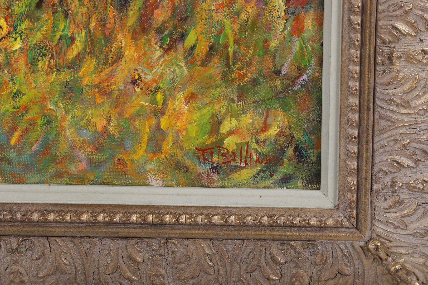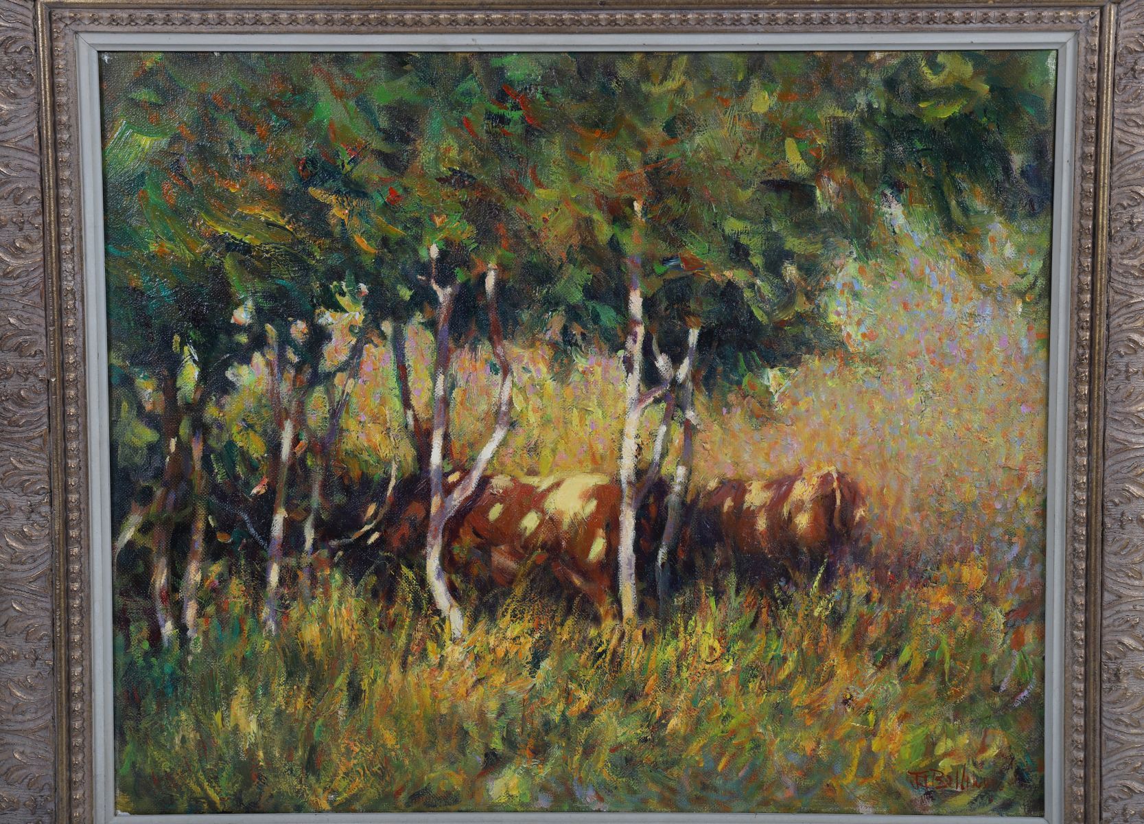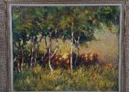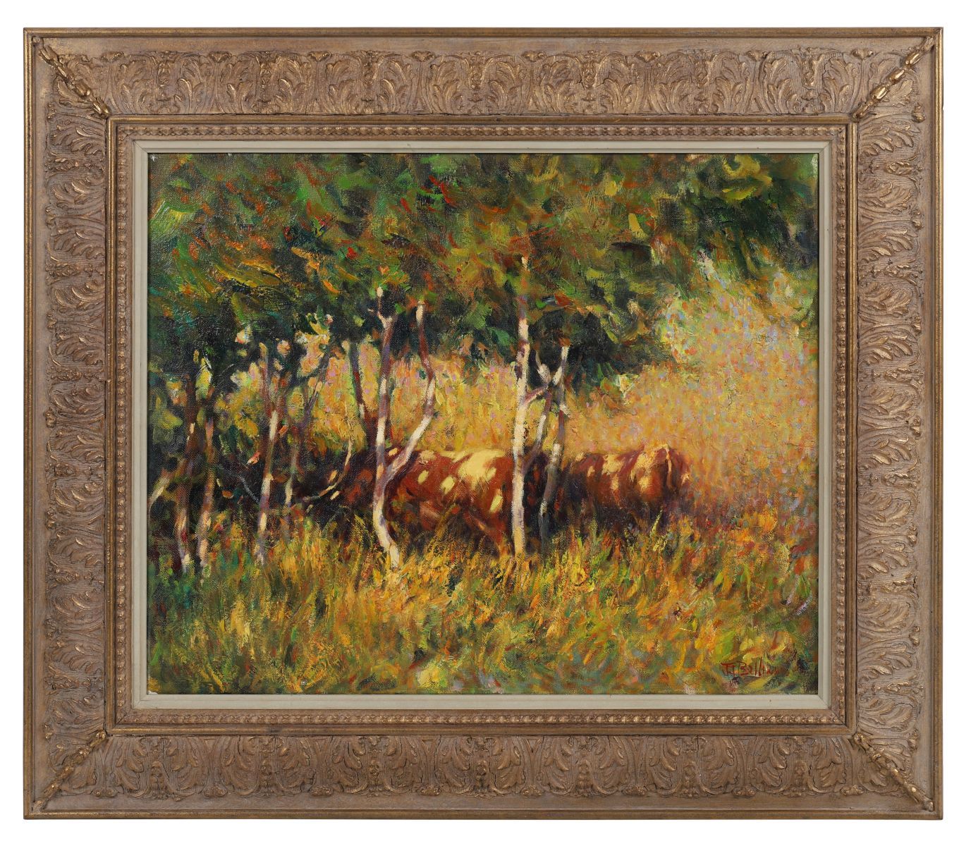 An atmospheric oil on canvas depicting cattle resting within a dappled woodland clearing. Hamilton employs controlled yet expressive brushwork, combining warm golden light with layered shadow to create depth and naturalistic texture. A strong and characteristic example of the artist’s landscape style.
