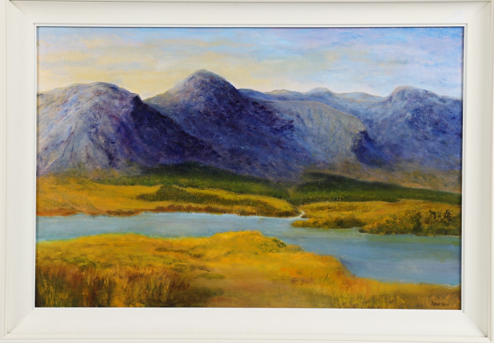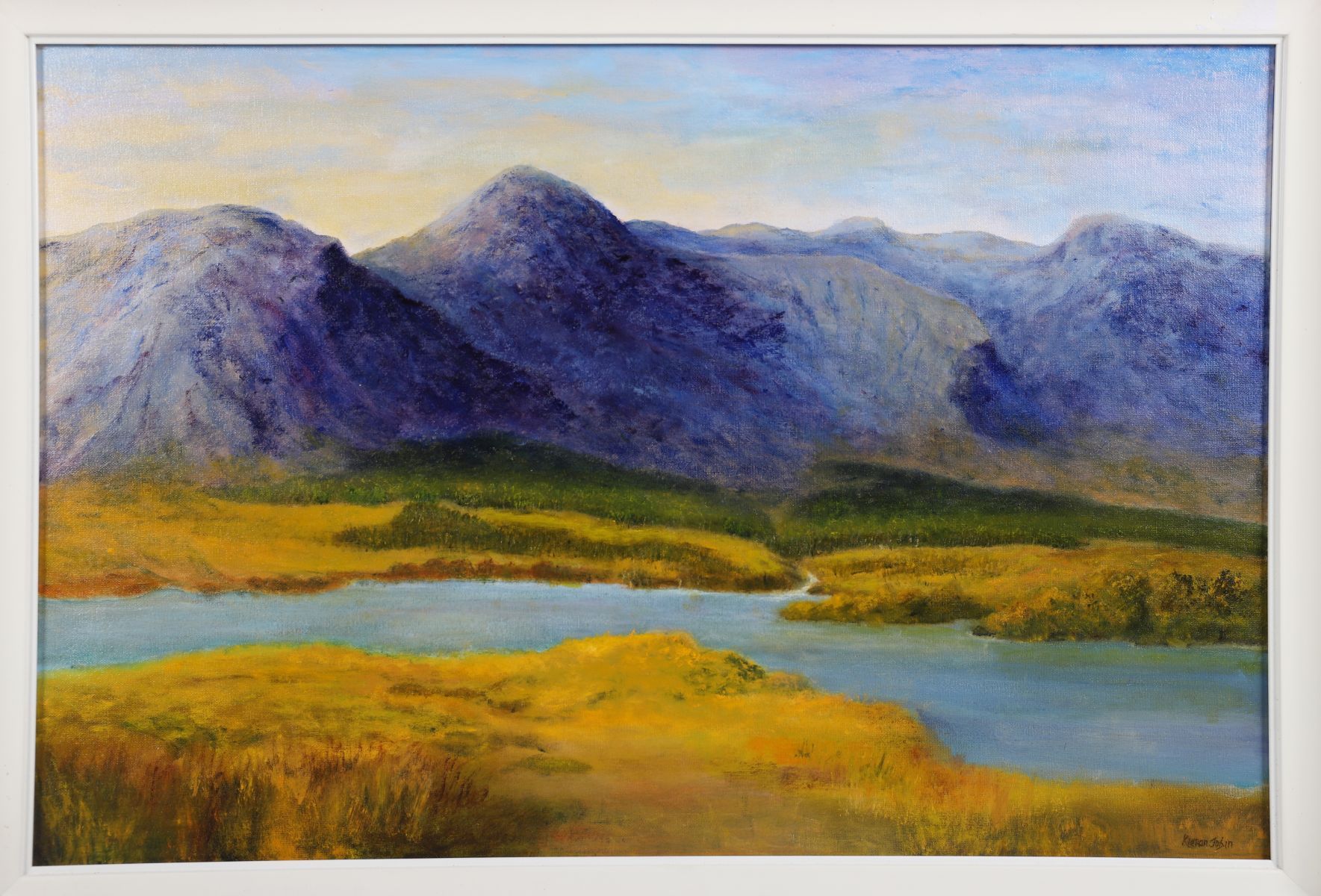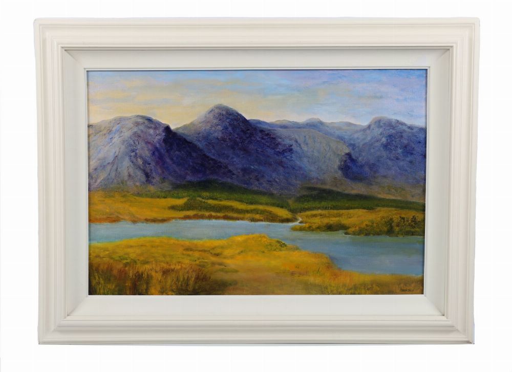 A compelling Connemara vista at first light, defined by Tobin’s rich layering and tonal depth. The mountains rise like silhouettes against a gradually brightening sky, while reeds, bogland, and still water create a harmonious interplay of colour and texture emblematic of Tobin’s landscape style.