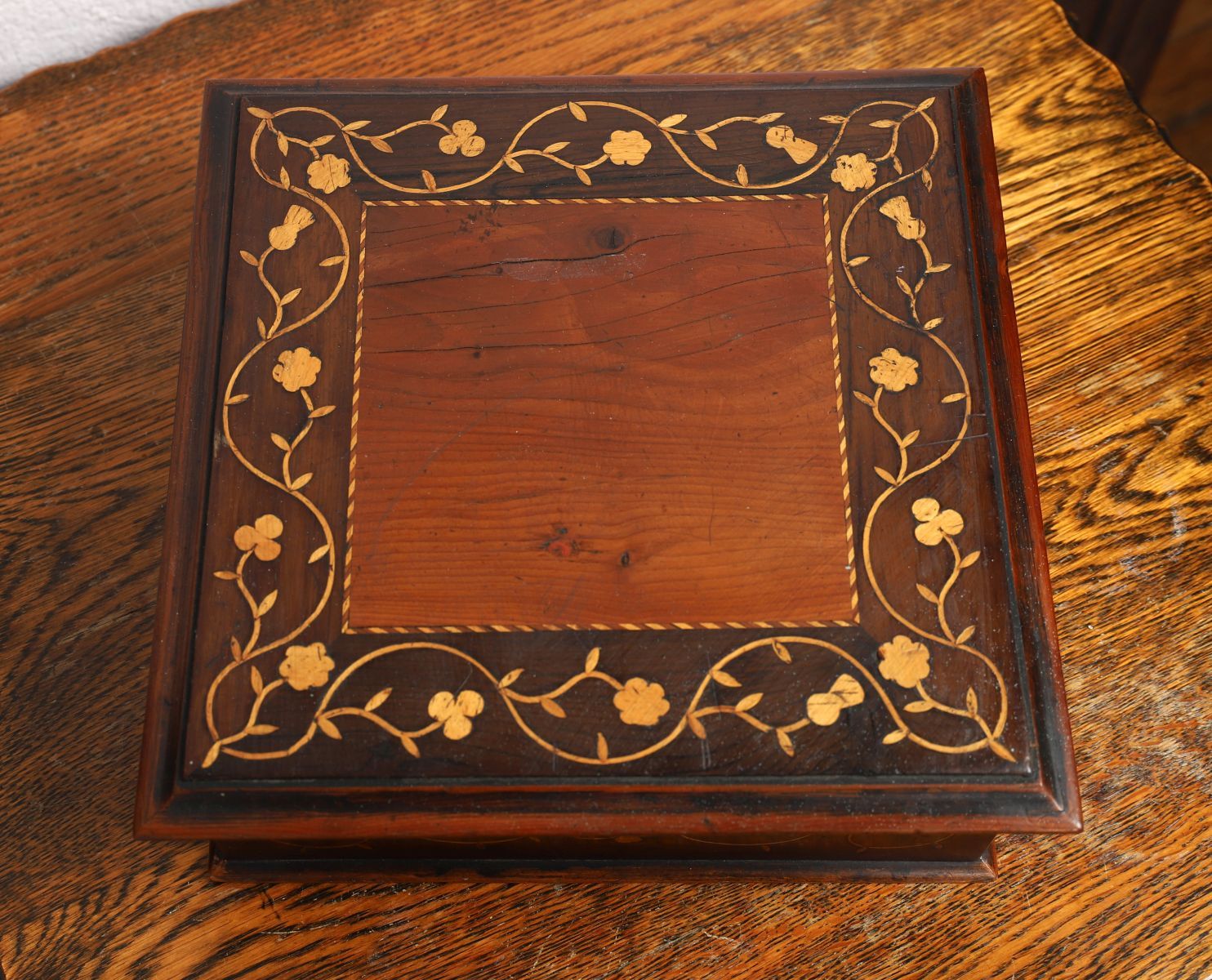 Killarney ware box, the hinged lid and sides inlaid with arbutus and marquetry floral motifs on a yew wood ground, raised on a plinth base. 19th century.