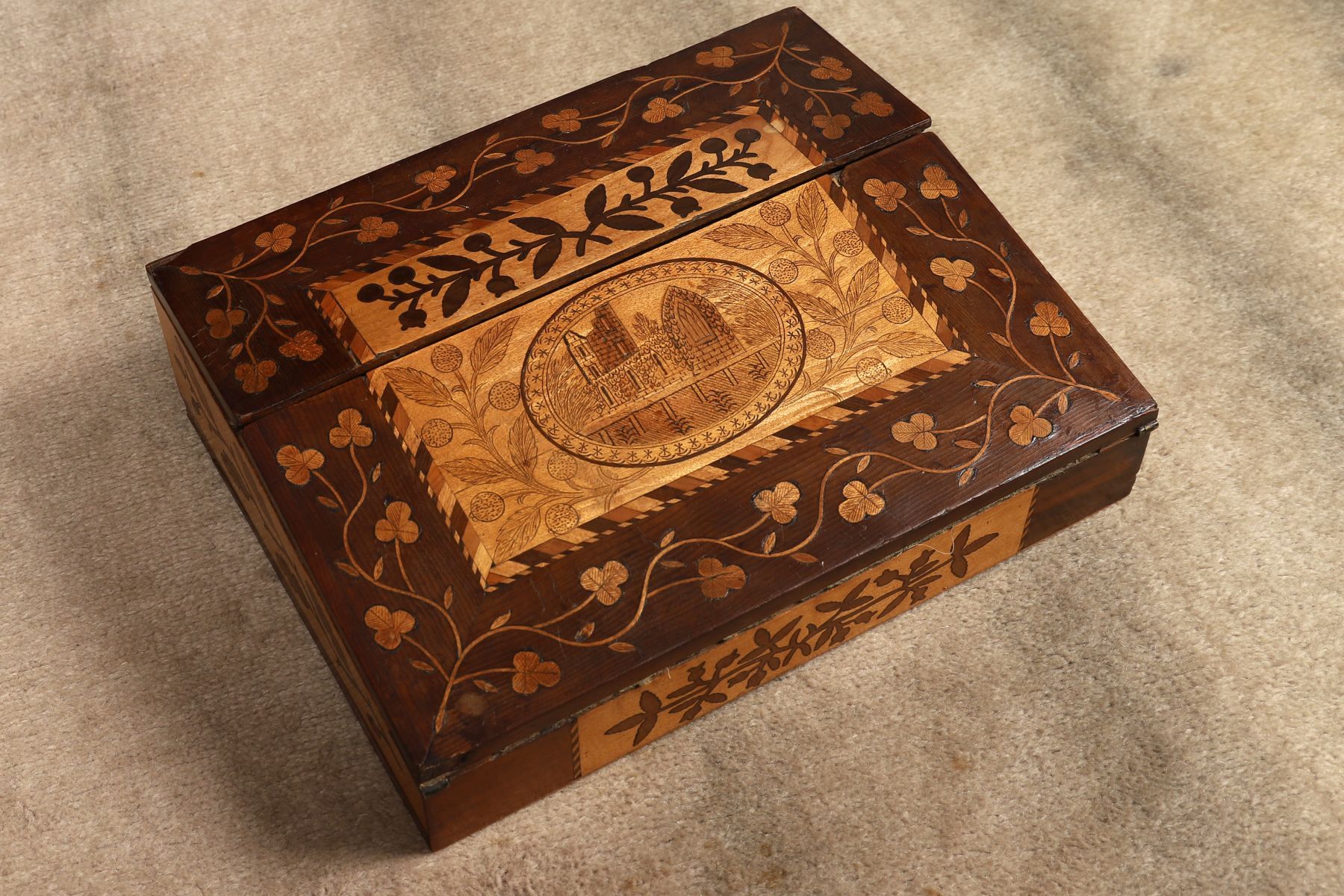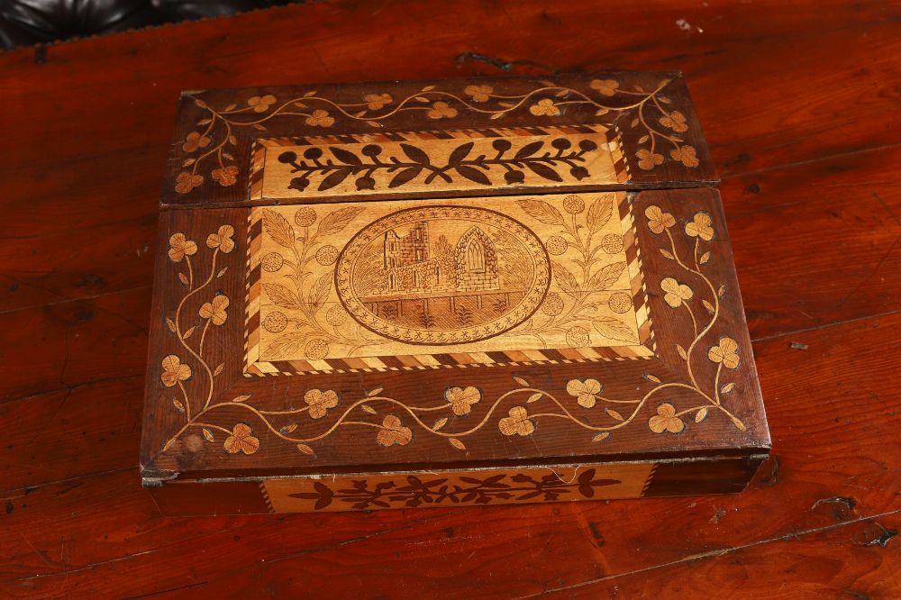 A Killarney yew wood writing slope, inlaid with arbutus and marquetry decoration, the hinged lid centred with an oval panel depicting Muckross Abbey within foliate borders, opening to a fitted interior.