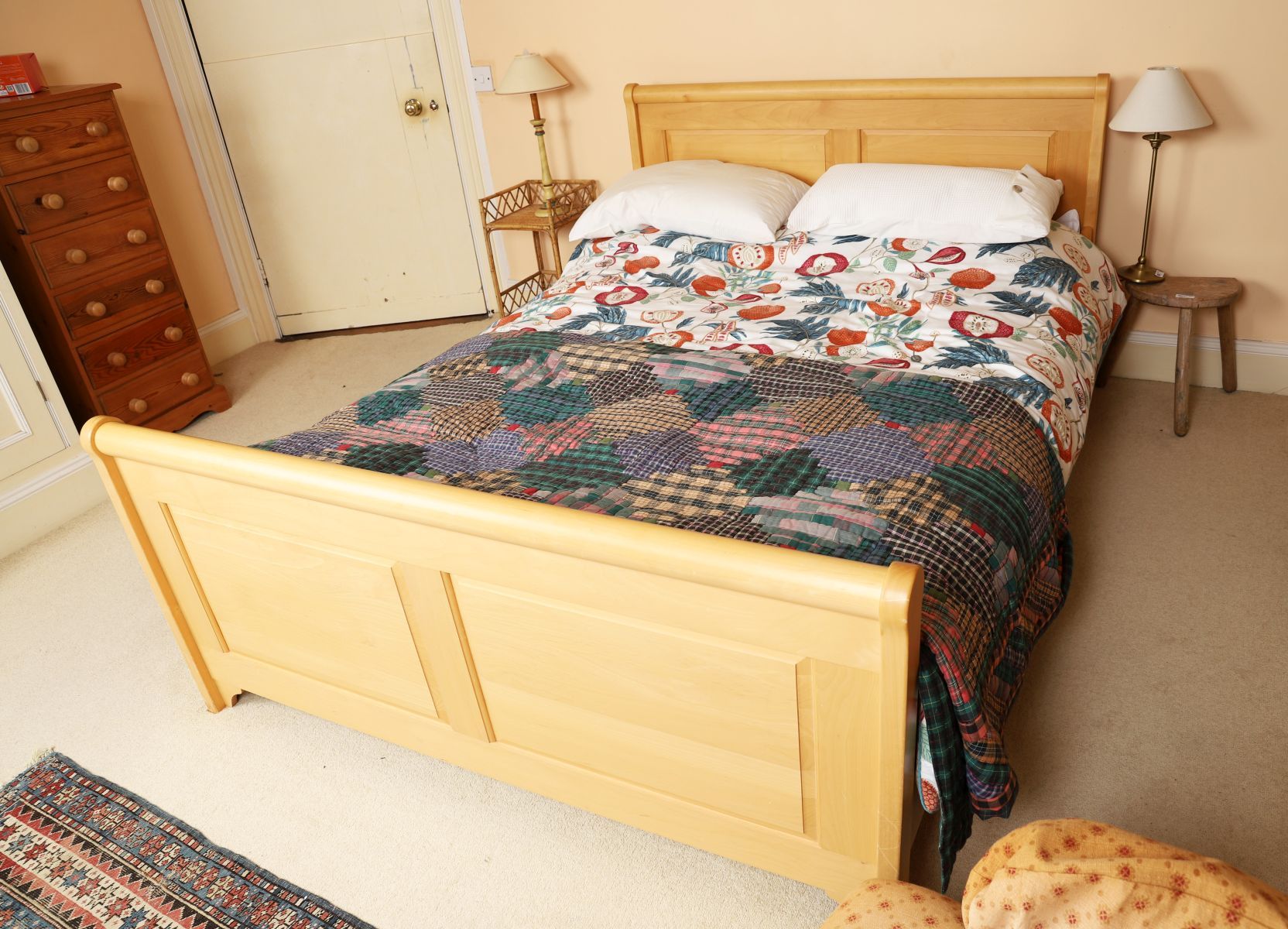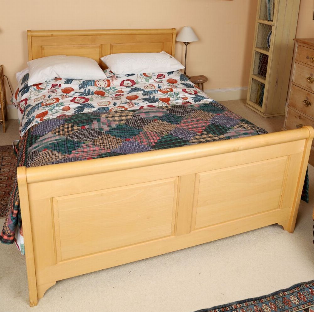 A king size pine bed frame with panelled headboard and matching footboard, of clean-lined design with rounded uprights.