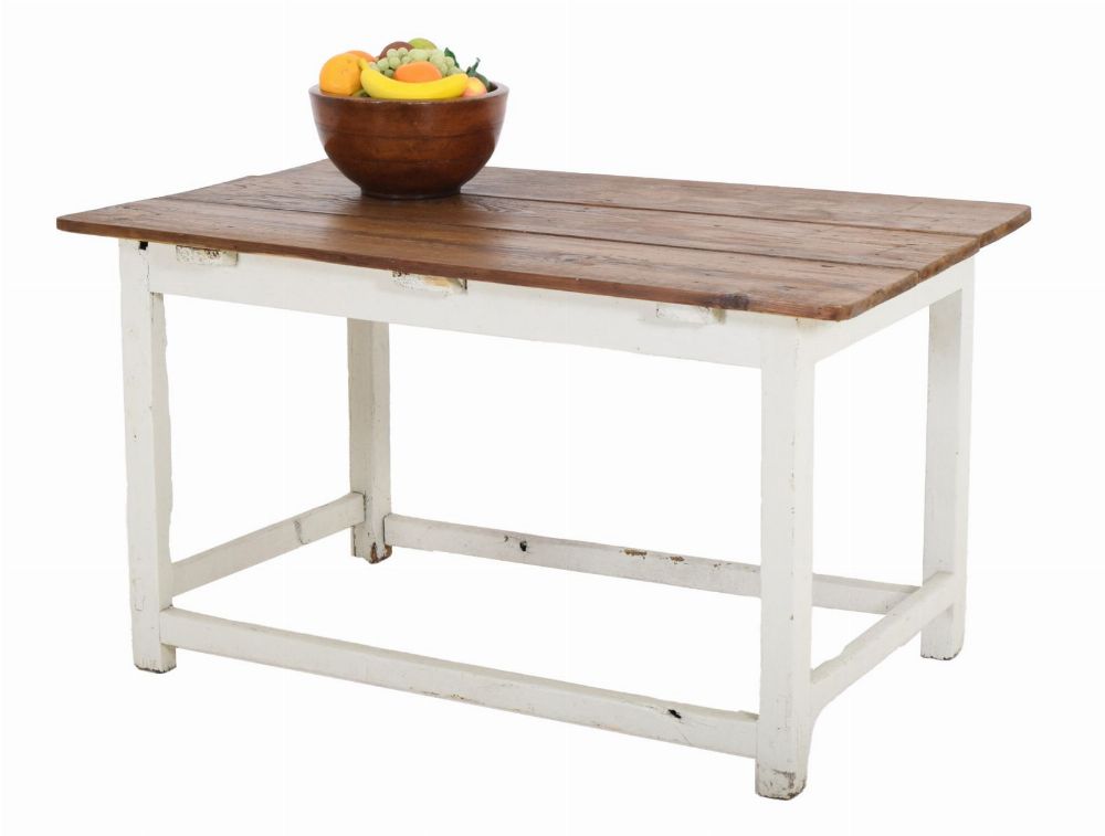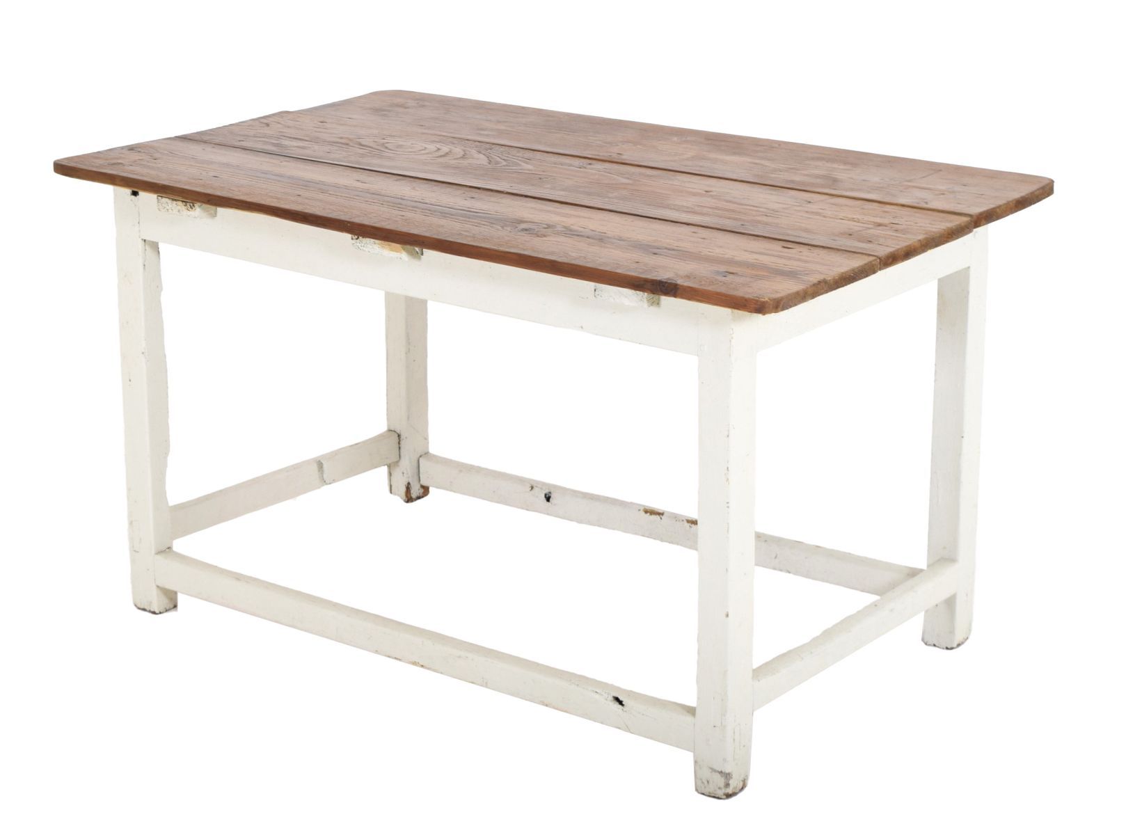 with rectangular top and base in original white paint, raised on square section legs; practical and modestly proportioned.