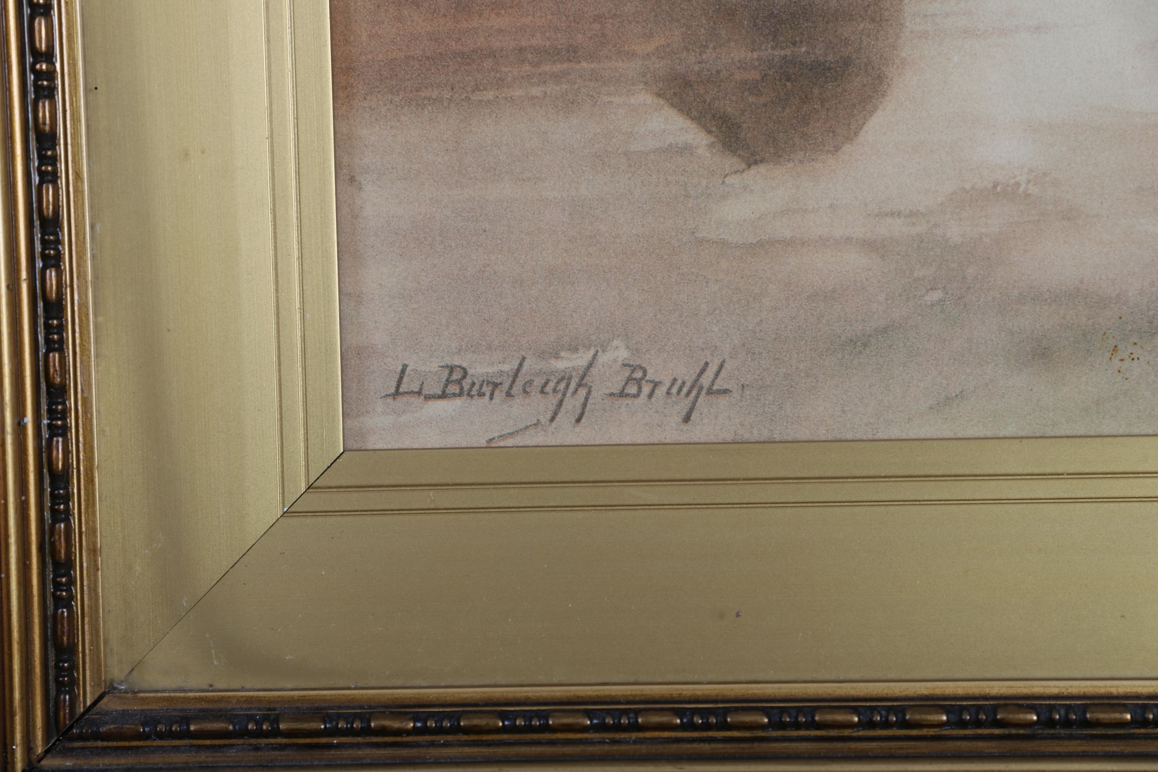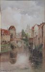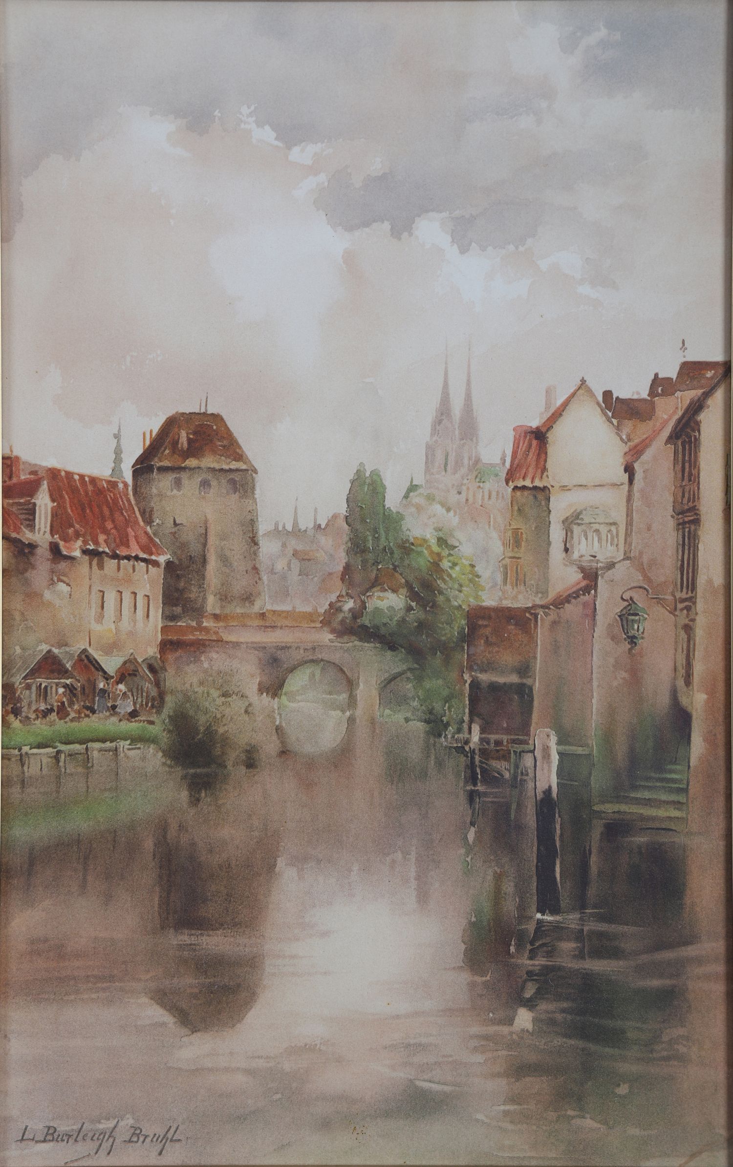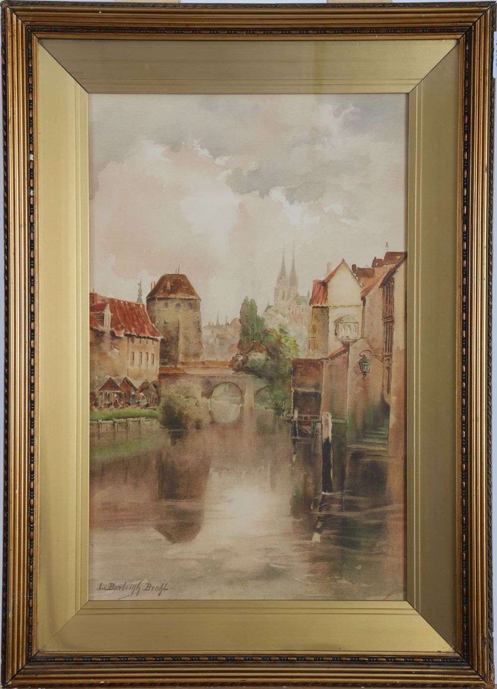 A signed watercolour by L. Burleigh Bruhl depicting a European town with river reflections, bridge, and distant cathedral spires. Mounted and framed. Watercolour.