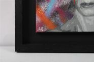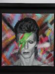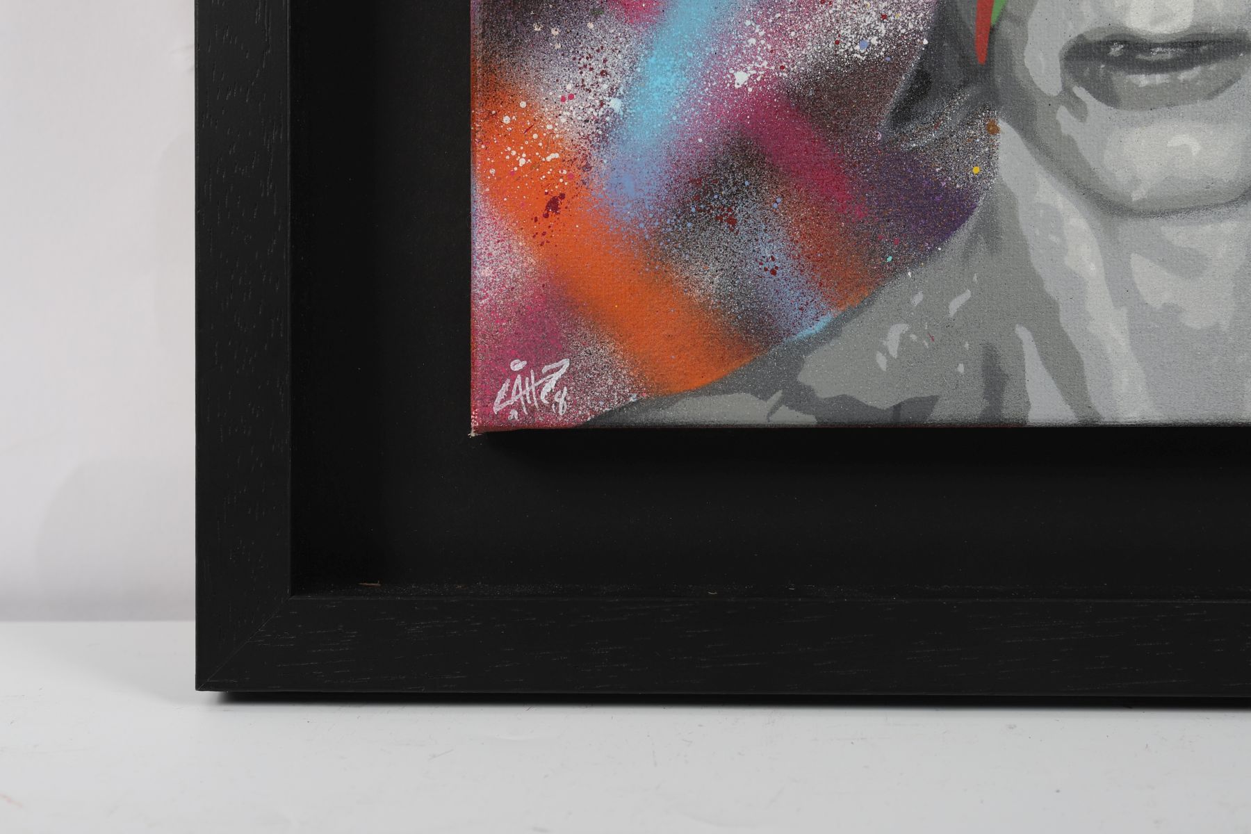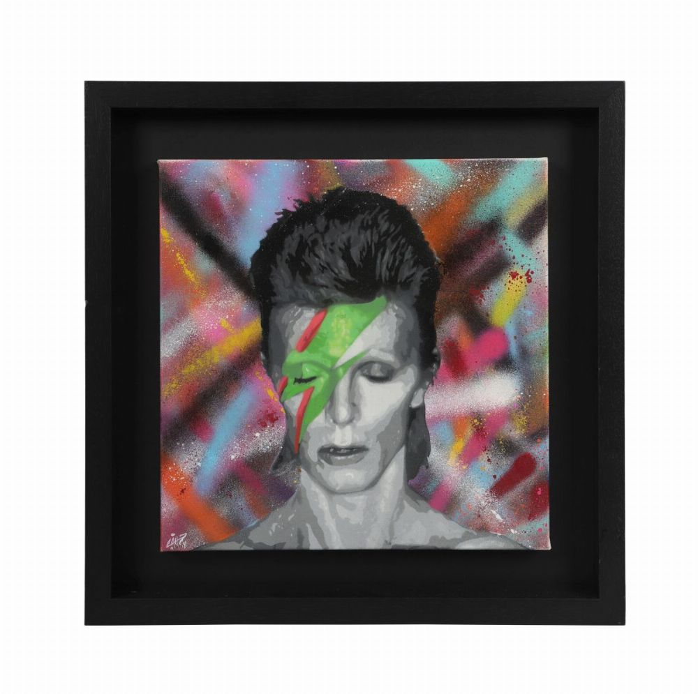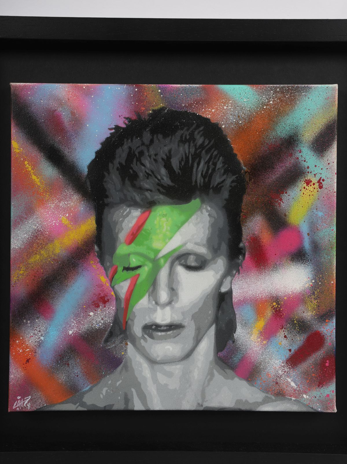 Mixed media, stencil and spray paint on canvas depicting David Bowie in his iconic Ziggy Stardust persona, rendered in monochrome tones with vivid neon highlights. Signed lower left. Framed in a black box frame.