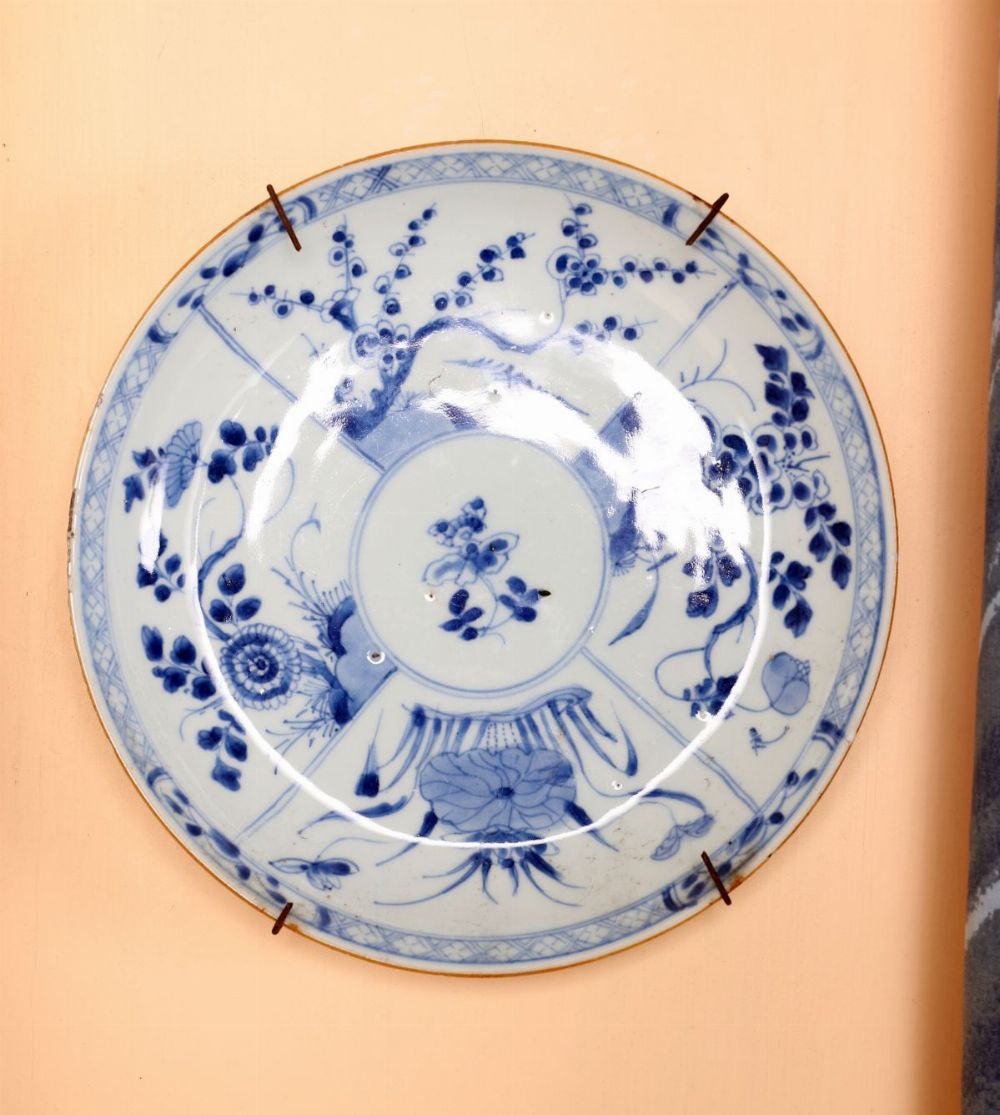 A large Chinese porcelain saucer dish of the 18th century, painted in underglaze blue with radiating panels of flowering branches and scrolling foliage, centred by a floral medallion and enclosed by a patterned border.