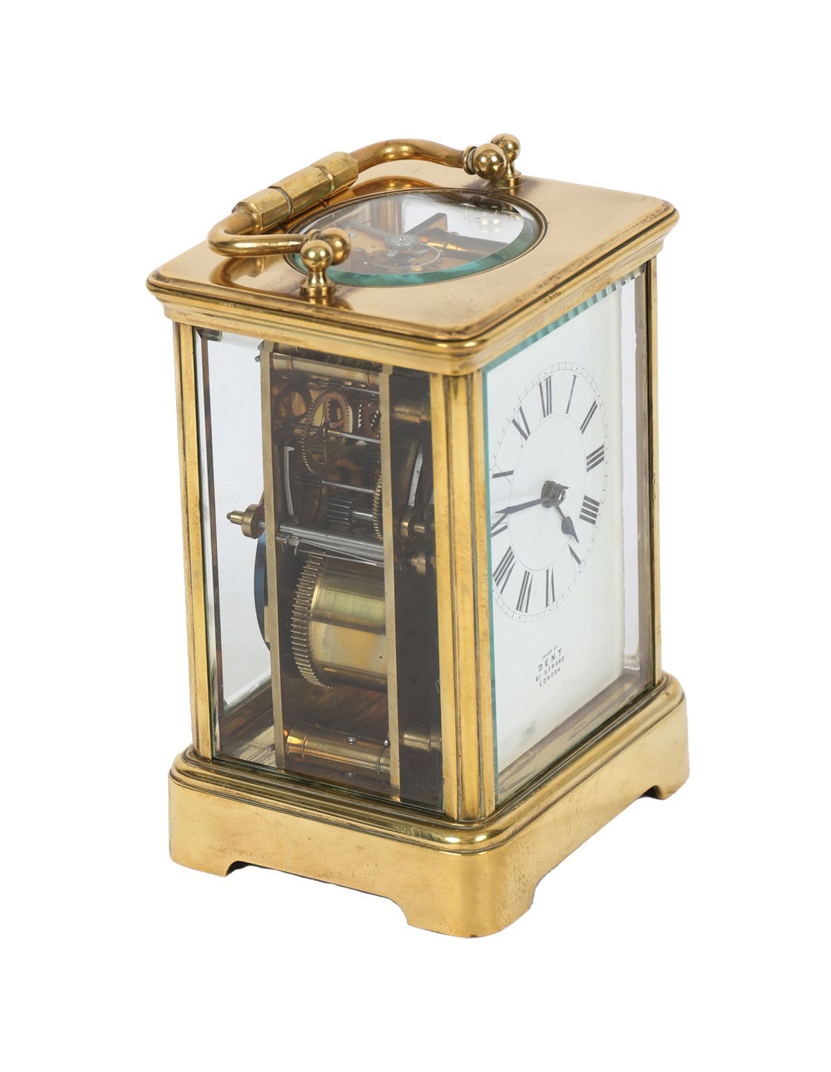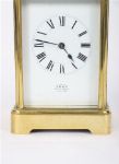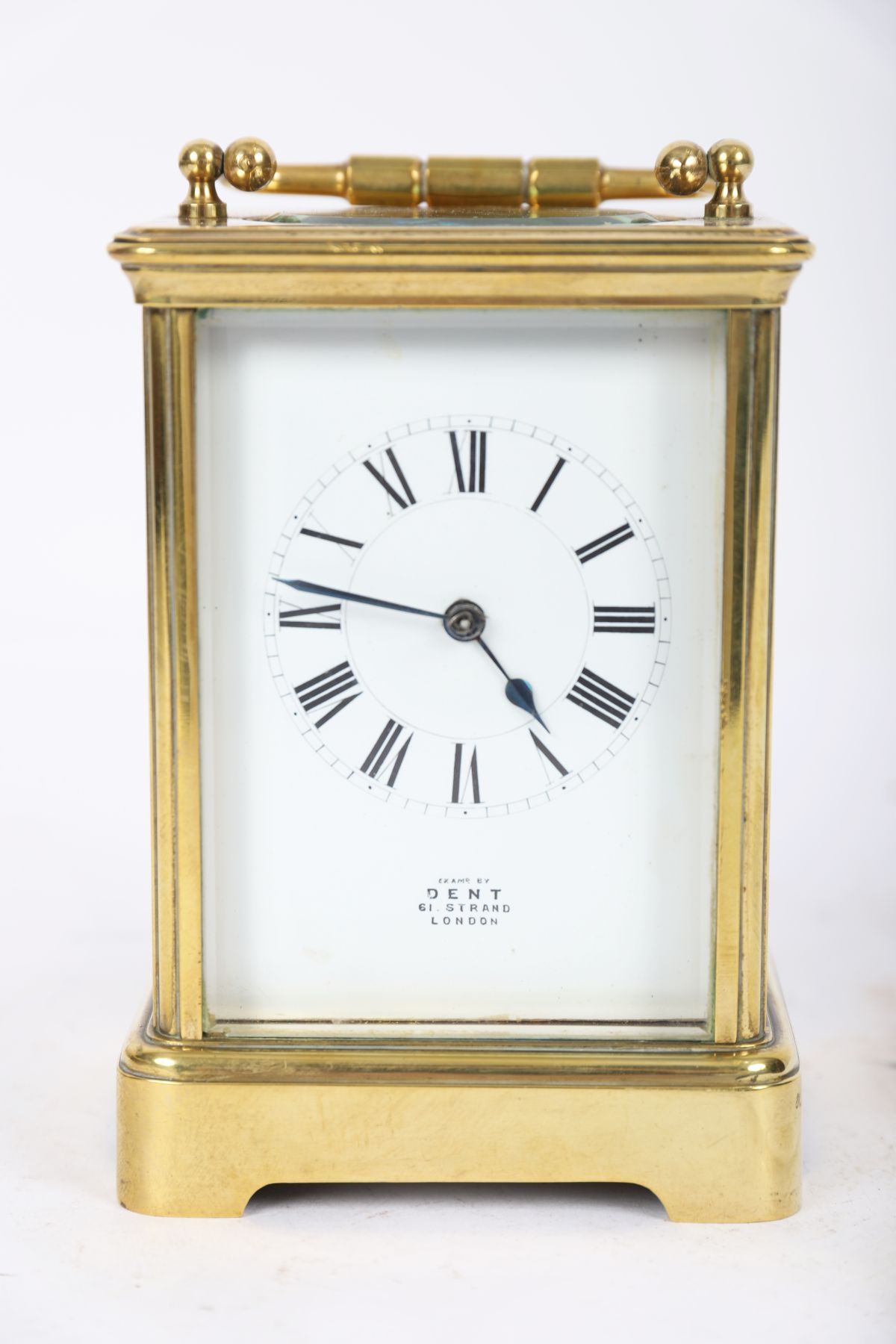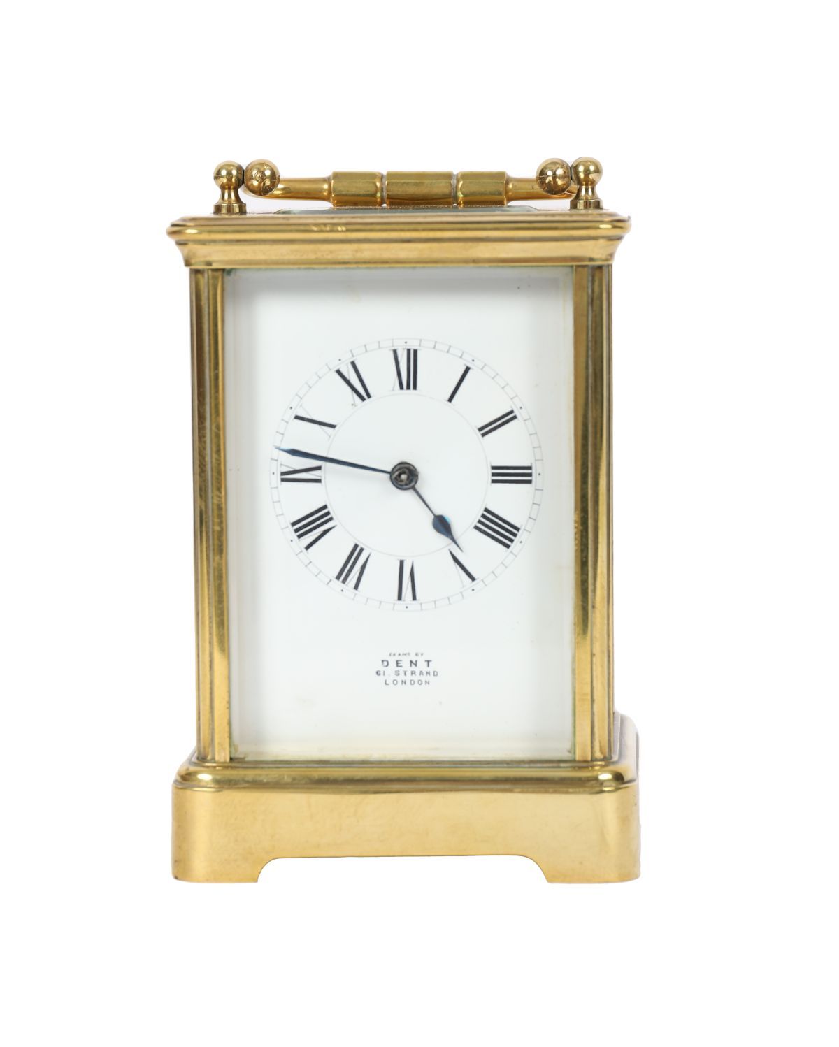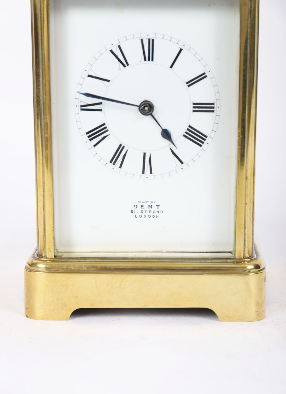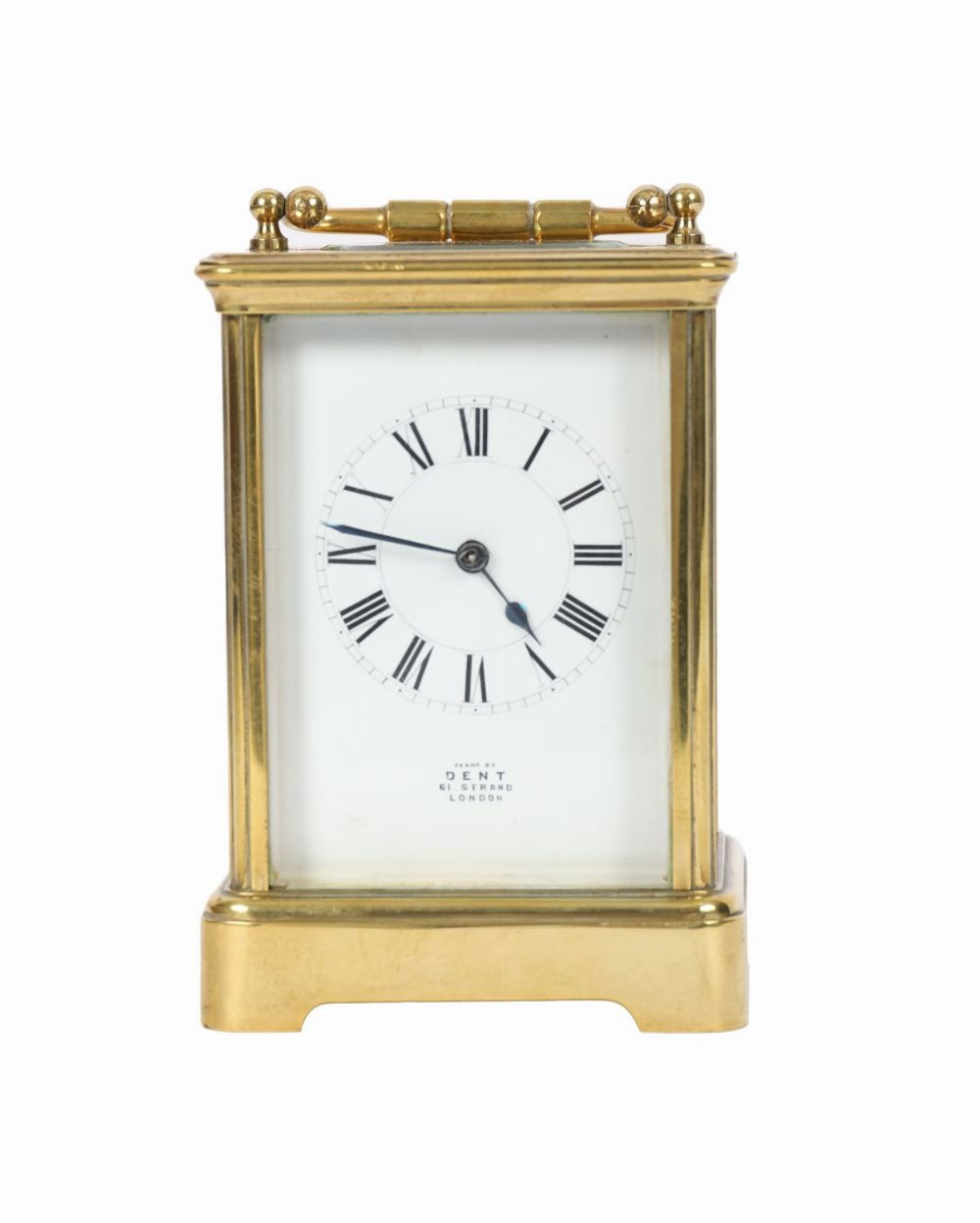 A fine 19th century brass carriage clock by Dent, St. James's, London, with white enamel dial and Roman numerals.