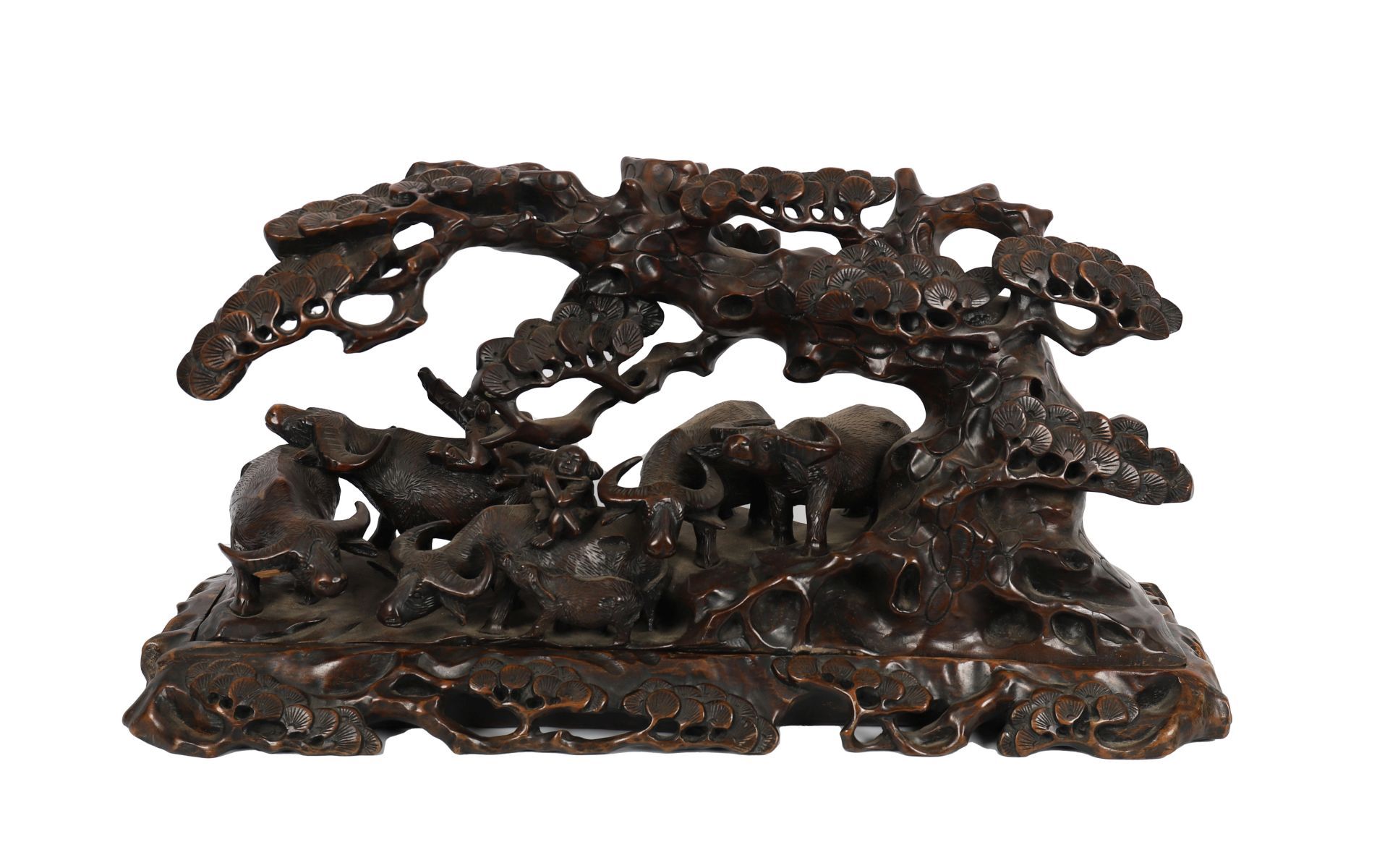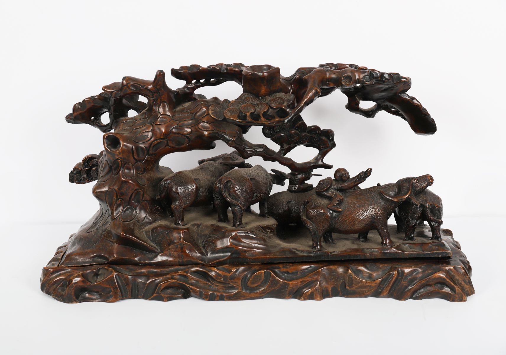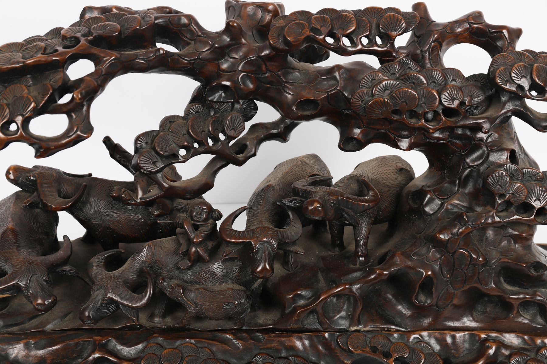 A finely carved Chinese hardwood panel depicting a dynamic landscape with deer beneath pine trees, rocks, and stylised clouds.
