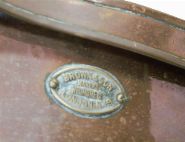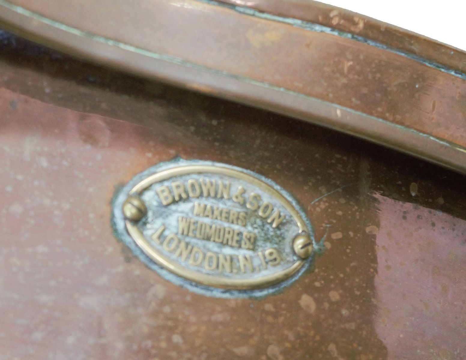 marked Brown & Son, London; of generous proportions, with side handles, mounted on a cast iron stand for fireplace use.