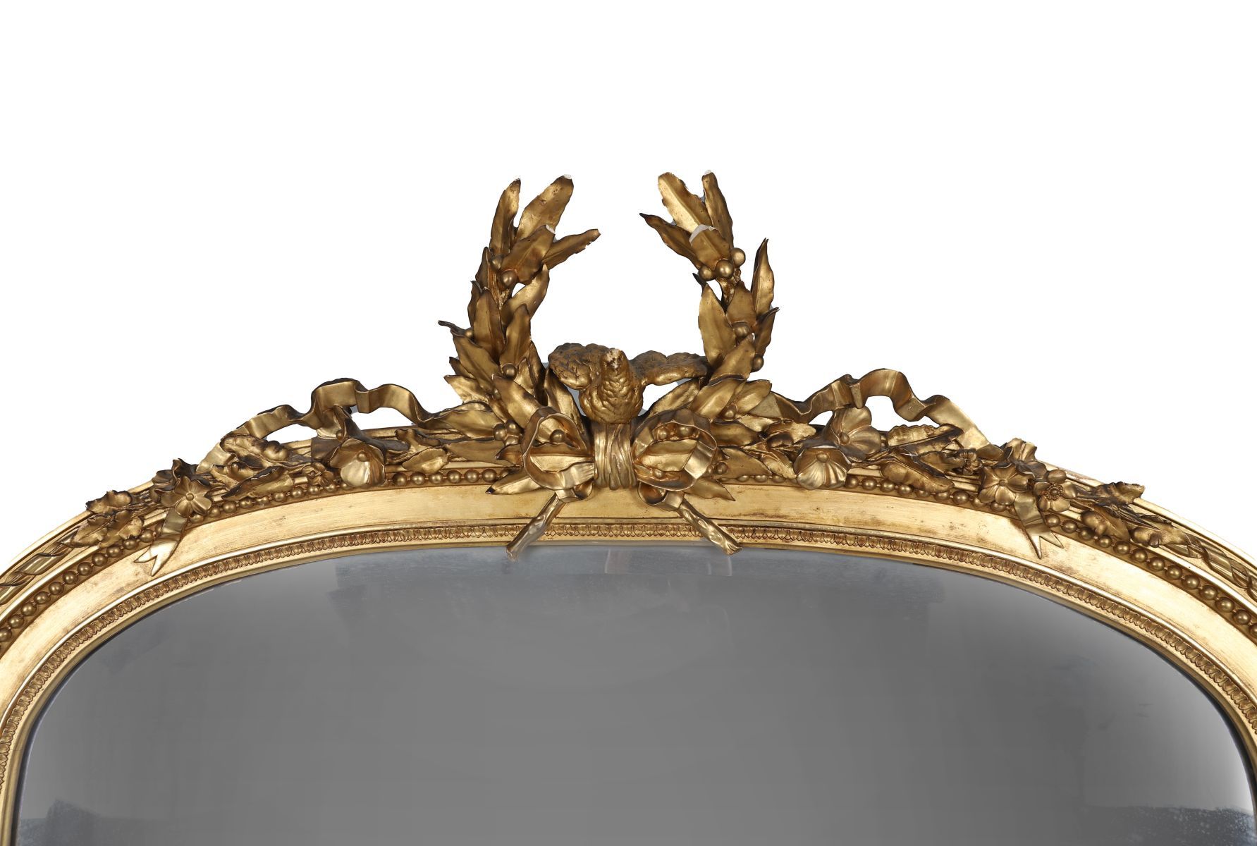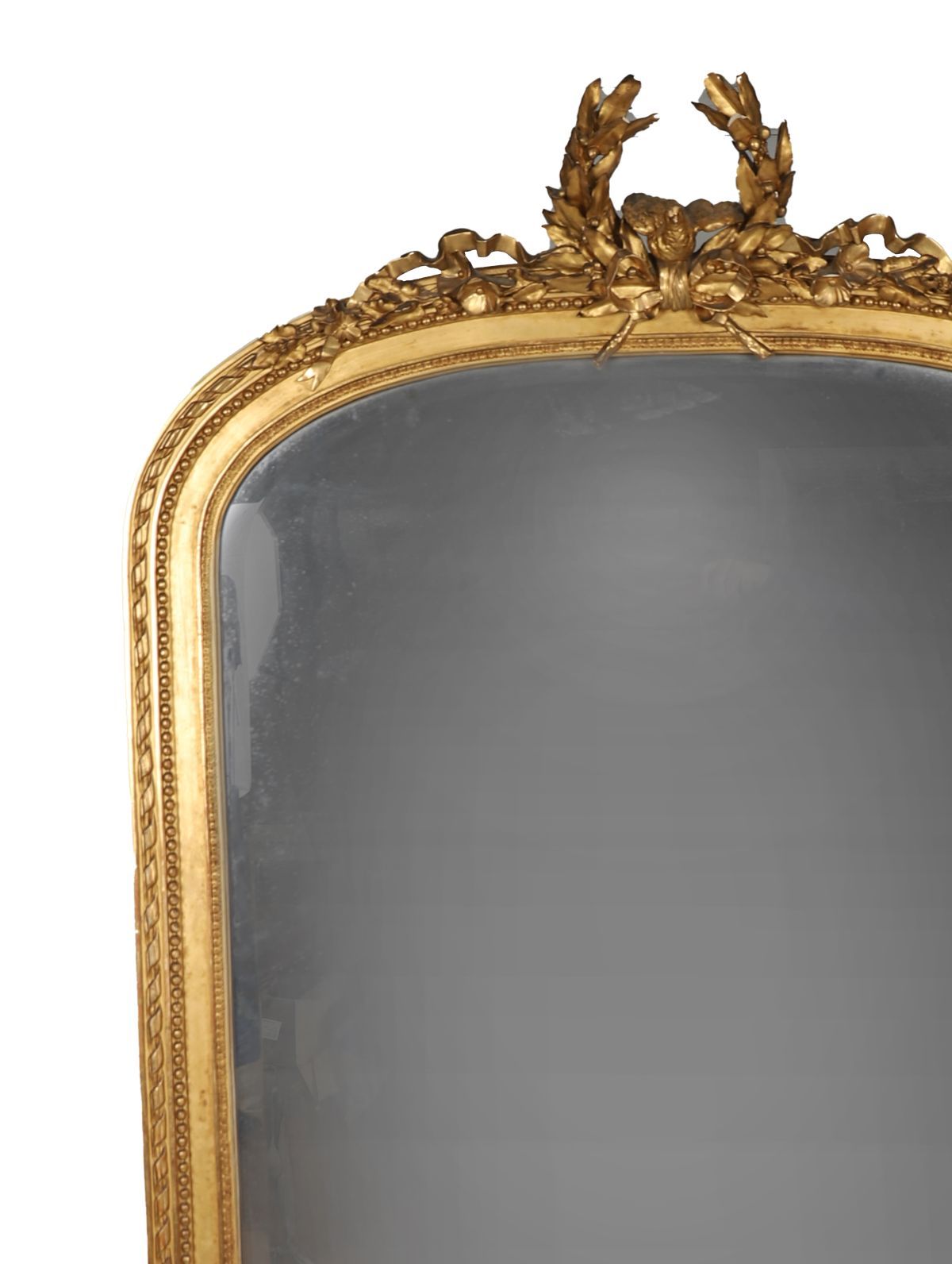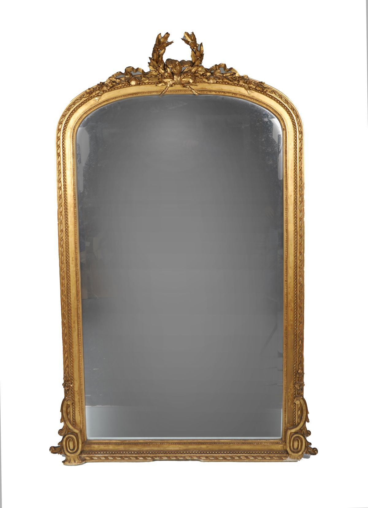 A grand 19th-century French giltwood overmantel mirror of arched form, surmounted by an elaborate cresting of ribbon-tied laurel swags and doves, the frame carved with beaded and moulded detail throughout.