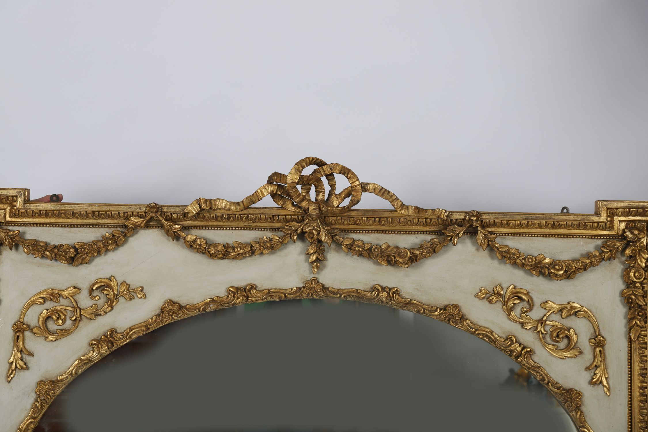 A grand 19th-century overmantel mirror, the expansive oval plate enclosed within a richly carved gilt frame. The outer break-sided frame is moulded with egg-and-dart detail, stepped in profile, and painted in a soft cream tone. The surround is adorned with scrolling acanthus, floral swags, and beaded borders — all surmounted by a ribbon bow and floral swag pediment.